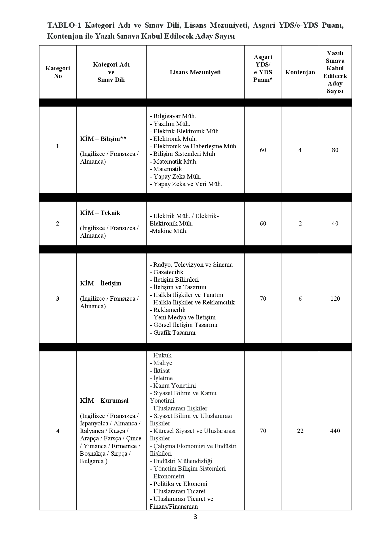 3. Tüm kategorilerde yapılacak başvurularda lisans mezuniyet şartını yurtdışındaki yabancı üniversitelerde karşılayan adaylar için: Tablo-1'de belirtilen yabancı dillerde YDS/e-YDS veya ÖSYM'nin eşdeğerlik dokümanında yer alan yabancı dil sınavlarına ilişkin sonuç belgesi bulunmayan adaylar, diploma denkliği YÖK tarafından onaylanmış olmak kaydıyla, lisans eğitimi alınan yabancı ülkenin resmi dilinde veya resmi dili bulunmayan yabancı ülkelerde yaygın olarak konuşulan dillerde eğitim veren fakültelerden mezun olmaları halinde ilgili kategorideki sınava başvurabilirler. Söz konusu adaylar sıralamada YDS/e-YDS ve eşdeğer sınav sonucuyla başvuranlardan sonra yer alırlar ve kendi aralarındaki sıralamaları lisans mezuniyet not ortalamalarına göre yapılır.