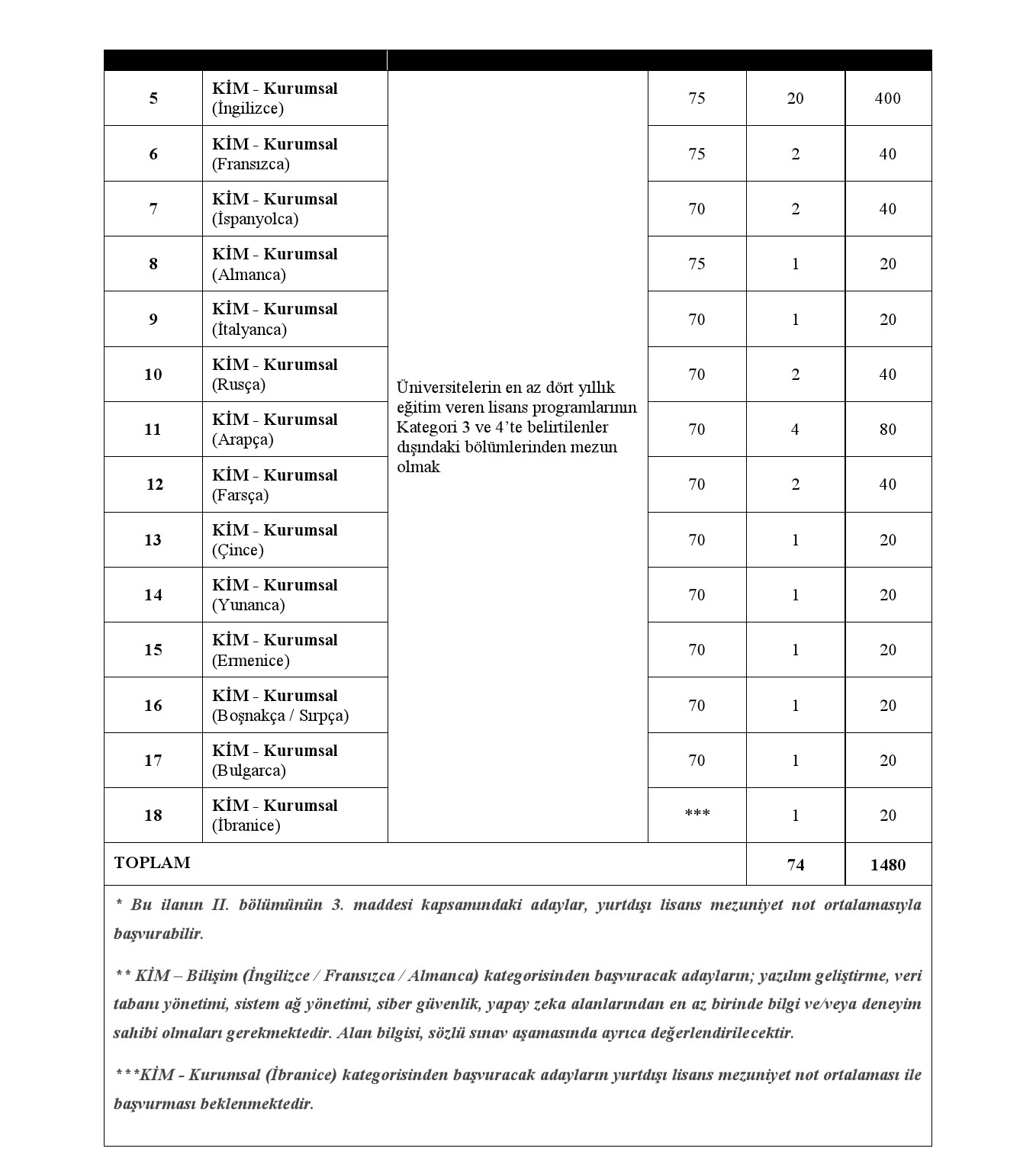 2. Aday Konsolosluk ve İhtisas Memuru ünvanıyla atama yapılabilecek azami kadro sayısı 74'tür. Giriş sınavını kazananların atamaları, varsa müktesep maaş dereceleri de göz önünde bulundurularak, genel idare hizmetleri sınıfından 7 ila 9. derece kadrolara yapılabilecektir.
