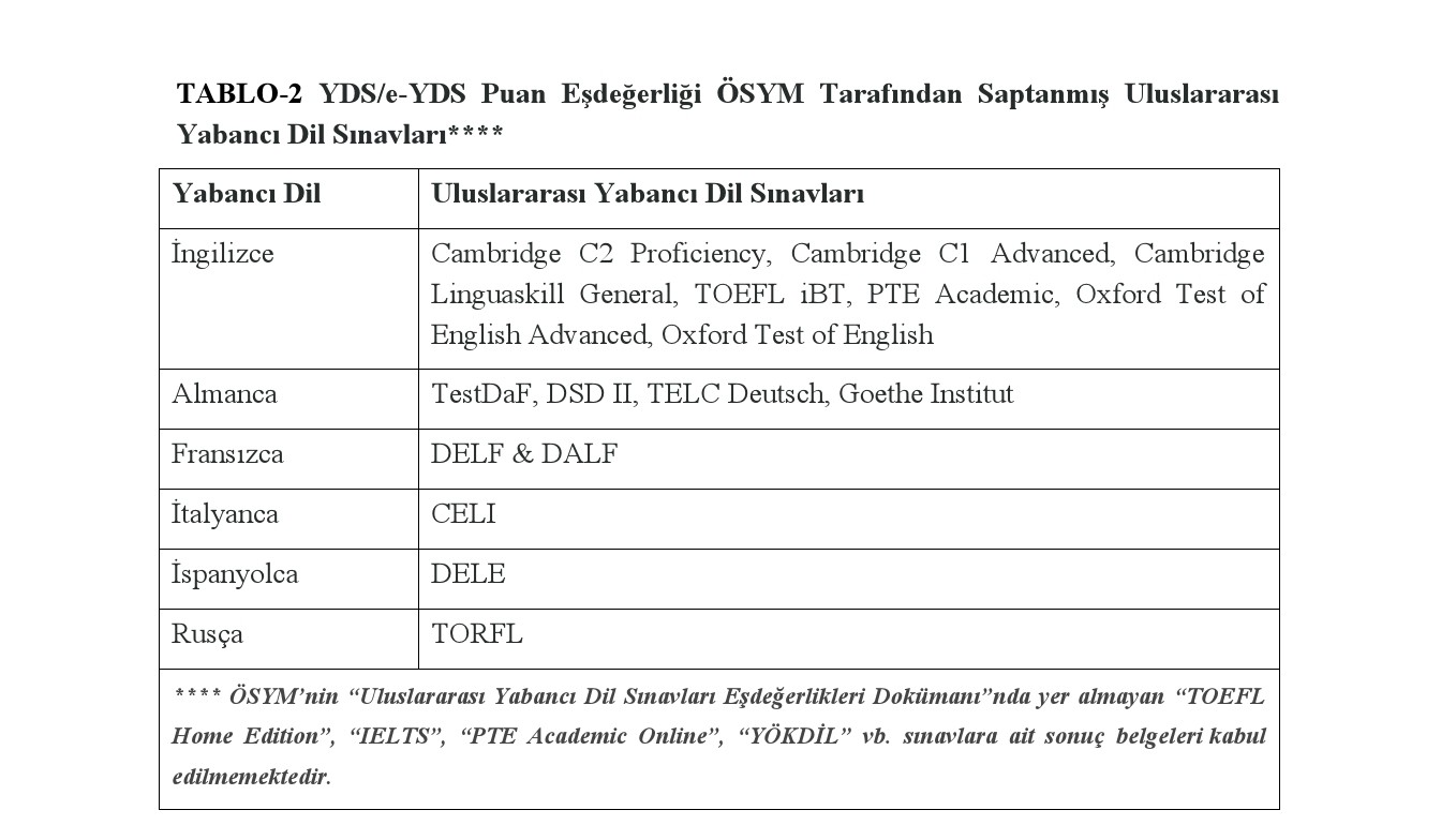 - Bu ilanın II. bölümünün 3. maddesinde kayıtlı şartları taşıyan, yurtdışındaki yabancı üniversitelerden lisans mezunu olup Tablo-1'de kayıtlı yabancı dillerde YDS/e-YDS veya puan eşdeğerliği ÖSYM tarafından saptanmış yabancı dil sınavlarına ilişkin sonuç belgesi bulunmayan adaylar için: Sınava girmek istediği yabancı dilin resmi dil olduğu (veya resmi dili bulunmayan ülkelerde yaygın dil olarak konuşulduğu) ülkelerde lisans eğitimini sınava girmek istediği dilde aldığını gösteren üniversiteden alınmış yazı ve lisans düzeyinde mezuniyet not ortalamasını gösterir belge