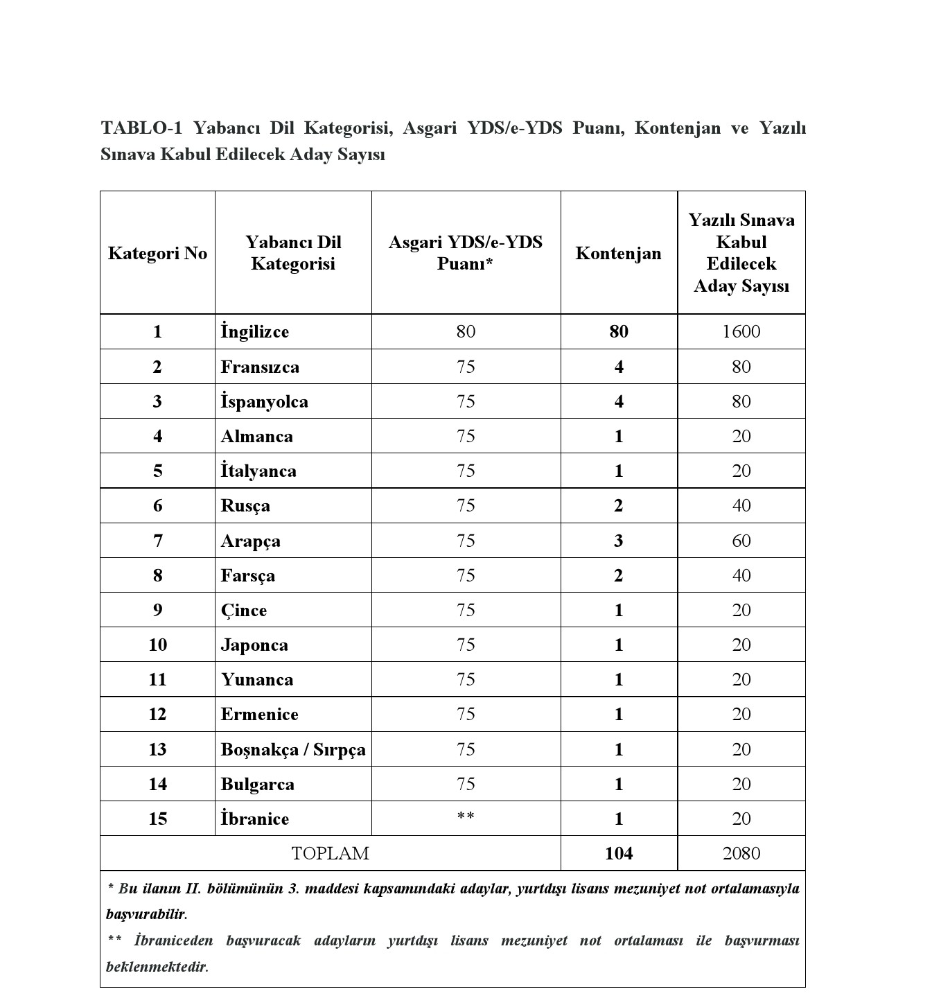 3. Tüm kategorilerde yapılacak başvurular ve bu ilanın II. bölümünün 1. maddesinin c) fıkrasında belirtilen lisans mezuniyeti şartını yurtdışındaki yabancı üniversitelerde karşılayan adaylar için: Tablo-1'de belirtilen yabancı dillerde YDS/e-YDS veya ÖSYM'nin eşdeğerlik dokümanında yer alan yabancı dil sınavlarına ilişkin sonuç belgesi bulunmayan adaylar, diploma denkliği YÖK tarafından onaylanmış olmak kaydıyla, lisans eğitimi alınan yabancı ülkenin resmi dilinde veya resmi dili bulunmayan yabancı ülkelerde yaygın olarak konuşulan dillerde eğitim veren fakültelerden mezun olmaları halinde ilgili kategorideki sınava başvurabilirler. Söz konusu adaylar sıralamada YDS/e-YDS ve eşdeğer sınav sonucuyla başvuranlardan sonra yer alırlar ve kendi aralarındaki sıralamaları lisans mezuniyet not ortalamalarına göre yapılır.