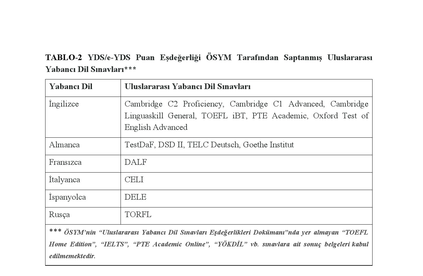 - Bu ilanın II. bölümünün 3. maddesinde kayıtlı şartları taşıyan, yurtdışındaki yabancı üniversitelerden lisans mezunu olup, Tablo-1'de kayıtlı yabancı dillerde YDS/e-YDS veya puan eşdeğerliği ÖSYM tarafından saptanmış yabancı dil sınavlarına ilişkin sonuç belgesi bulunmayan adaylar için: Sınava girmek istediği yabancı dilin resmi dil olduğu (veya resmi dili bulunmayan ülkelerde yaygın dil olarak konuşulduğu) ülkelerde lisans eğitimini sınava girmek istediği dilde aldığını gösteren üniversiteden alınmış yazı ve lisans düzeyinde mezuniyet not ortalamasını gösterir belge