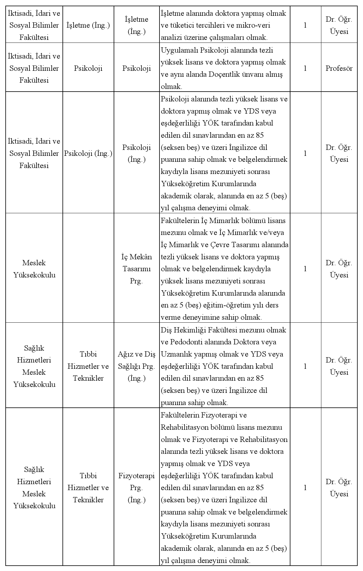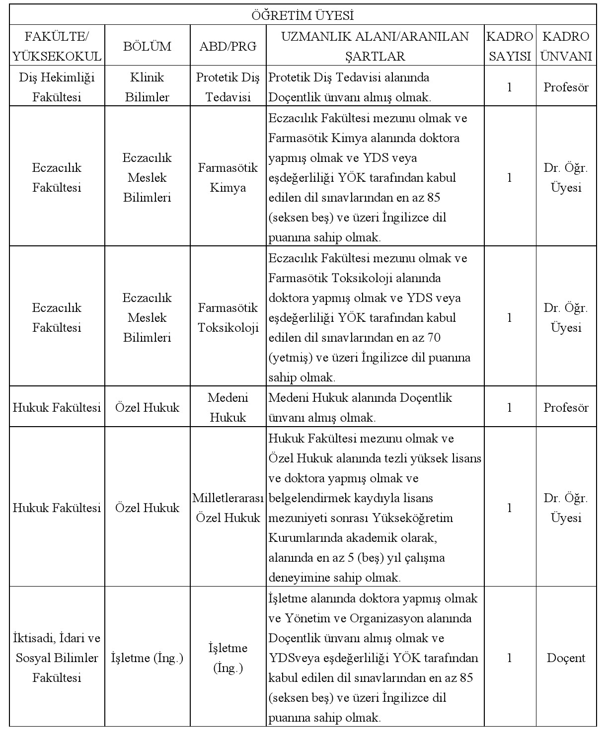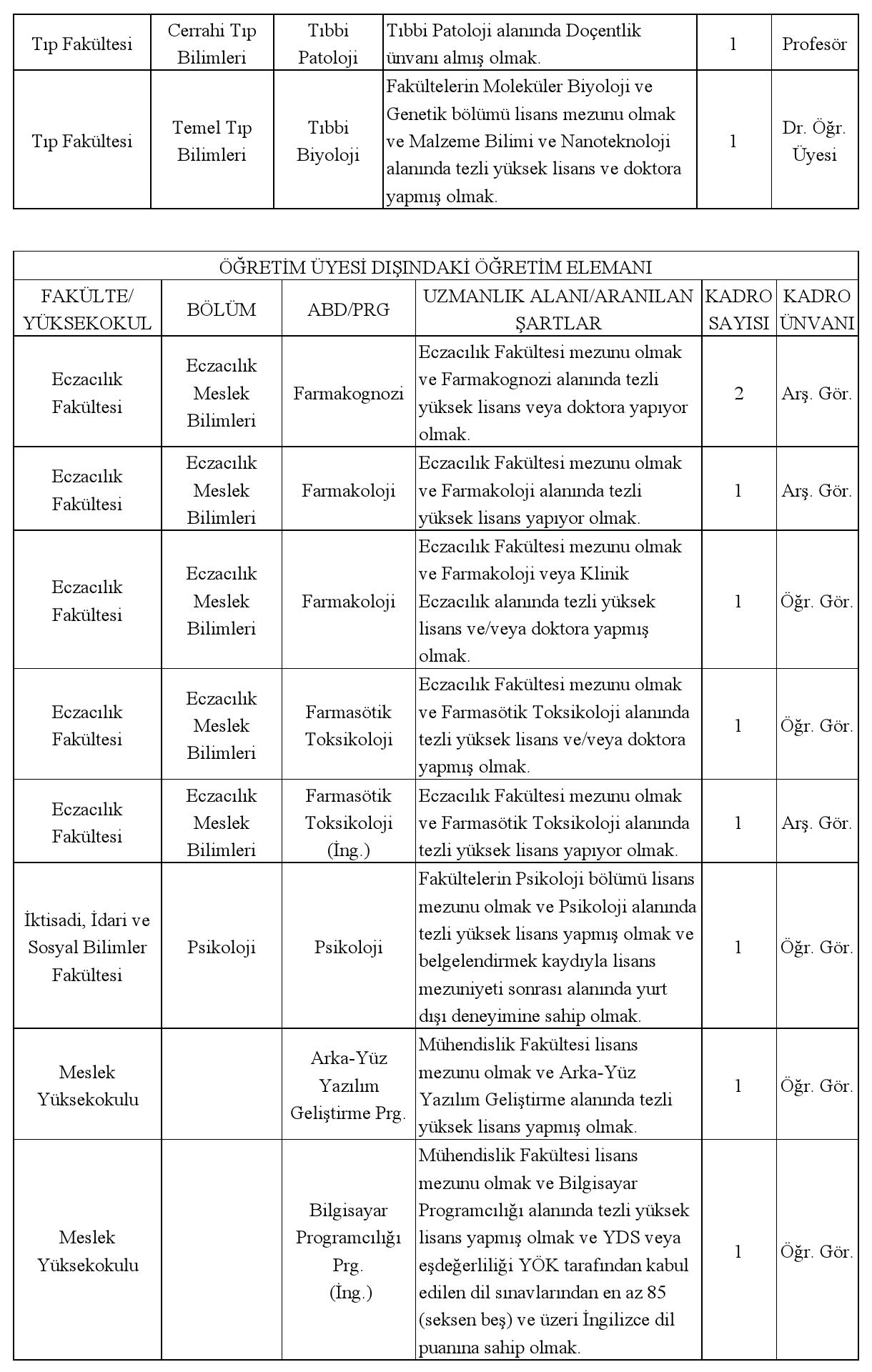 Üniversitemizin aşağıda belirtilen akademik birimlerine; 2547 sayılı Yükseköğretim Kanunu'nun ilgili maddeleri ile Öğretim Üyeliğine Yükseltilme ve Atanma Yönetmeliği'nin ve Öğretim Üyesi Dışındaki Öğretim Elemanı Kadrolarına Yapılacak Atamalarda Uygulanacak Merkezi Sınav ile Giriş Sınavlarına İlişkin Usul ve Esaslar Hakkında Yönetmelik'in yürürlükteki ilgili maddelerine göre "Devamlı statüde" Öğretim Üyesi ve Öğretim Elemanı alınacaktır.