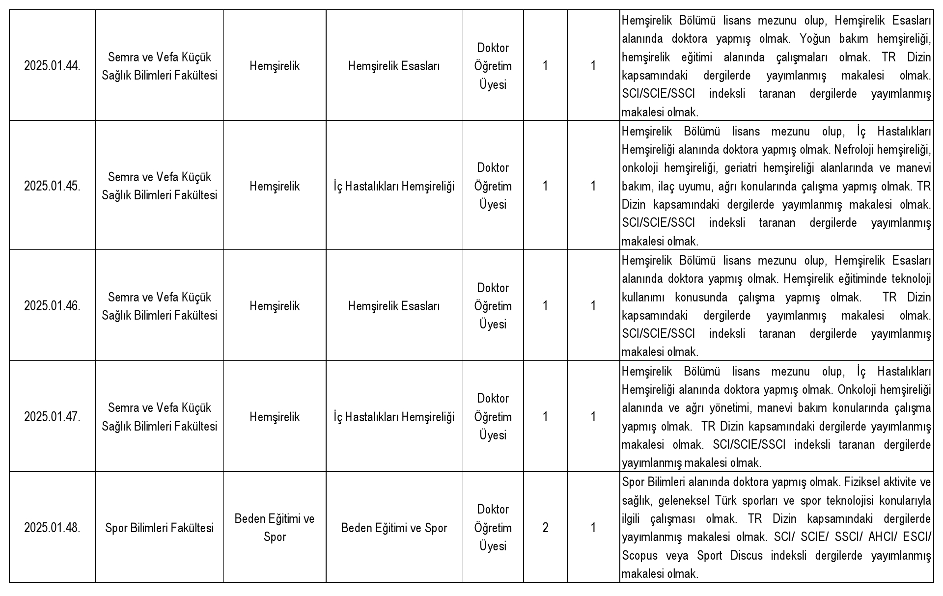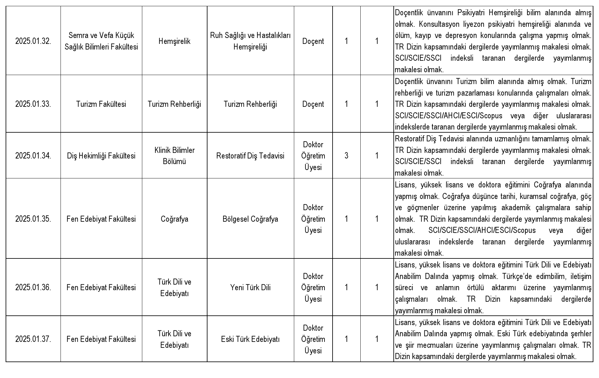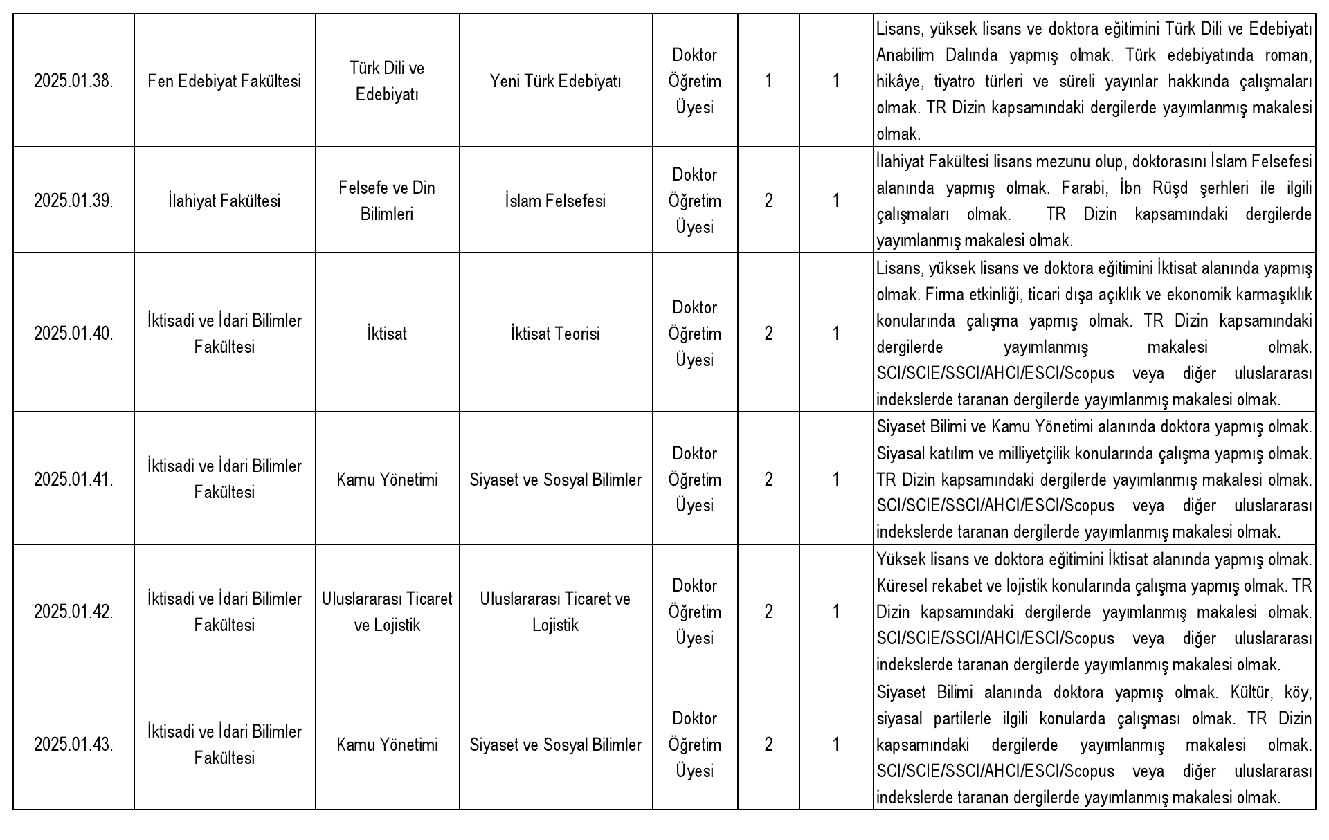 2547 sayılı Kanun'un Ek 38. maddesi uyarınca belirlenen yüzde otuz (%30) kota kapsamında başvuru yapılabilecek doktor öğretim üyesi kadrosu bulunmamaktadır.