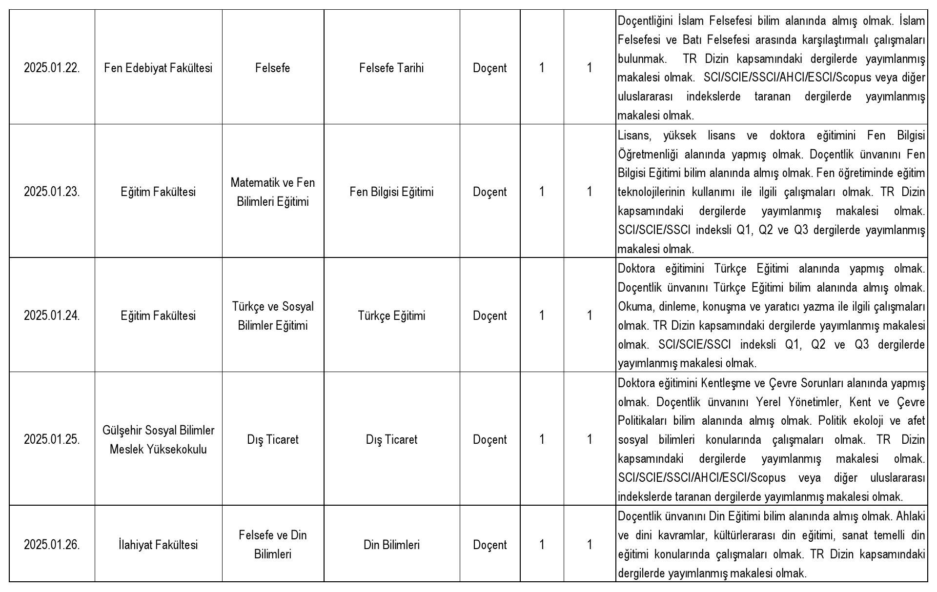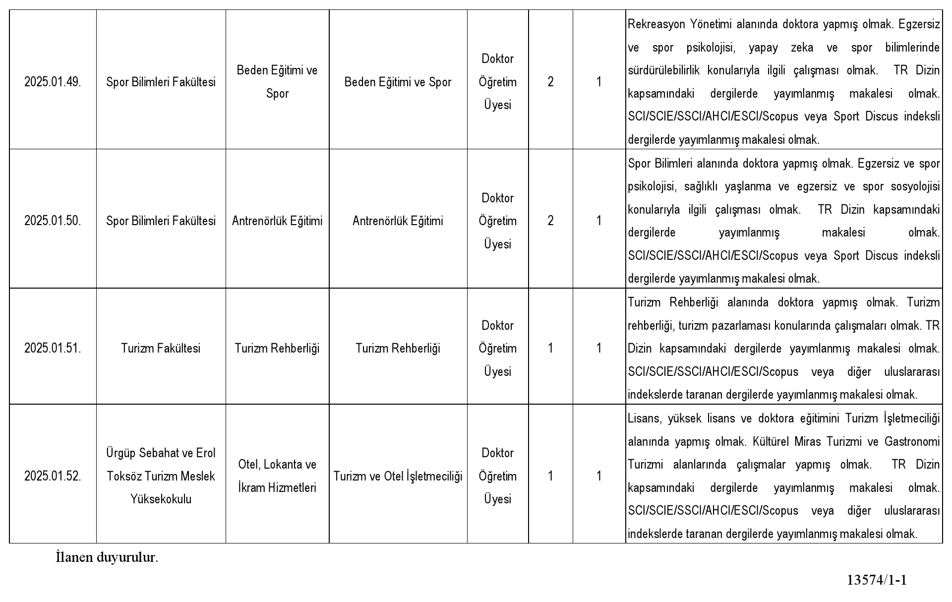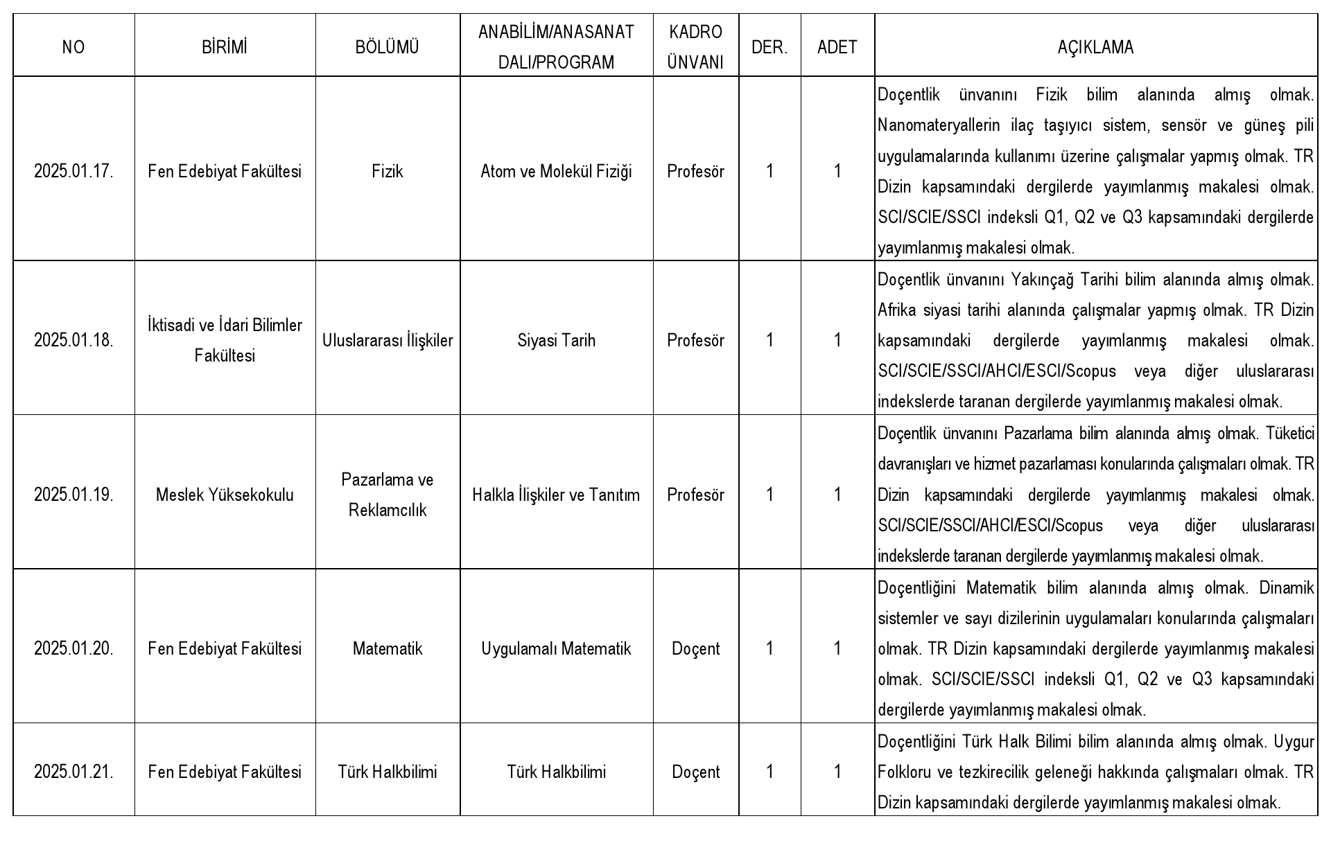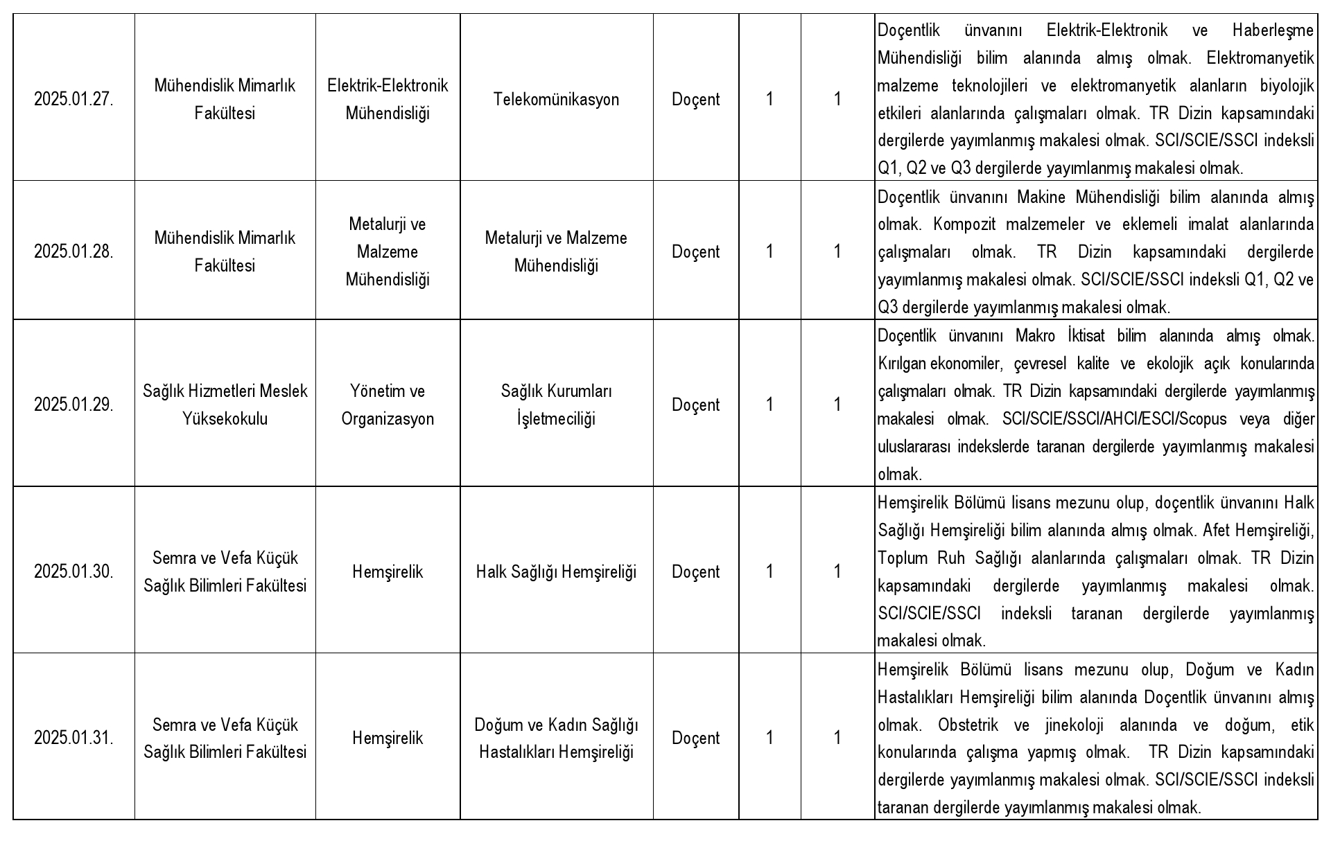 2547 sayılı Kanun'un Ek 38. maddesi uyarınca belirlenen yüzde otuz (%30) kota kapsamında başvuru yapılabilecek doktor öğretim üyesi kadrosu bulunmamaktadır.