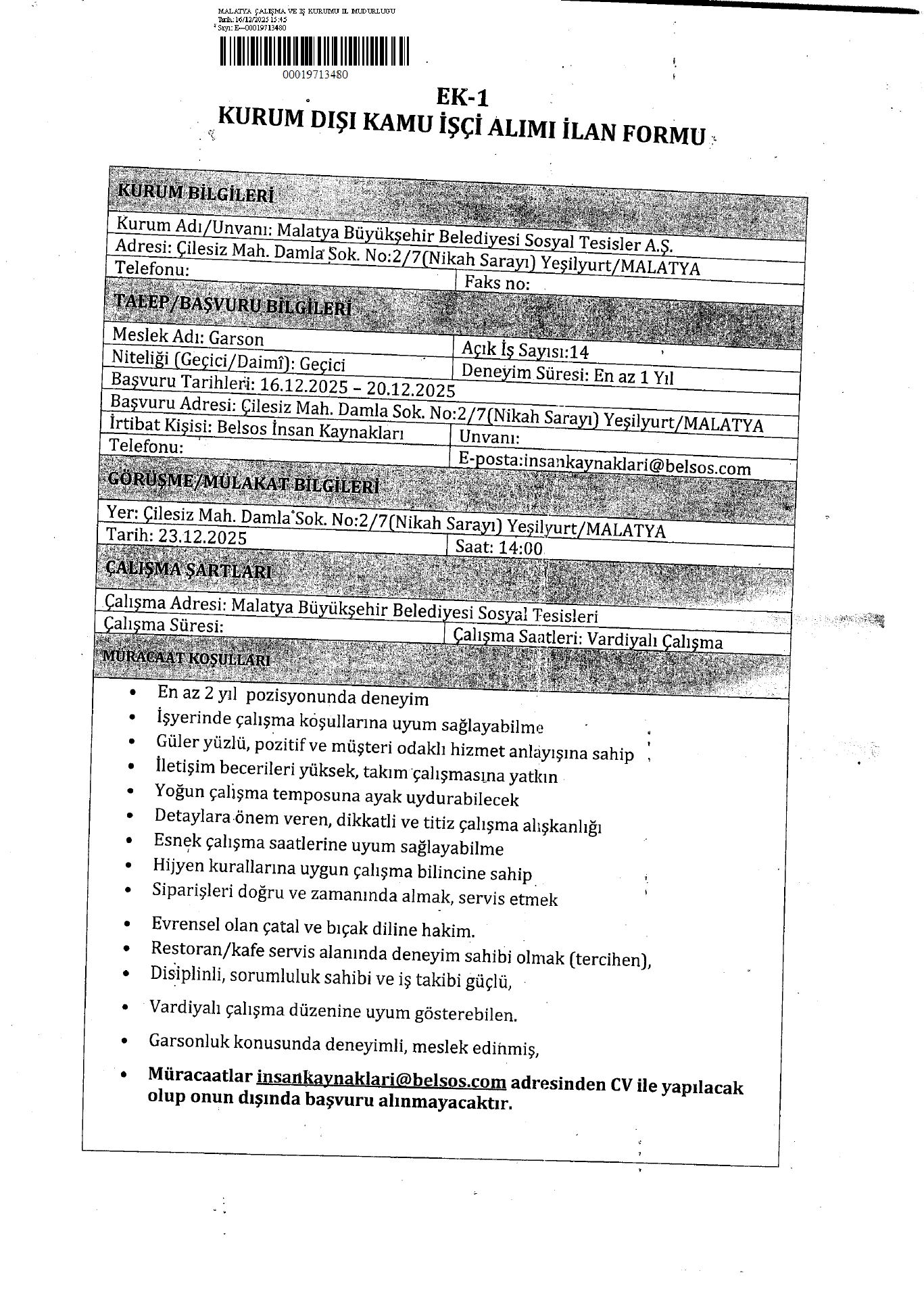 Ana sayfaGeçici İşçi İlanları Malatya Büyükşehir Belediyesi Geçici 14 İşçi Alacak Malatya Büyükşehir Belediyesi Geçici 14 İşçi Alacak. Son başvuru tarihi 20 Aralık 2025 Kaynak : İşkur İlan Giriş : 17 Aralık 2025 00:34, Son Güncelleme : 17 Aralık 2025 03:53 Yazdır Yorumlar (0) Abone Ol