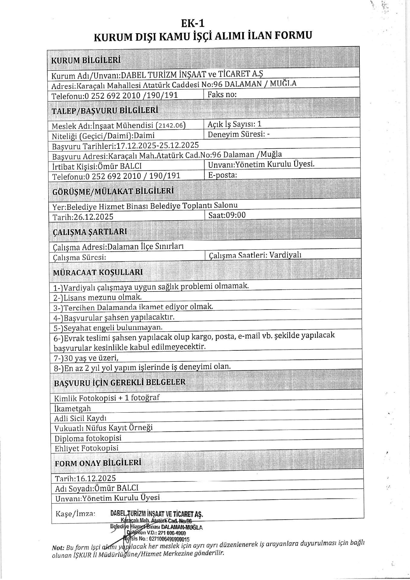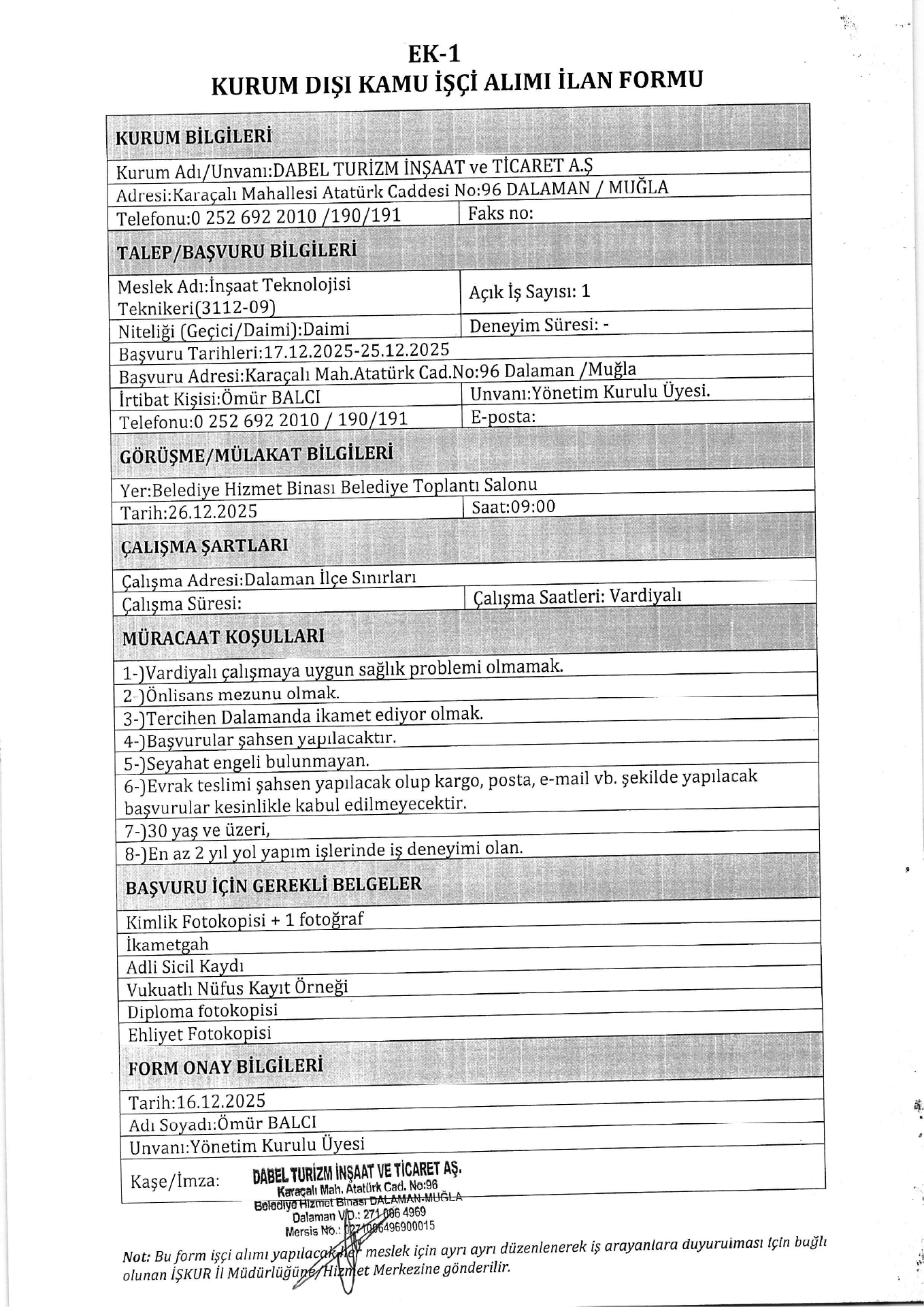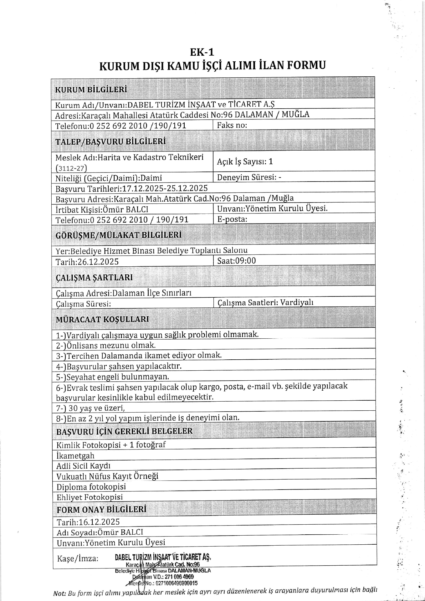 Ana sayfaDaimi İşçi İlanları Muğla Dabel Turizm 3 İşçi Alacak Muğla Dabel Turizm 3 İşçi Alacak. Son başvuru tarihi 25 Aralık 2025 Kaynak : İşkur İlan Giriş : 17 Aralık 2025 00:37, Son Güncelleme : 17 Aralık 2025 03:52 Yazdır Yorumlar (0) Abone Ol