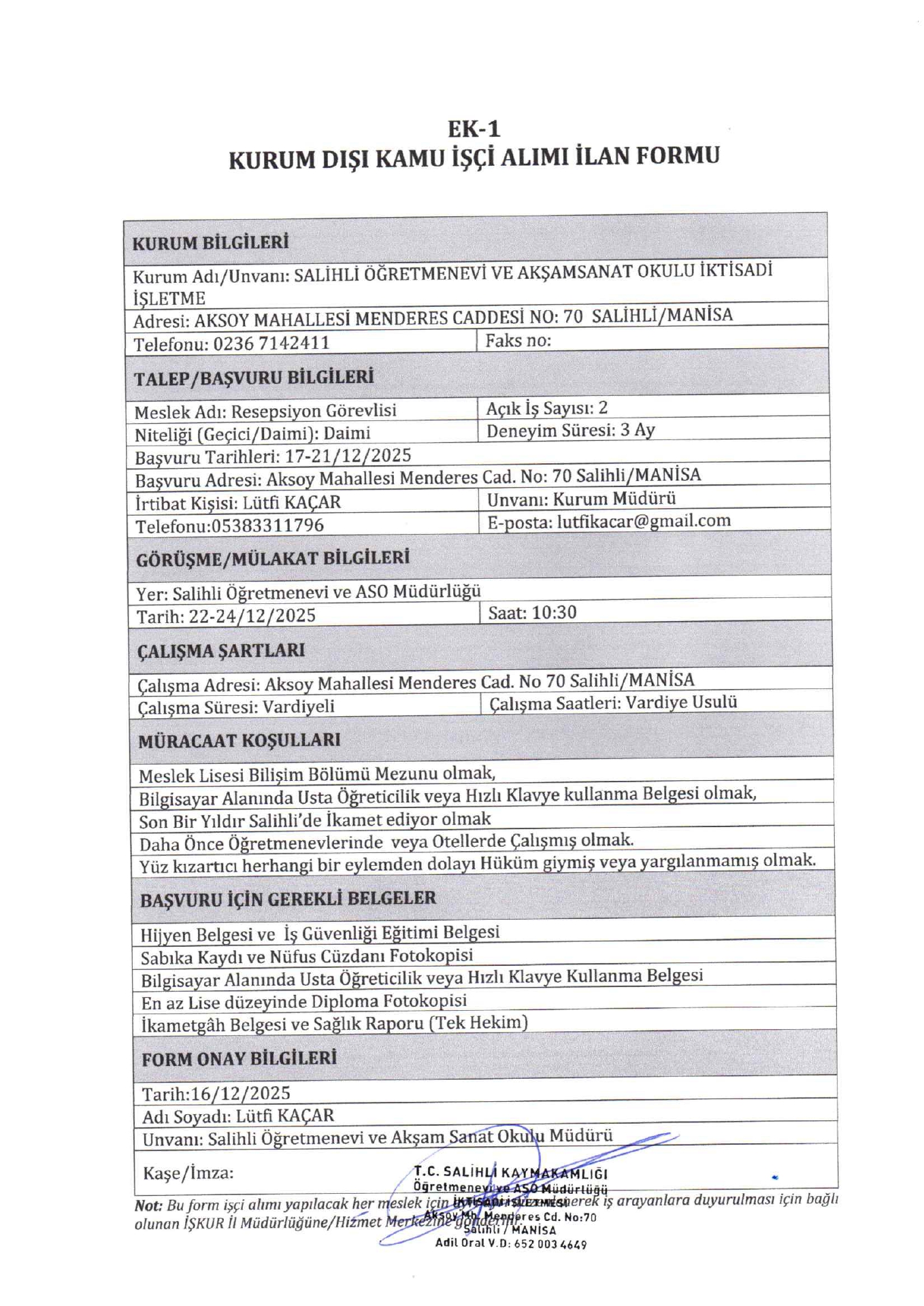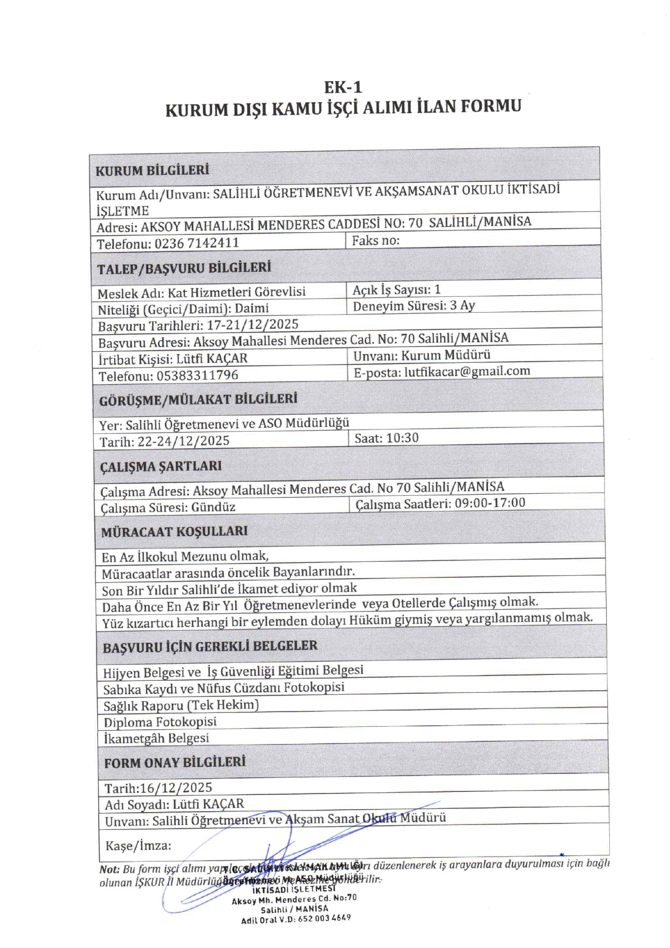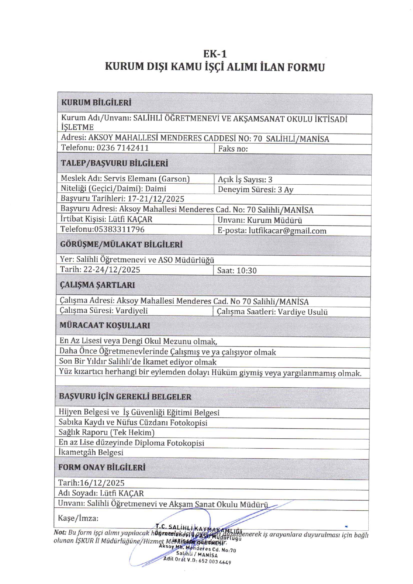 Manisa Salihli Öğretmenevi 6 İşçi Alacak. Son başvuru tarihi 21 Aralık 2025
