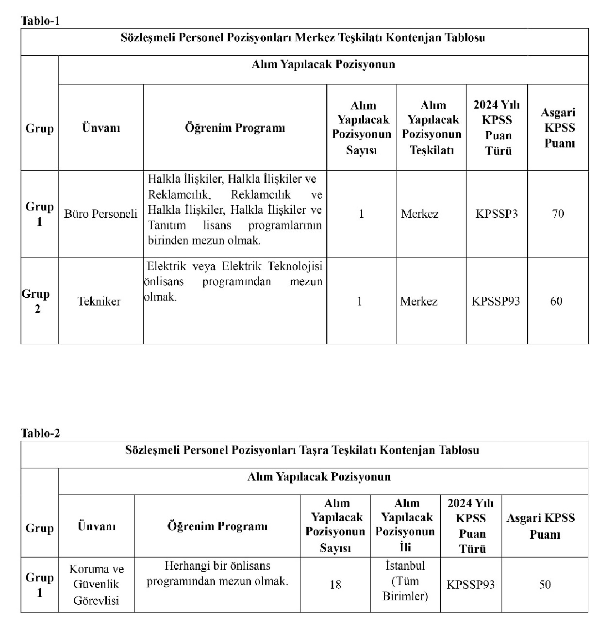 Kanununun 4 üncü maddesinin (B) fıkrasına göre istihdam edilmek üzere 06/06//1978 tarihli ve 7/15754 sayılı Bakanlar Kurulu Kararı'na ekli Sözleşmeli Personel Çalıştırılmasına İlişkin Esaslar'ın Ek 2'inci maddesinin (b) fıkrası uyarınca sözleşmeli personel pozisyonlarında istihdam edilmek üzere; merkez teşkilatında 1 büro personeli, 1 tekniker ile taşra teşkilatında 18 koruma ve güvenlik görevlisi olmak üzere toplam 20 personel alımı yapılacaktır.