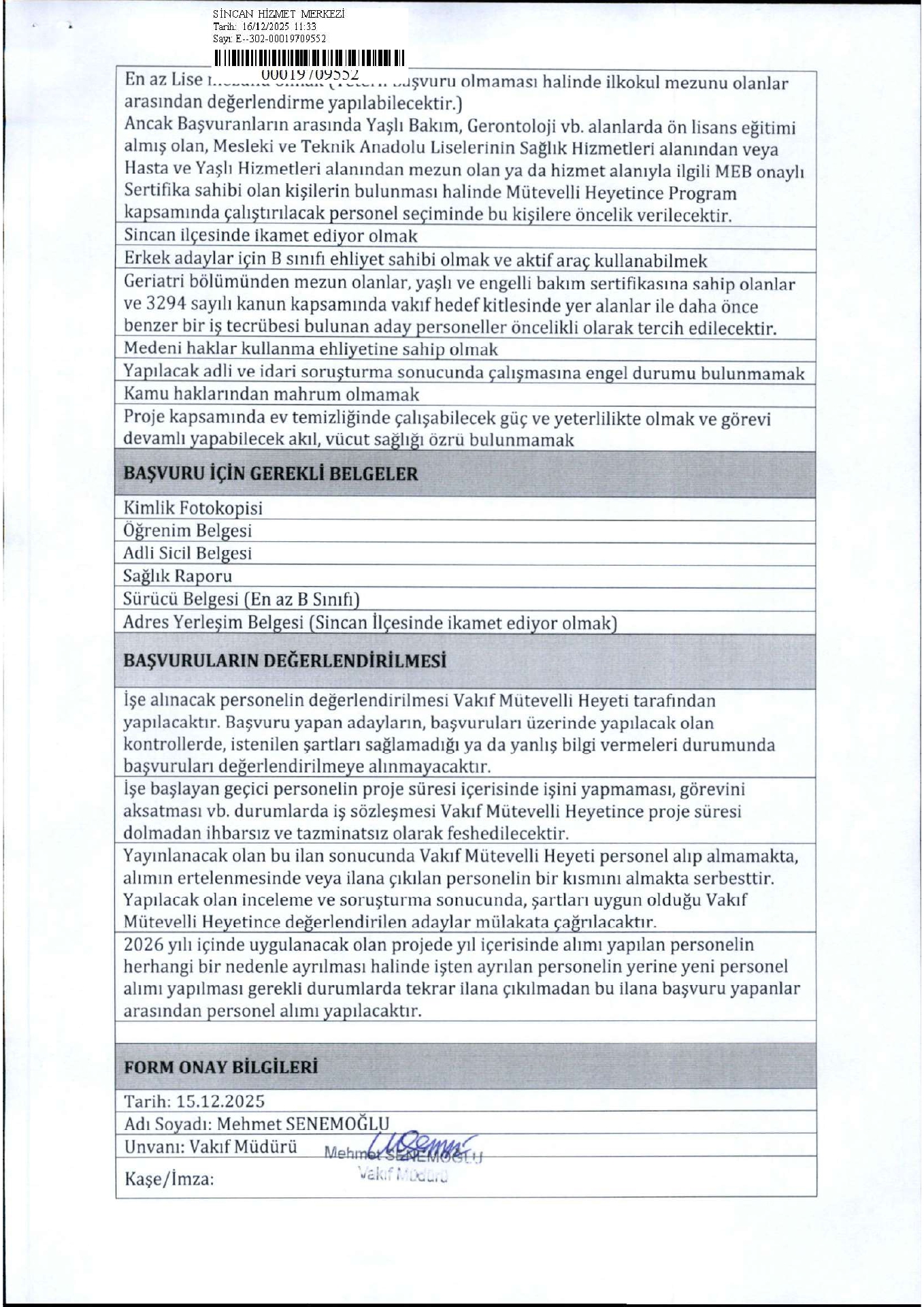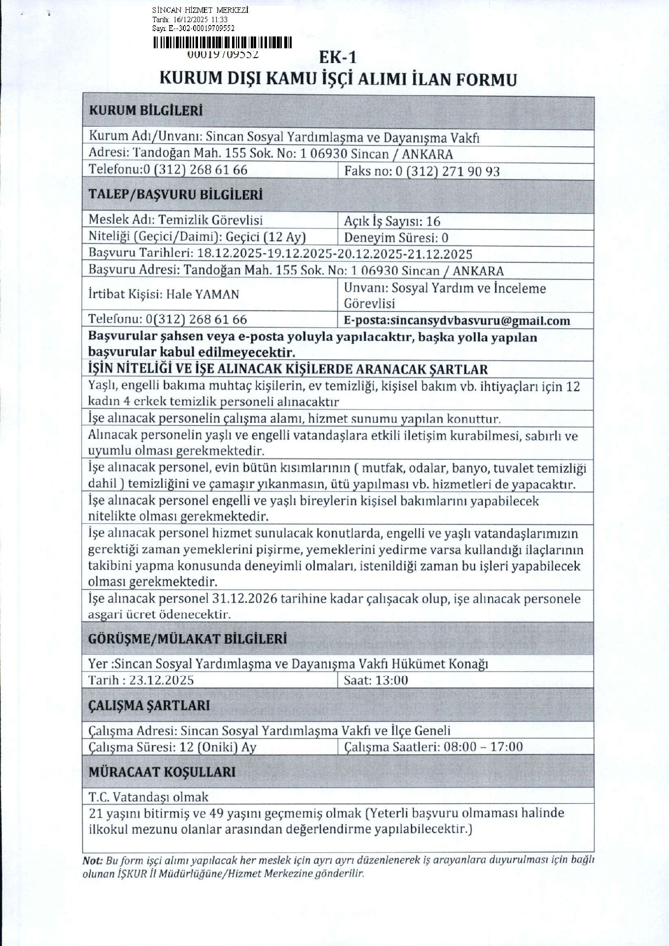 Ana sayfaSYDV İlanlarıAna sayfaGeçici İşçi İlanları Ankara Sincan SYDV Geçici 16 İşçi Alacak Ankara Sincan SYDV Geçici 16 İşçi Alacak. Son Başvuru Tarihi 21 Aralık 2025 Kaynak : İşkur İlan Giriş : 18 Aralık 2025 00:10, Son Güncelleme : 18 Aralık 2025 00:49 Yazdır Yorumlar (0) Abone Ol