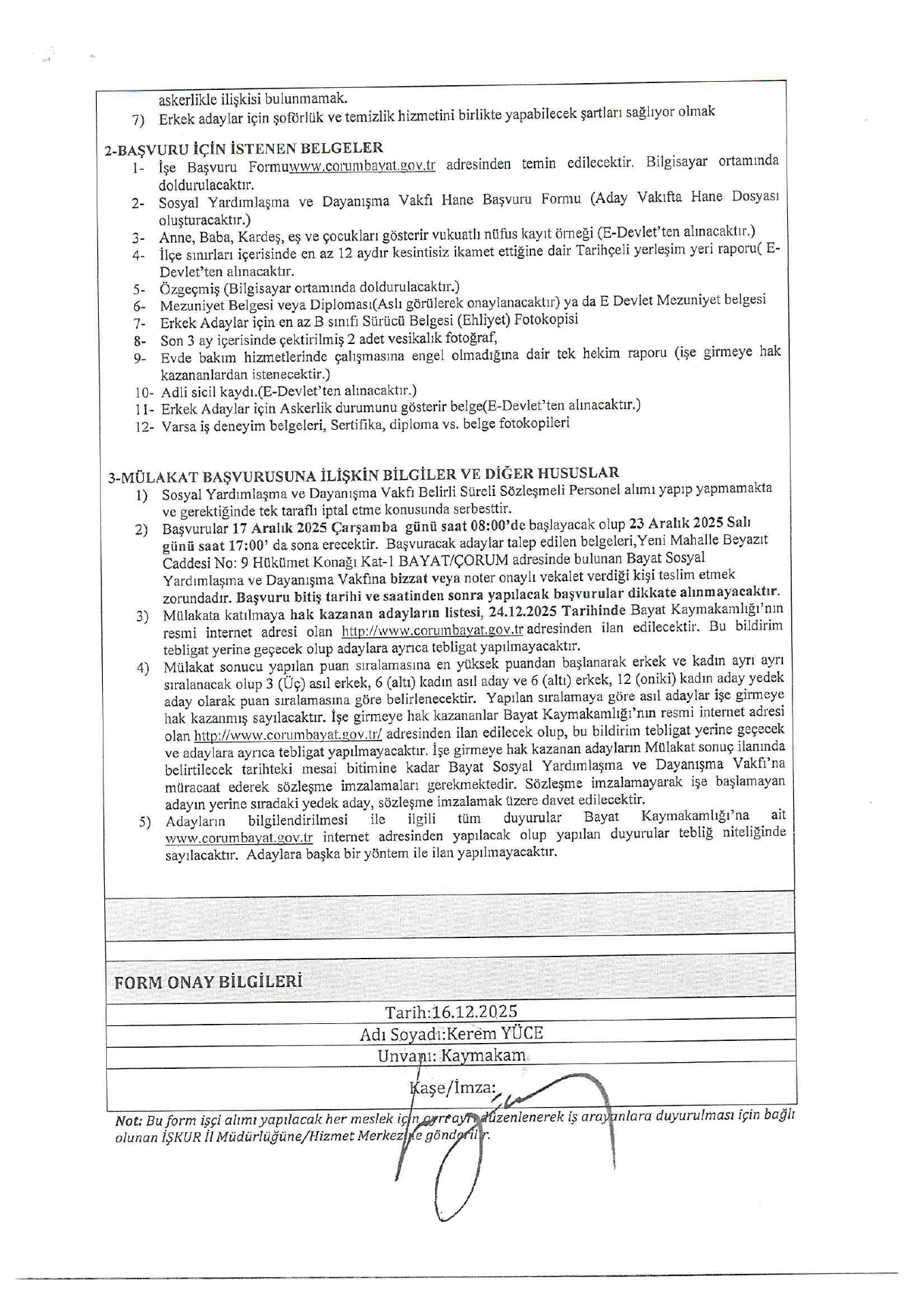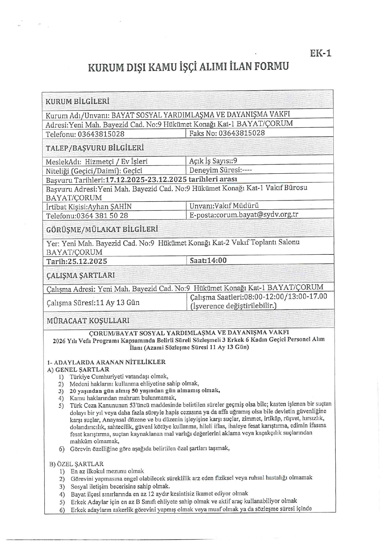 Çorum Bayat SYDV Geçici 9 İşçi Alacak. Son Başvuru Tarihi 23 Aralık 2025