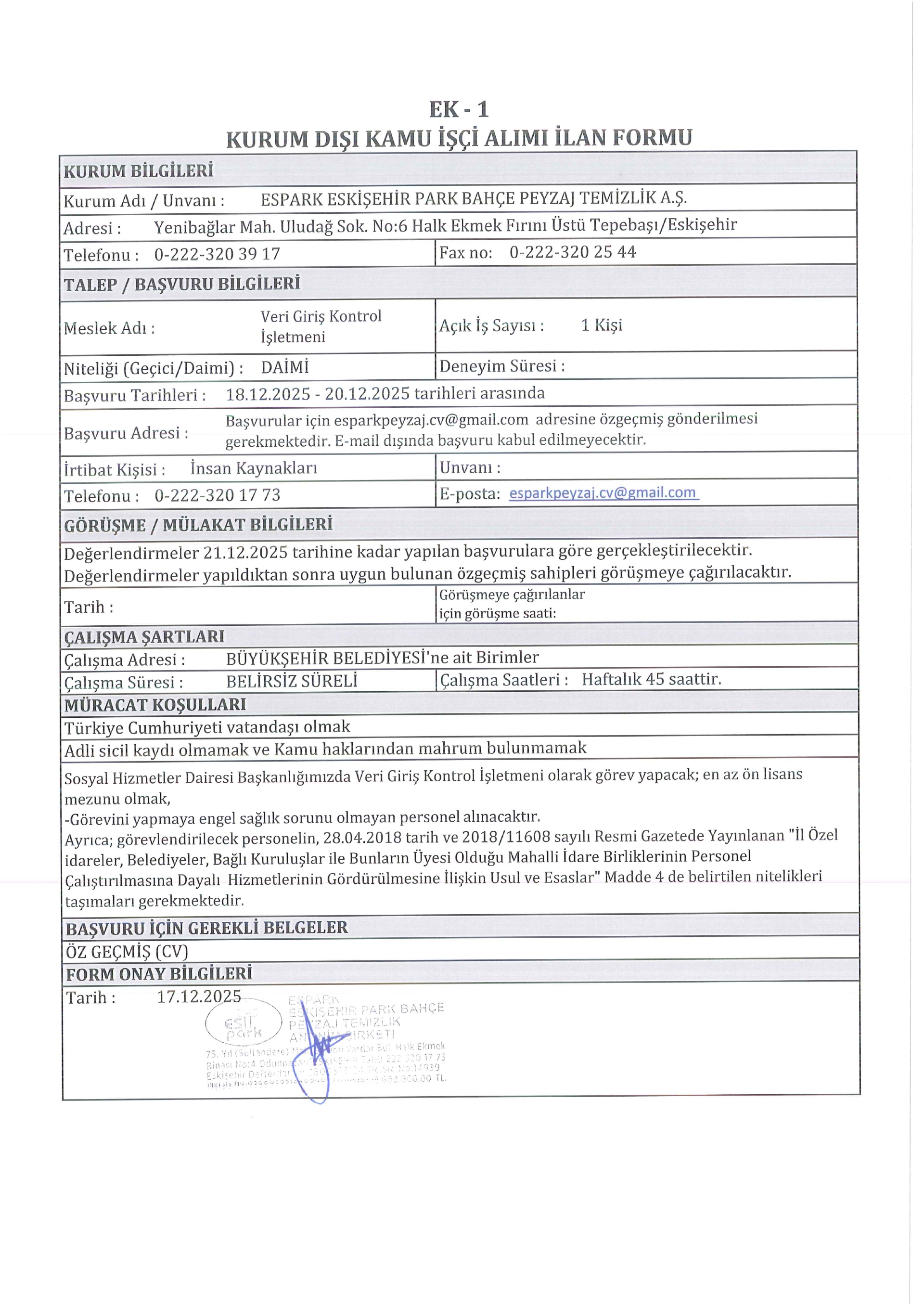 Eskişehir Espark 1 İşçi Alacak. Son Başvuru Tarihi 20 Aralık 2025