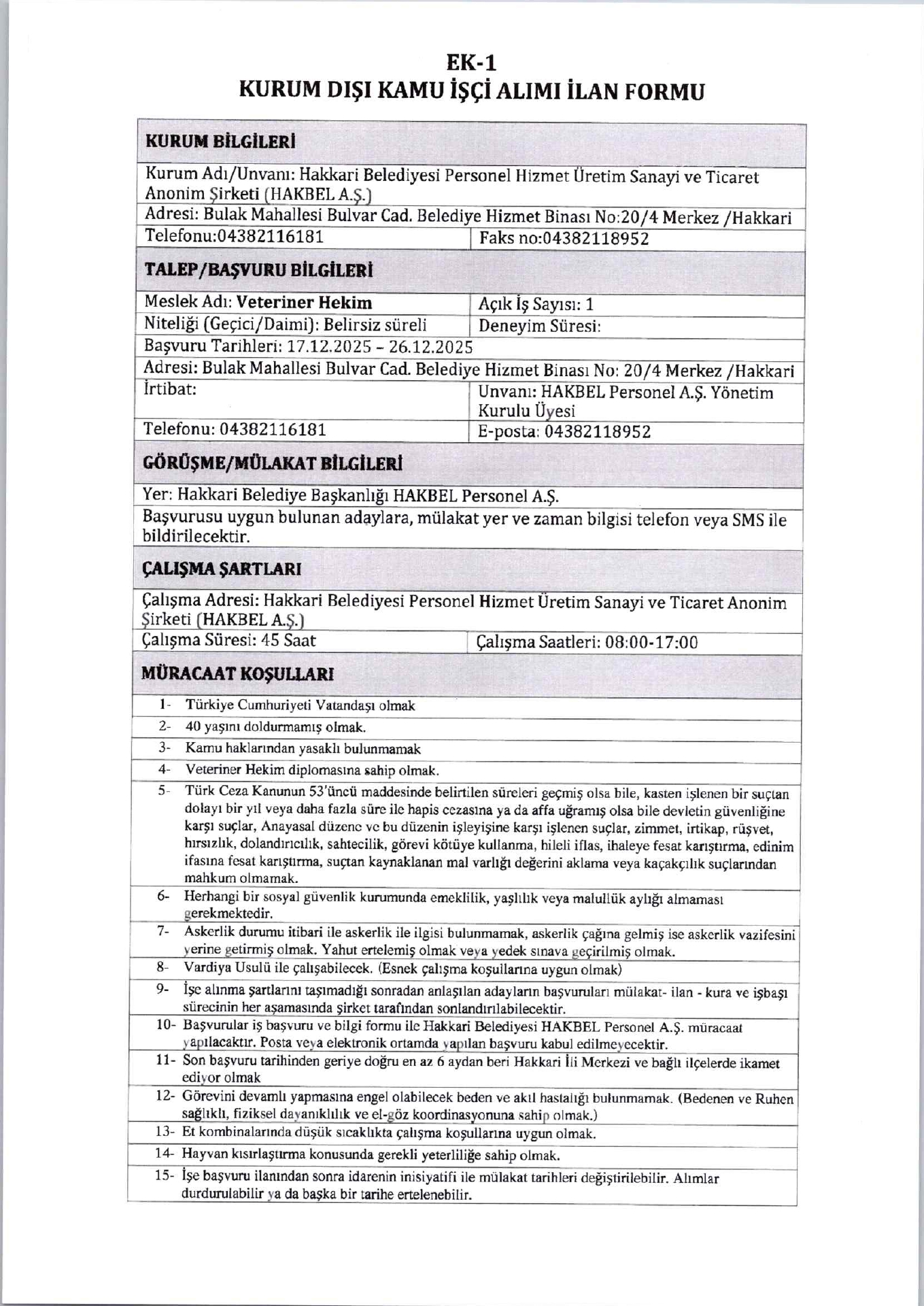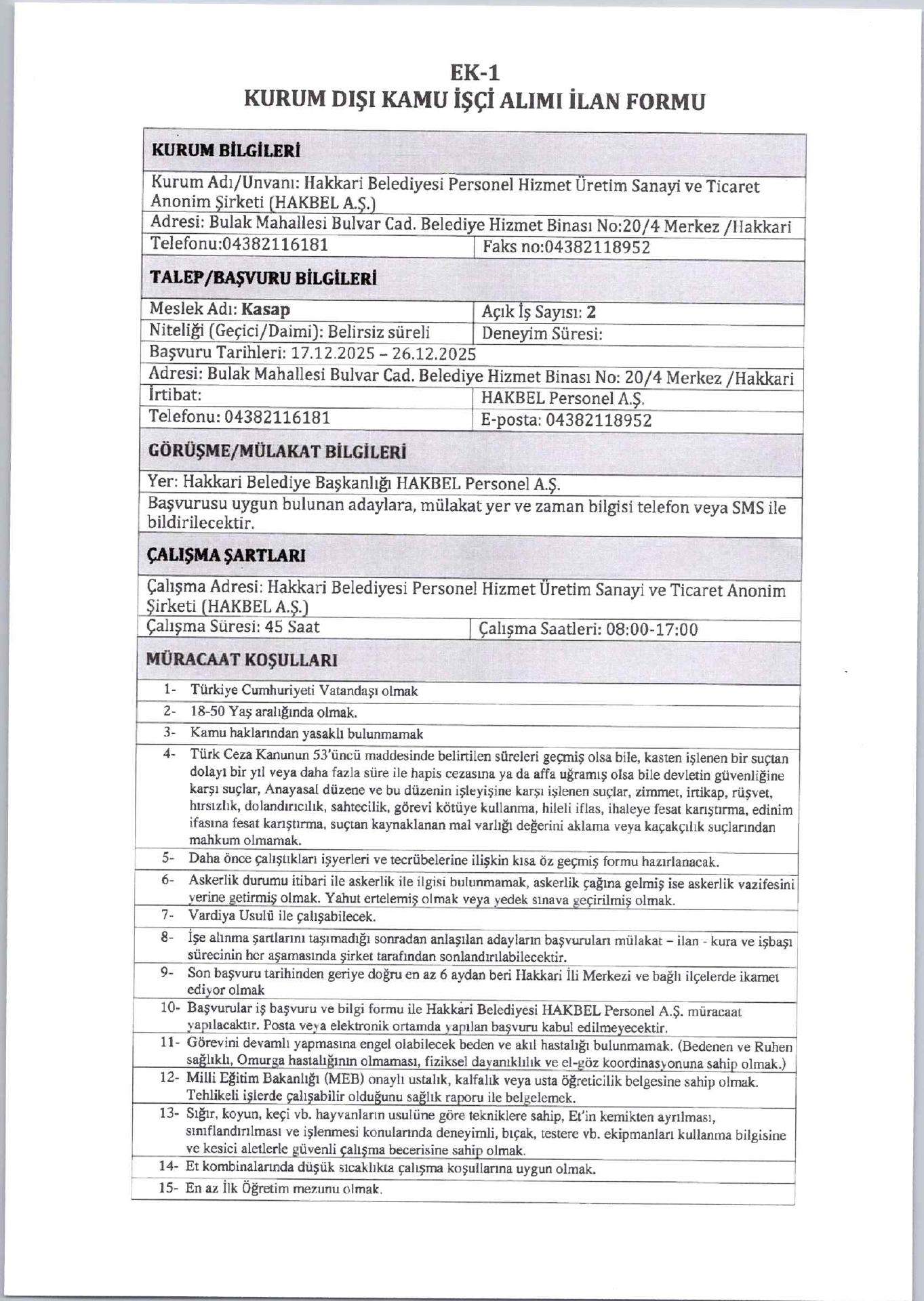 Hakkari Belediyesi 3 İşçi Alacak. Son Başvuru Tarihi 26 Aralık 2025