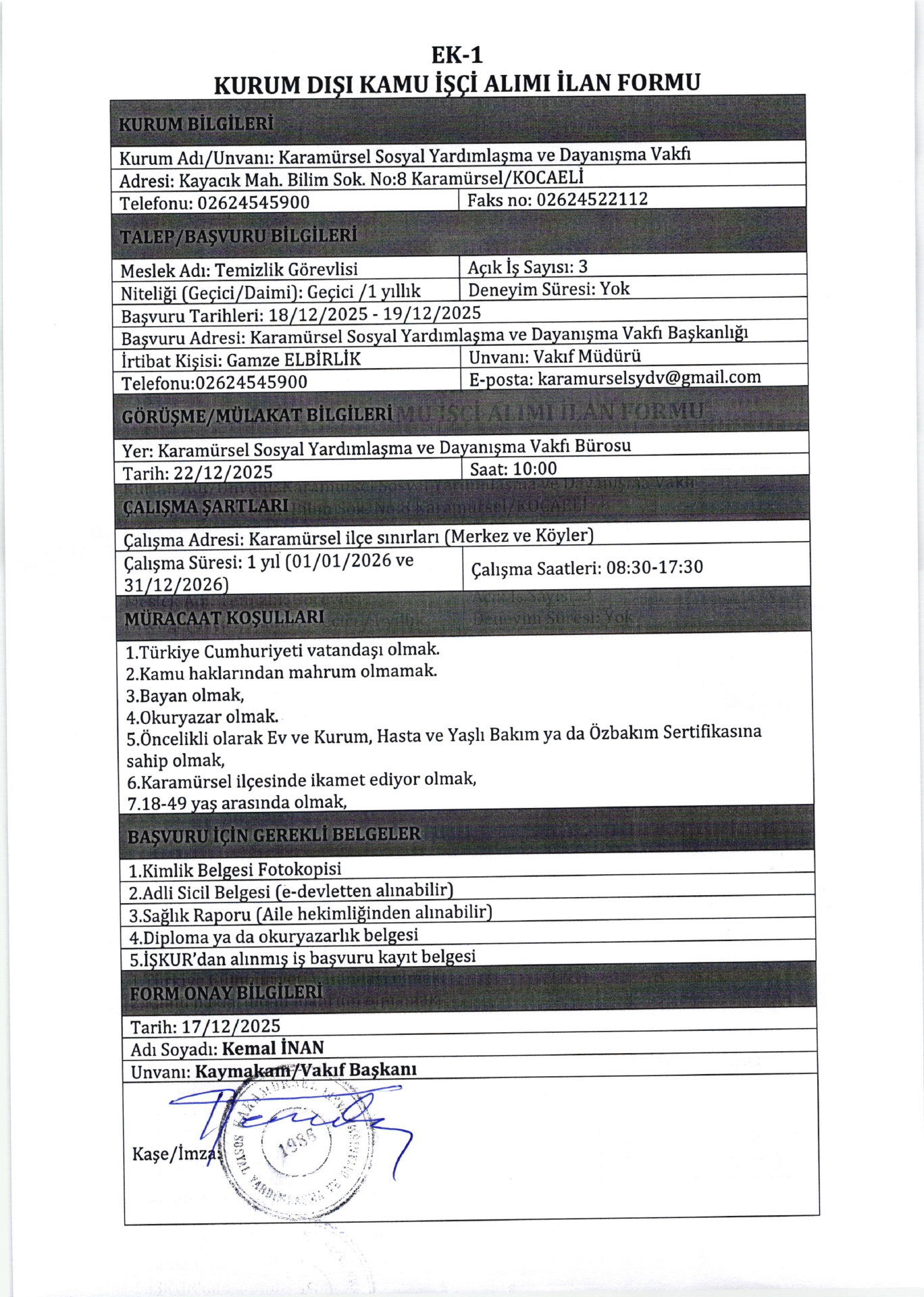 Kocaeli Karamürsel SYDV Geçici 3 İşçi Alacak. Son Başvuru Tarihi 19 Aralık 2025