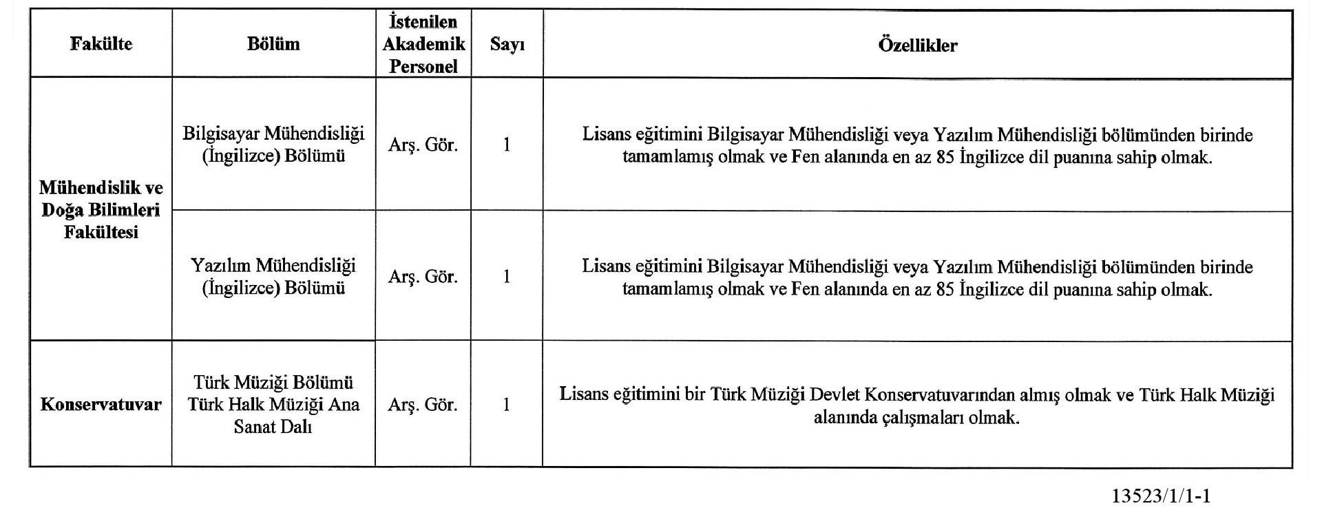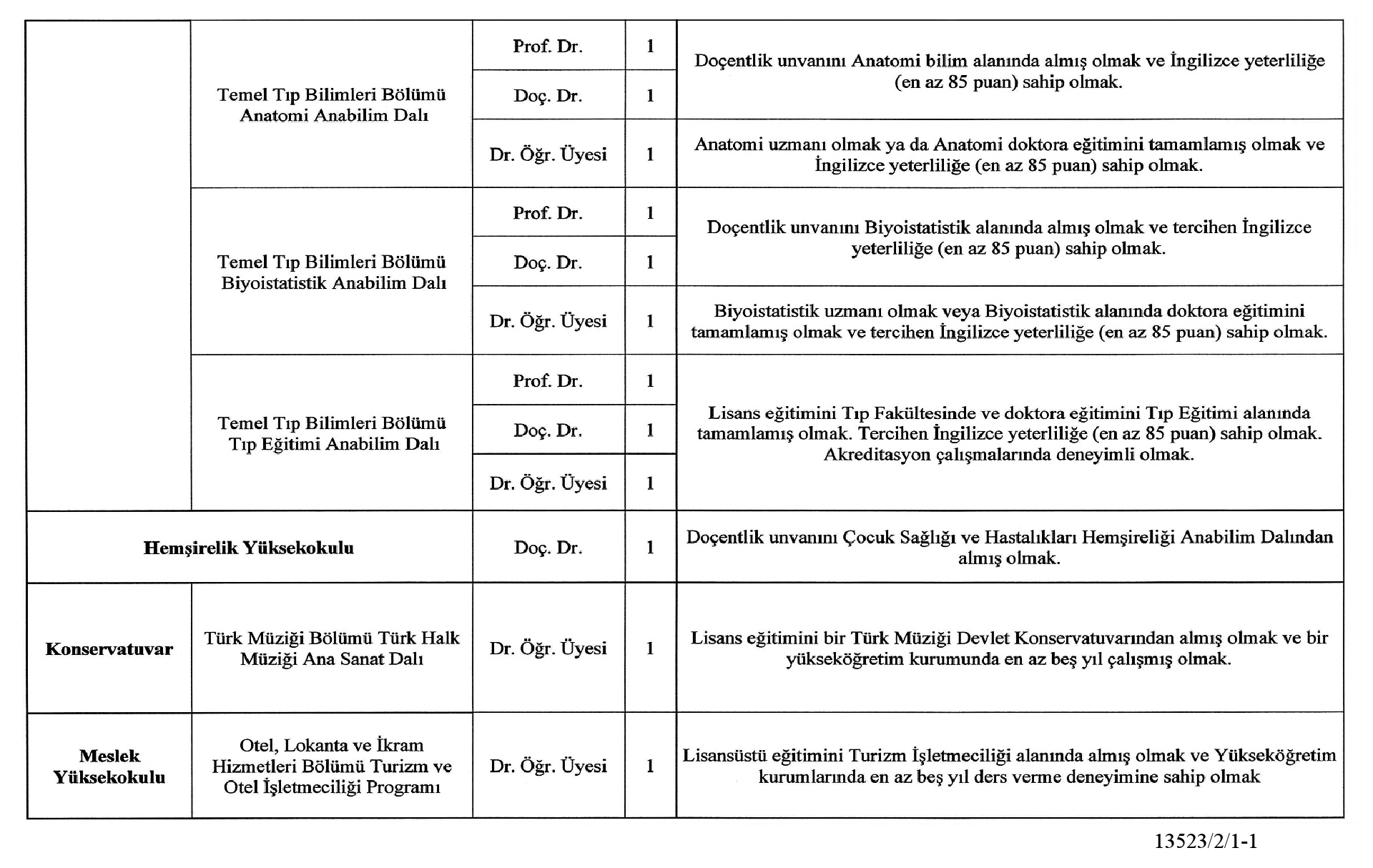 Not: Adaylarm ilan tarihini izleyen 15 gün içinde Personel ve İdari İşler Daire Başkanlığına şahsen veya postayla başvurmaları gerekmektedir. Son başvuru tarihinden sonra ve eksik belgeyle yapılan başvurular geçersiz sayılacaktır.