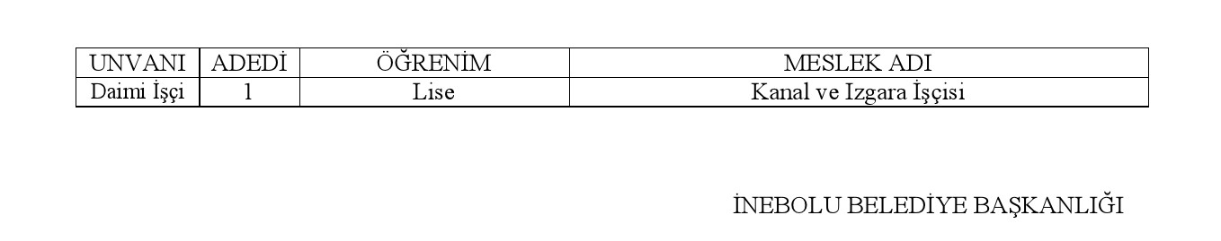 Kurumumuz İnebolu Belediye Başkanlığına alınacak 1 adet Daimi İşçi için, 09 Ağustos 2009 tarih ve 27314 sayılı Resmi Gazetede yayımlanarak yürürlüğe giren Kamu Kurum ve Kuruluşlarına İşçi Alınmasında Uygulanacak Usul ve Esaslar Hakkında Yönetmelik hükümlerine göre Çalışma ve İş Kurumu Kastamonu İl Müdürlüğüne İşgücü talebinde bulunulmuş olup, iş ilanımızın 18/12/2025-22/12/2025 tarihleri arasında yayımlanması talep edilmiştir.