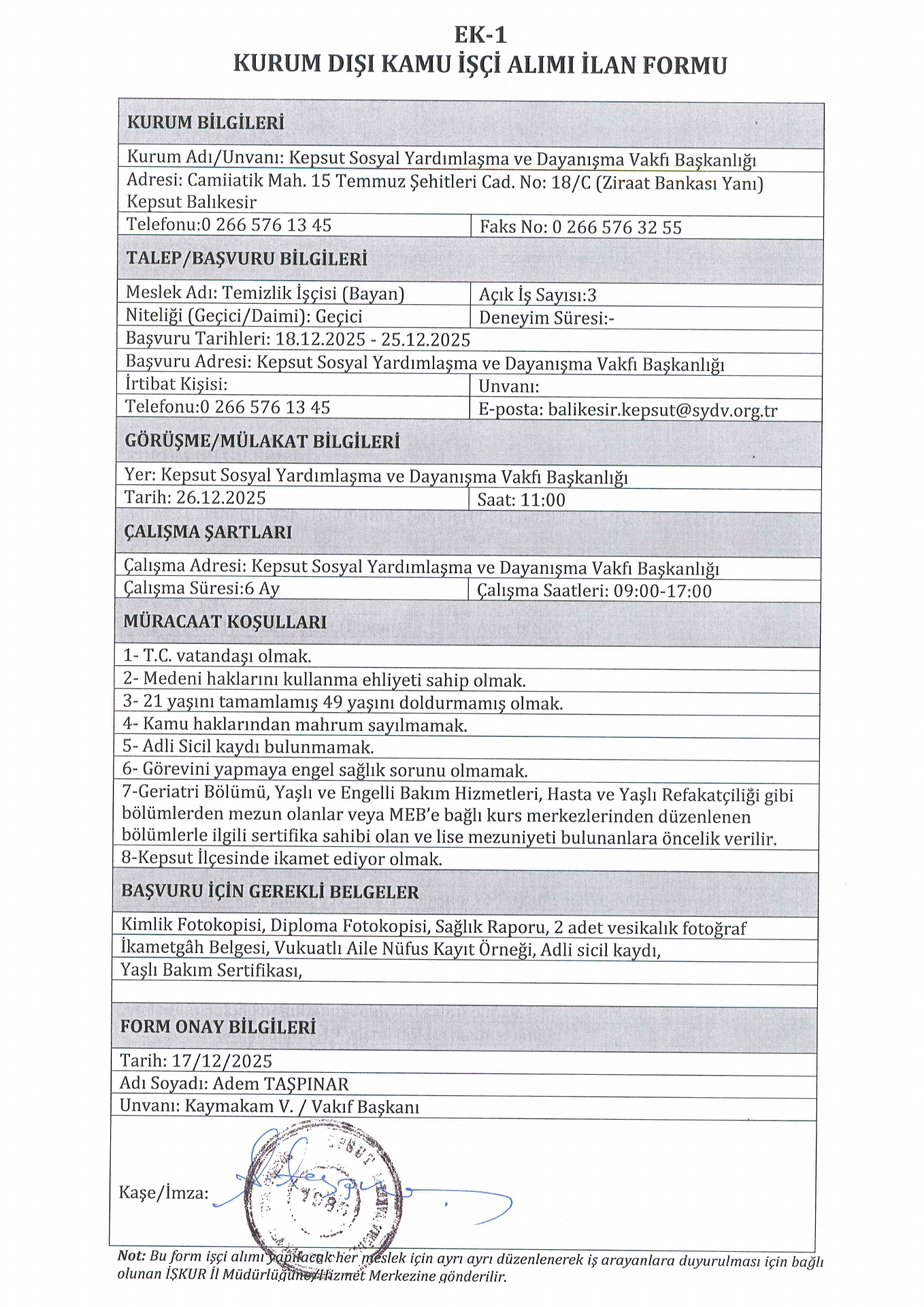 Ana sayfaSYDV İlanlarıAna sayfaGeçici İşçi İlanları Balıkesir Kepsut SYDV Geçici 3 İşçi Alacak Balıkesir Kepsut SYDV Geçici 3 İşçi Alacak. Son başvuru tarihi 25 Aralık 2025 Kaynak : İşkur İlan Giriş : 19 Aralık 2025 00:17, Son Güncelleme : 19 Aralık 2025 00:50 Yazdır Yorumlar (0) Abone Ol