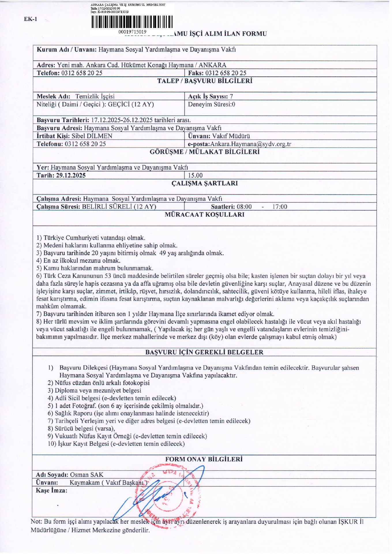 Ana sayfaSYDV İlanlarıAna sayfaGeçici İşçi İlanları Ankara Haymana SYDV Geçici 7 İşçi Alacak Ankara Haymana SYDV Geçici 7 İşçi Alacak. Son başvuru tarihi 26 Aralık 2025 Kaynak : İşkur İlan Giriş : 19 Aralık 2025 00:29, Son Güncelleme : 19 Aralık 2025 00:47 Yazdır Yorumlar (0) Abone Ol