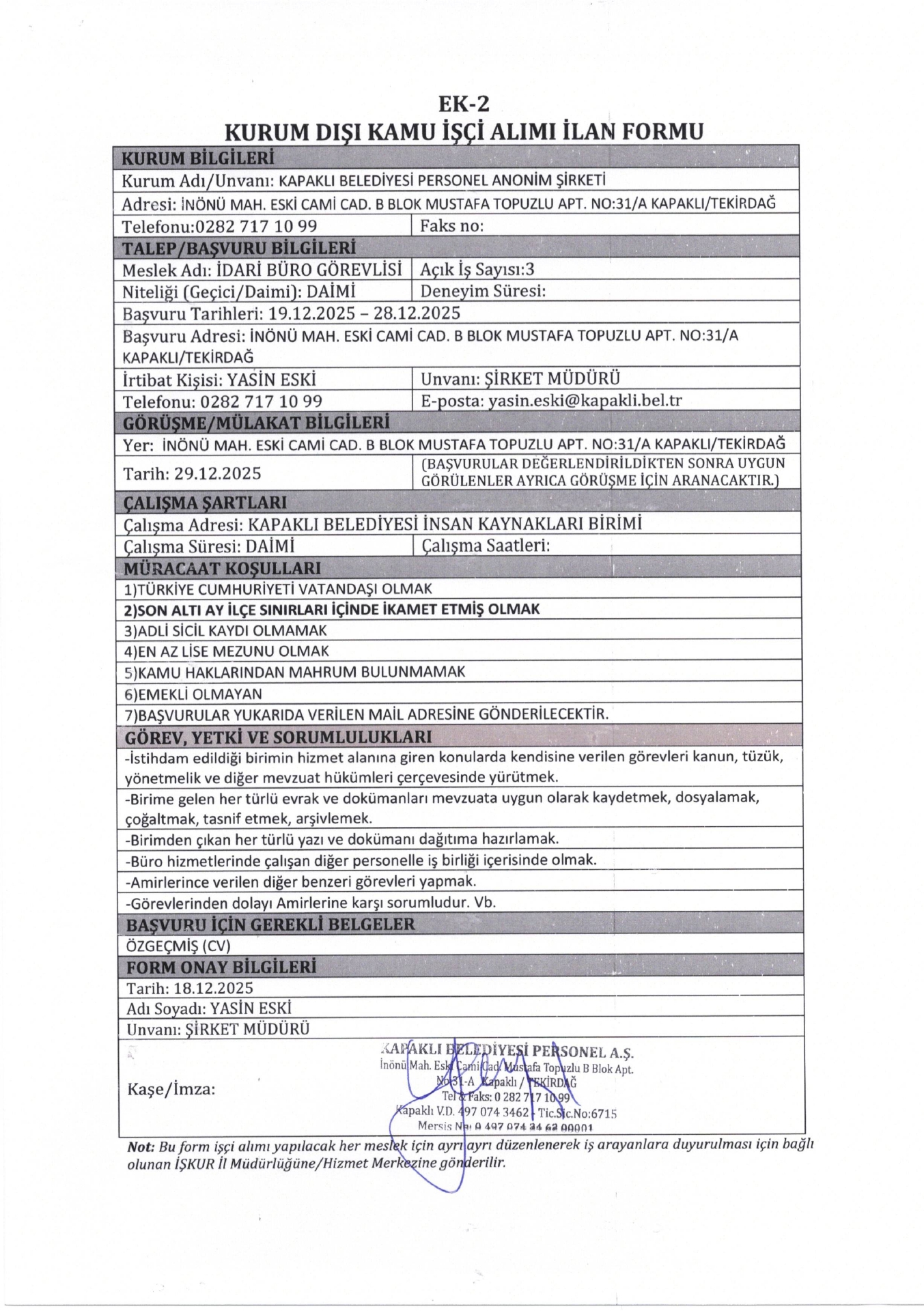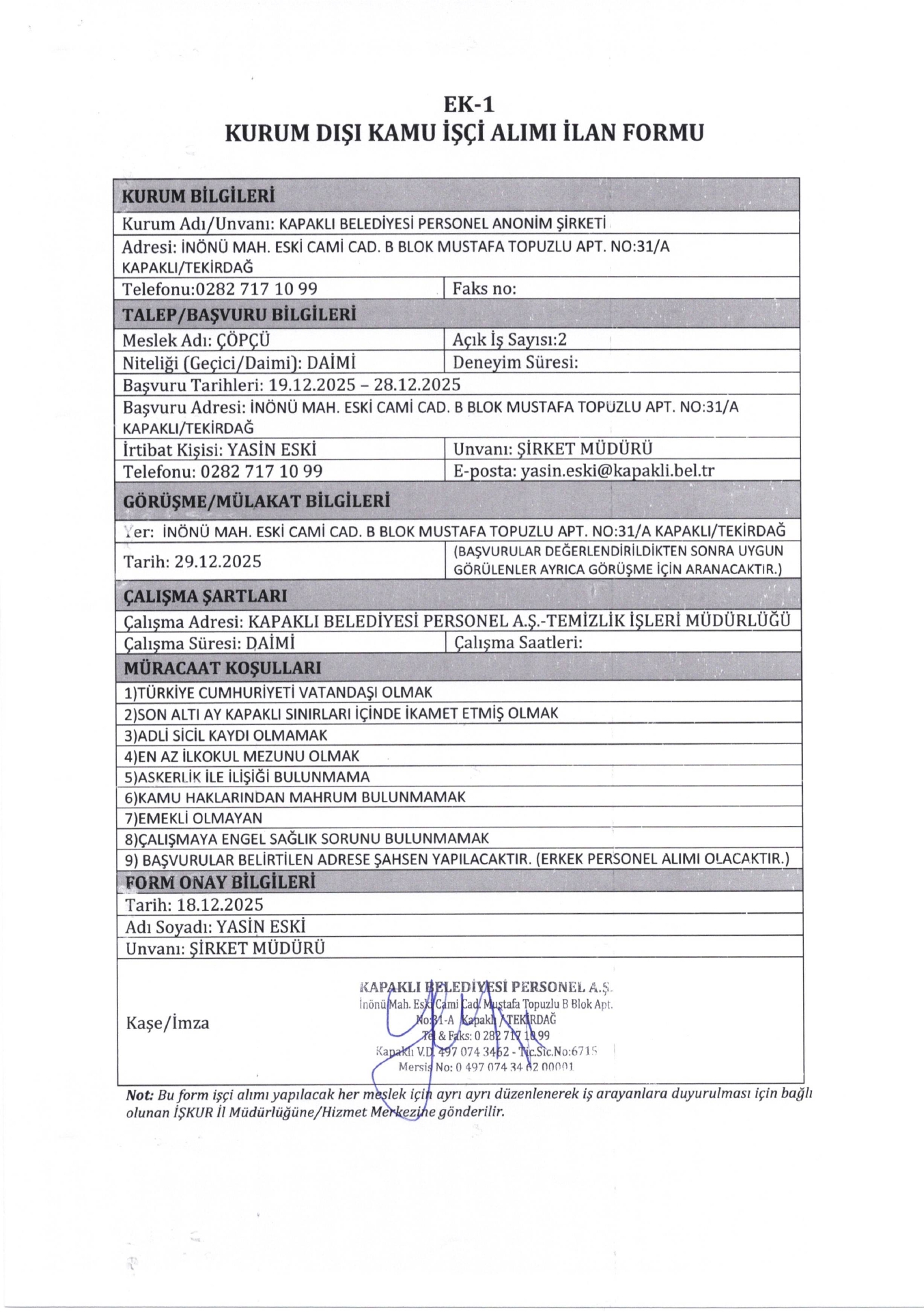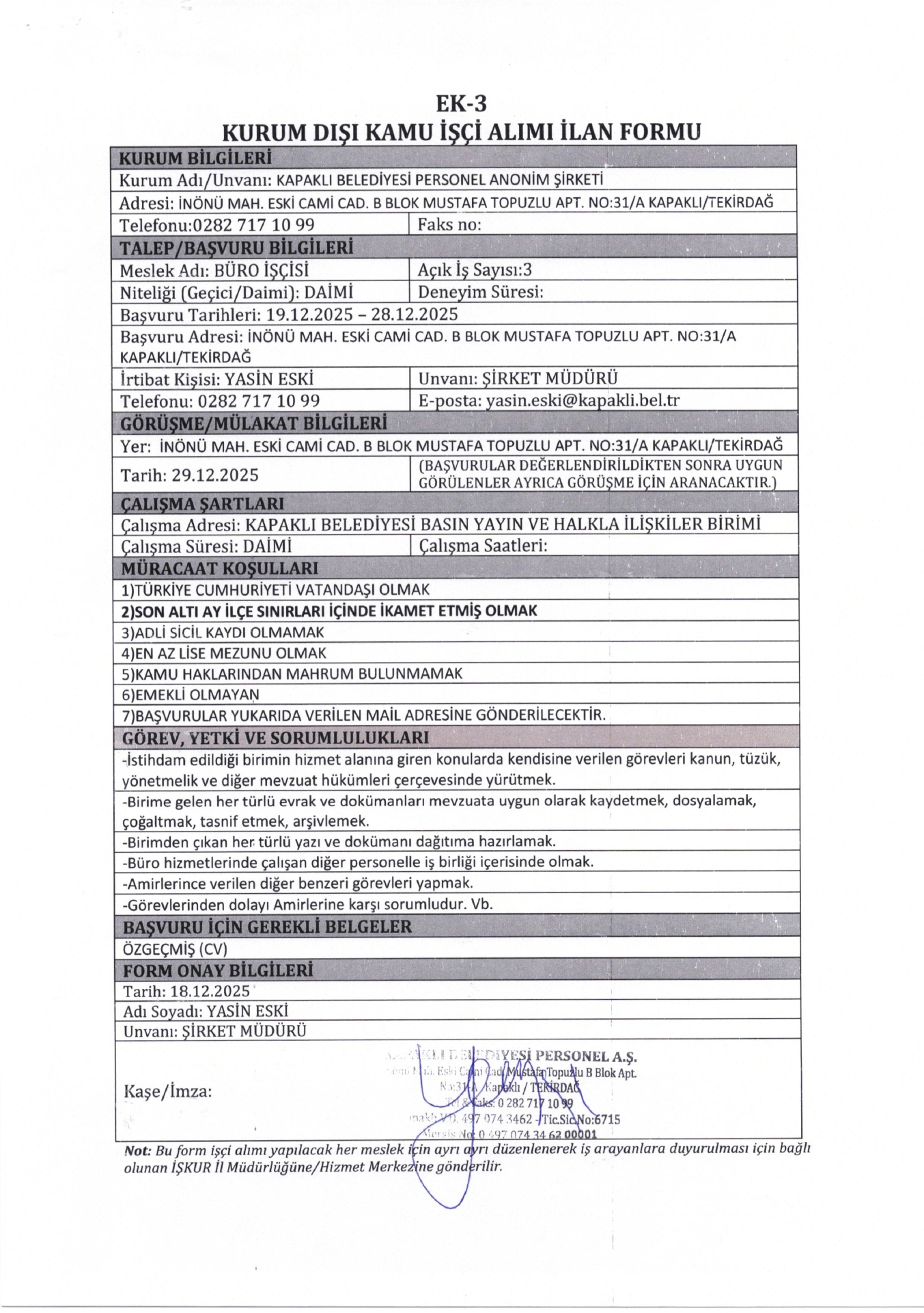 Ana sayfaDaimi İşçi İlanları Tekirdağ Kapaklı Belediyesi 8 İşçi Alacak Tekirdağ Kapaklı Belediyesi 8 İşçi Alacak. Son başvuru tarihi 28 Aralık 2025 Kaynak : İşkur İlan Giriş : 19 Aralık 2025 00:38, Son Güncelleme : 19 Aralık 2025 00:45 Yazdır Yorumlar (0) Abone Ol