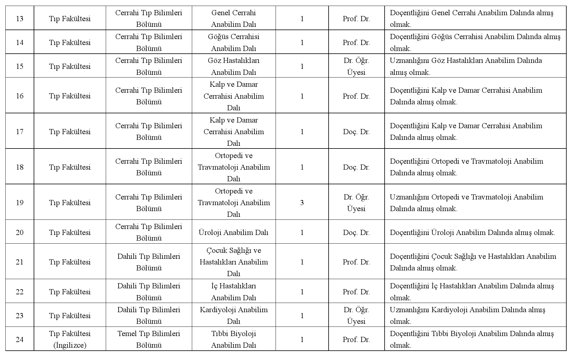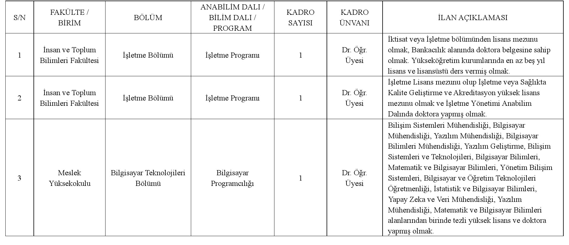 Üniversitemize 2547 sayılı Yükseköğretim Kanunu'nun ve Öğretim Üyesi Dışındaki Öğretim Elemanı Kadrolarına yapılacak Atamalarda Uygulanacak Merkezi Sınav ile Giriş Sınavlarına İlişkin Usul ve Esaslar hakkında Yönetmelik'in İlgili Maddeleri Uyarınca "Öğretim Elemanı" Alınacaktır. Başvurular, ilan tarihinden itibaren 15 gün içinde, Üniversitemiz İnsan Kaynakları Daire Başkanlığı'na şahsen/posta yolu ile yapılabilir. Postadaki gecikmeler ve eksik belge ile yapılan başvurular dikkate alınmaz.