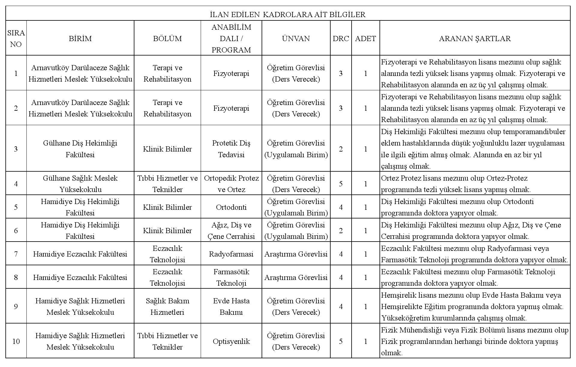Sağlık Bilimleri Üniversitesi Rektörlüğünden: