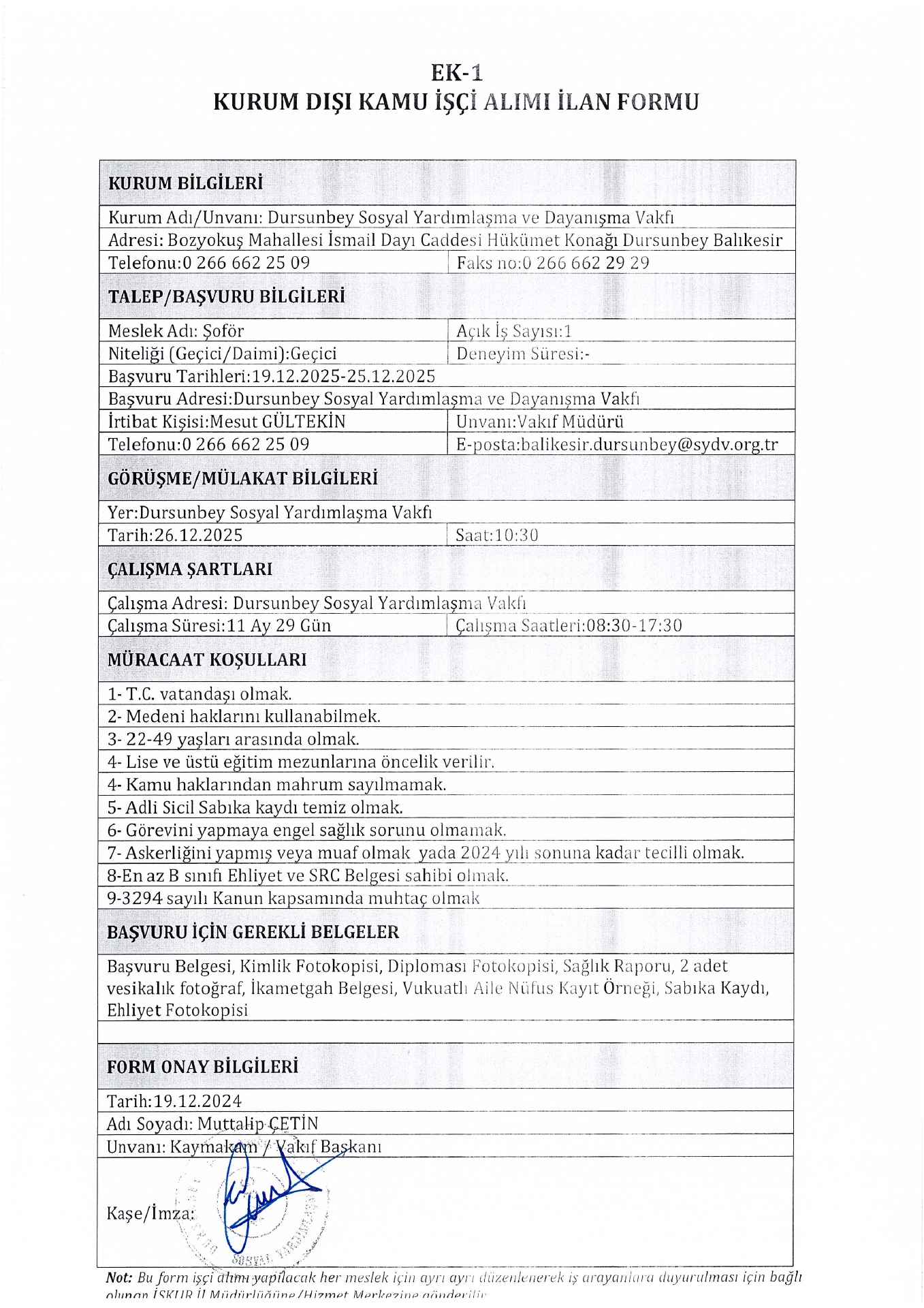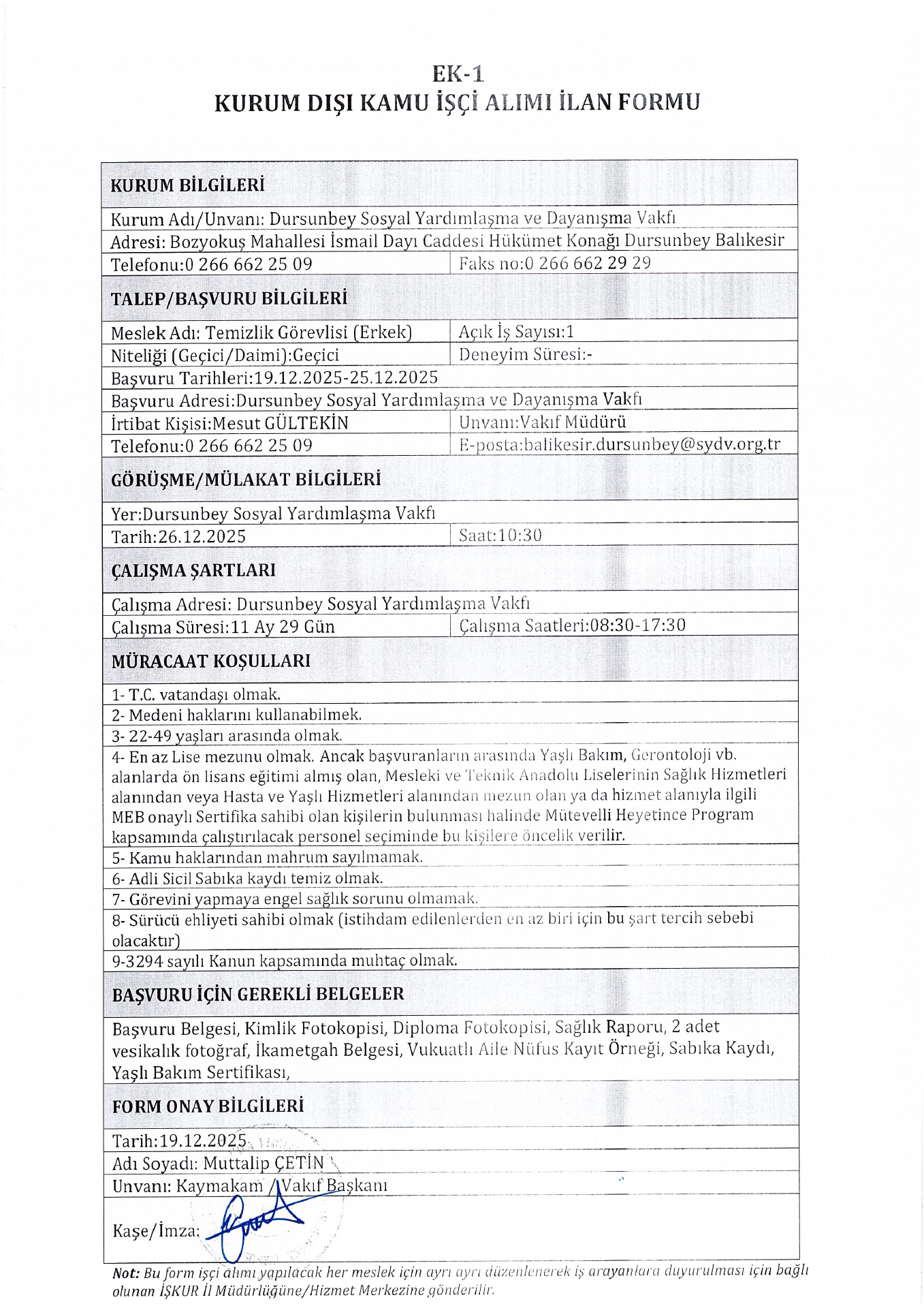 Ana sayfaSYDV İlanlarıAna sayfaGeçici İşçi İlanları Balıkesir Dursunbey SYDV Geçici 2 İşçi Alacak Balıkesir Dursunbey SYDV Geçici 2 İşçi Alacak. Son başvuru tarihi 25 Aralık 2025 Kaynak : İşkur İlan Giriş : 19 Aralık 2025 22:36, Son Güncelleme : 19 Aralık 2025 22:52 Yazdır Yorumlar (0) Abone Ol