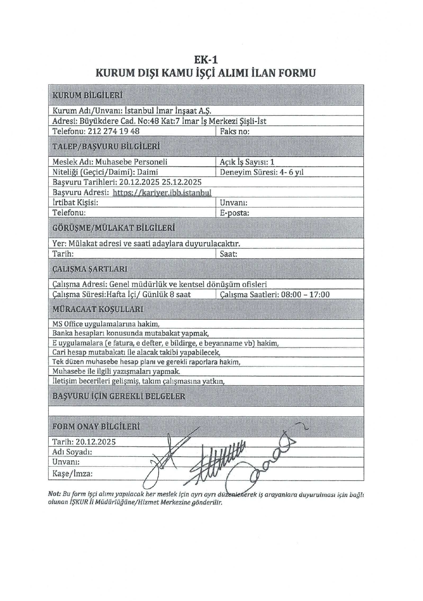 Ana sayfaDaimi İşçi İlanları İstanbul İmar 1 İşçi Alacak İstanbul İmar 1 İşçi Alacak. Son başvuru tarihi 25 Aralık 2025 Kaynak : İşkur İlan Giriş : 19 Aralık 2025 22:48, Son Güncelleme : 19 Aralık 2025 22:49 Yazdır Yorumlar (0) Abone Ol