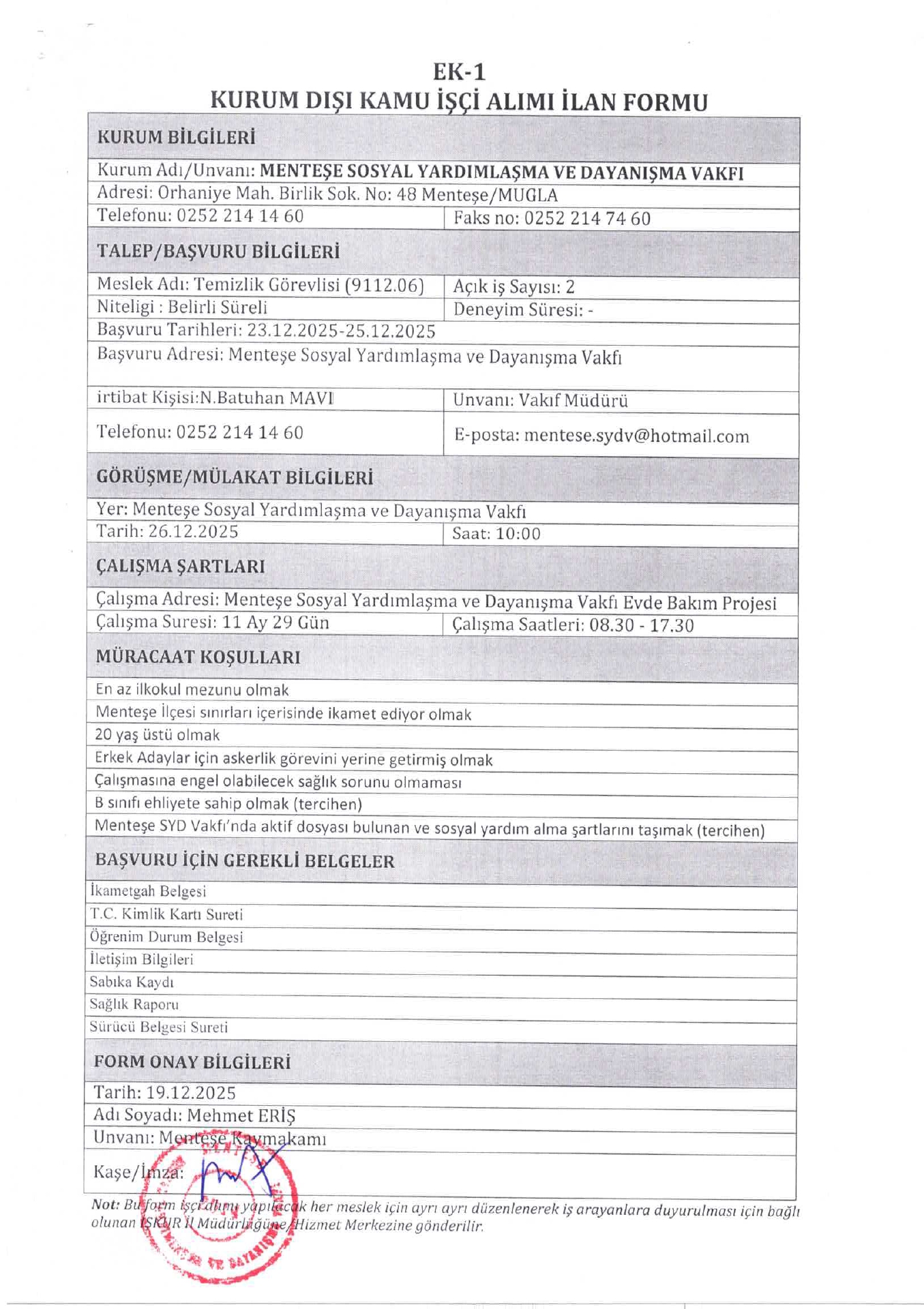 Muğla Menteşe SYDV Geçici 2 İşçi Alacak. Son başvuru tarihi 25 Aralık 2025