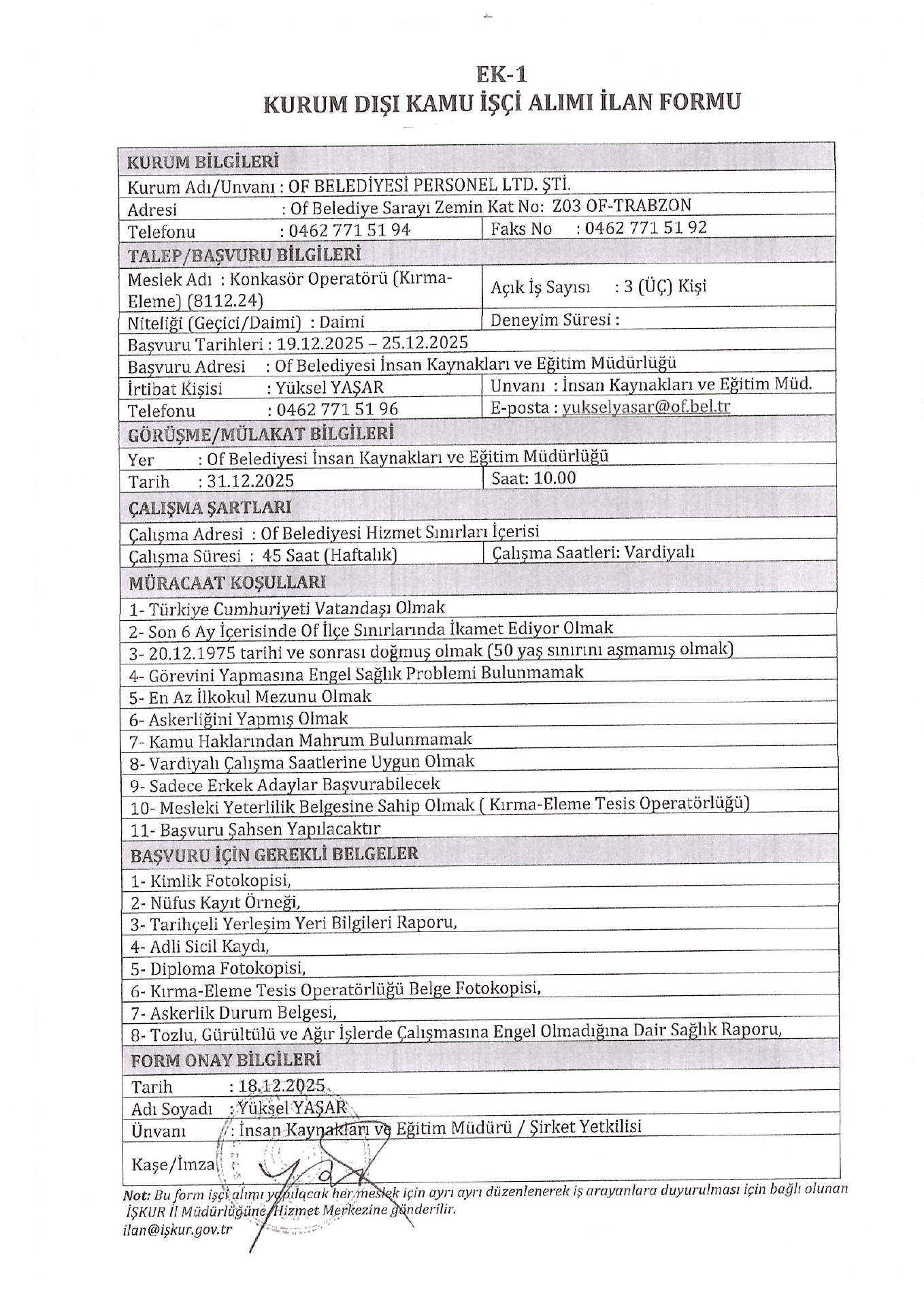 Ana sayfaDaimi İşçi İlanları Trabzon Of Belediyesi 3 İşçi Alacak Trabzon Of Belediyesi 3 İşçi Alacak. Son başvuru tarihi 25 Aralık 2025 Kaynak : İşkur İlan Giriş : 19 Aralık 2025 23:03, Son Güncelleme : 19 Aralık 2025 22:45 Yazdır Yorumlar (0) Abone Ol