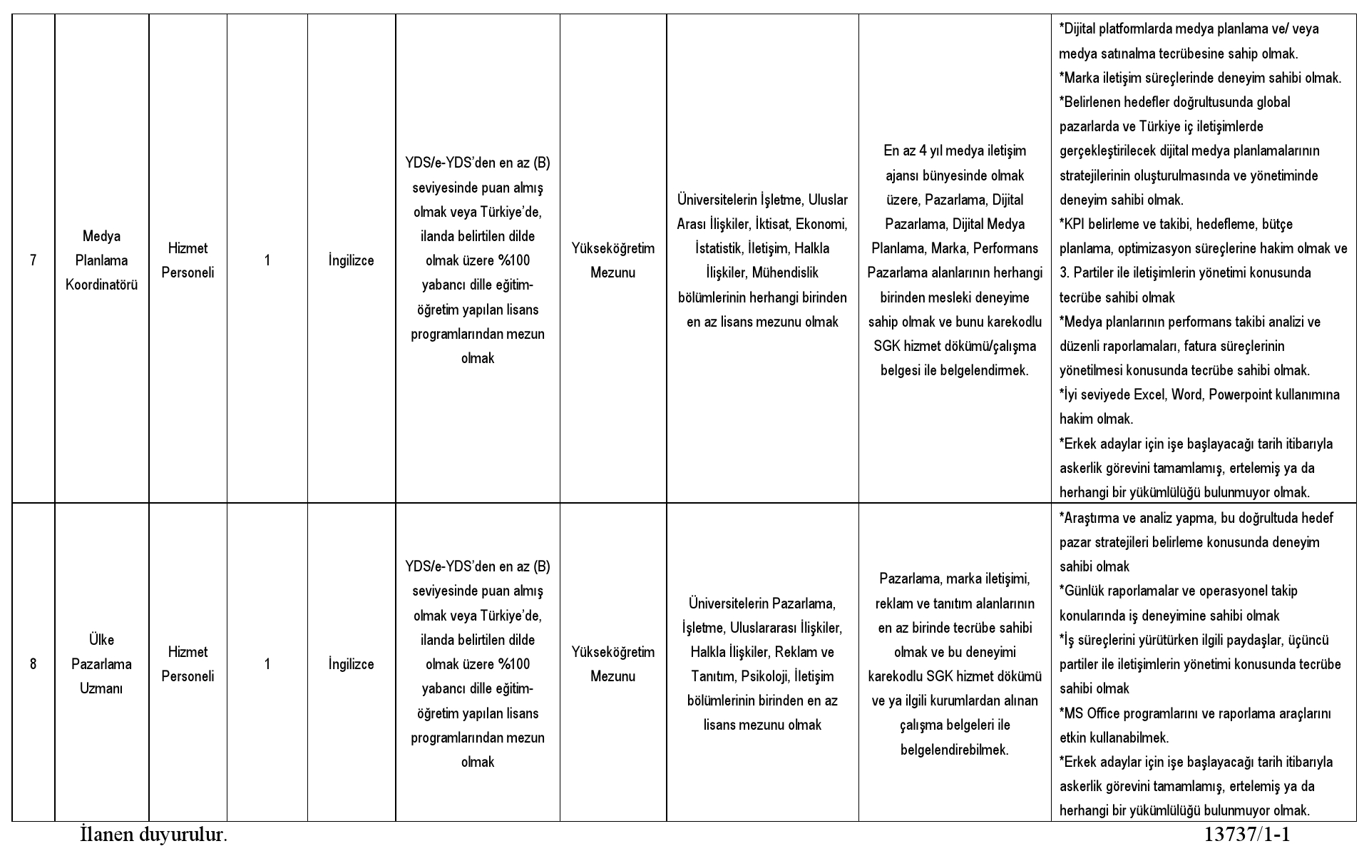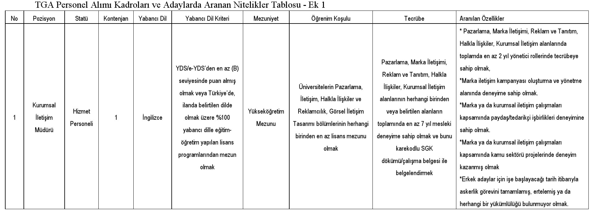 c) Adayların bu ilanın ekinde yer alan TGA Personel Alımı Kadroları ve Adaylarda Aranan Nitelikler Tablosundaki (Ek-1) her bir pozisyon için belirtilen özel koşulları taşımaları gerekmektedir.