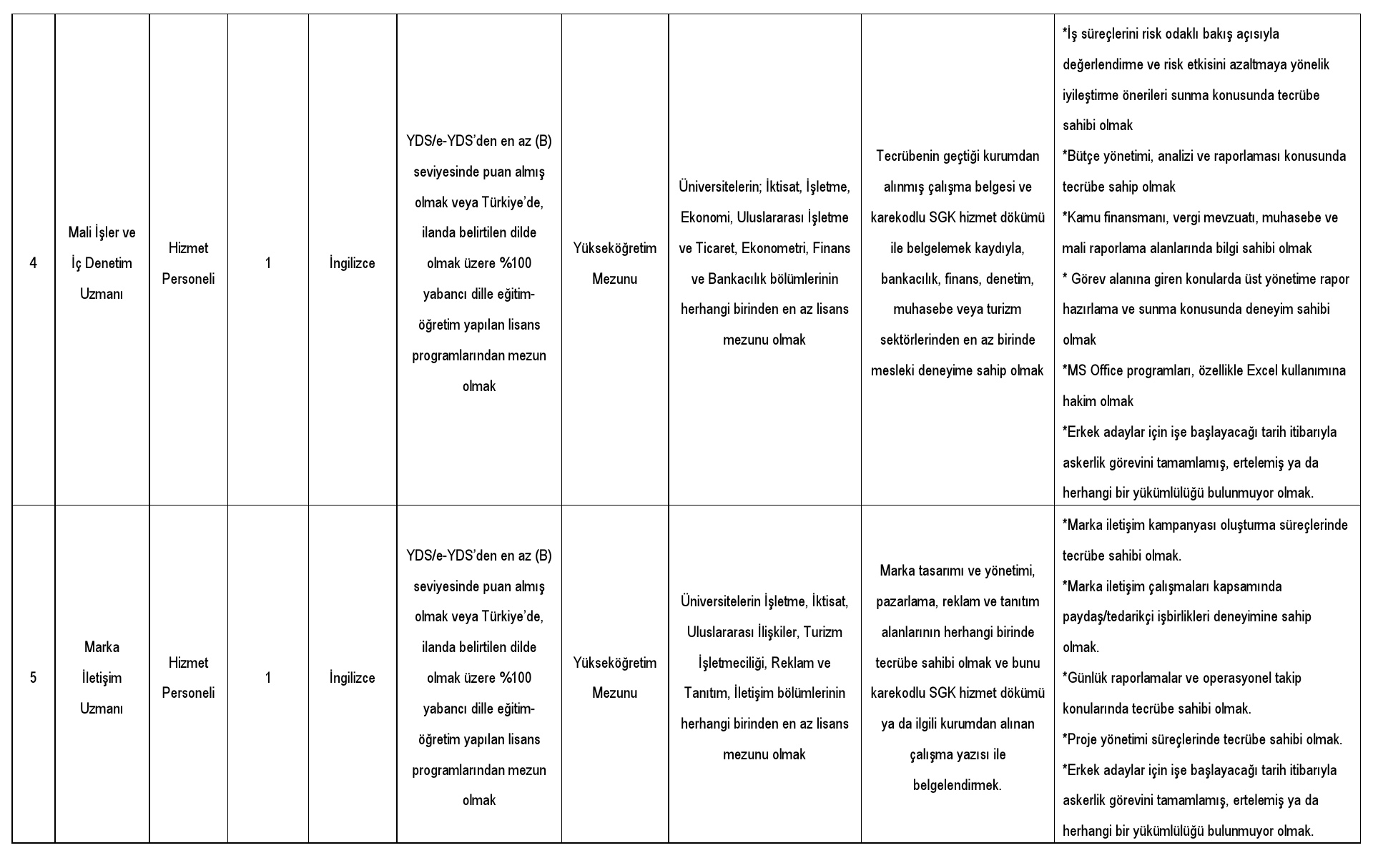 30.01.2024 tarihli ve 32445 sayılı Türkiye Turizm Tanıtım ve Geliştirme Ajansı Personelinin Görev, Yetki ve Sorumlulukları İle İşe Alınmalarına İlişkin Usul ve Esaslar Hakkında Yönetmelik hükümleri uyarınca; başvuracak adaylarda aranılan nitelikler ile 30.01.2024 tarihli ve 32445 sayılı Türkiye Turizm Tanıtım Ve Geliştirme Ajansı Personelinin Görev, Yetki Ve Sorumlulukları İle İşe Alınmalarına İlişkin Usul Ve Esaslar Hakkında Yönetmelik'in 11. maddesindeki genel şartlar ve ilan edilen pozisyon için belirtilen özel şartlar;