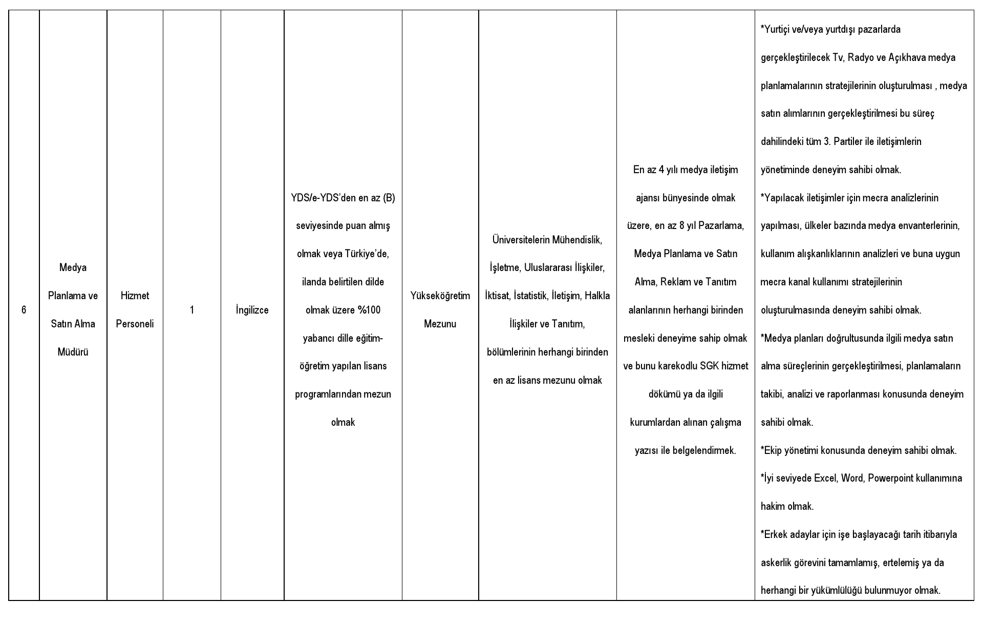 11/07/2019 tarihli ve 7183 sayılı Kanun ile kurulan Türkiye Turizm Tanıtım ve Geliştirme Ajansı (TGA), 30.01.2024 tarihli ve 32445 sayılı Türkiye Turizm Tanıtım ve Geliştirme Ajansı Personelinin Görev, Yetki ve Sorumlulukları İle İşe Alınmalarına İlişkin Usul ve Esaslar Hakkında Yönetmelik hükümleri uyarınca sözlü giriş sınavı ile 8 (sekiz) adet pozisyon için personel alımı yapacaktır. TGA Personel Alımı Kadroları ve Adaylarda Aranan Nitelikler Tablosu (Ek-1) ekte yer almaktadır.