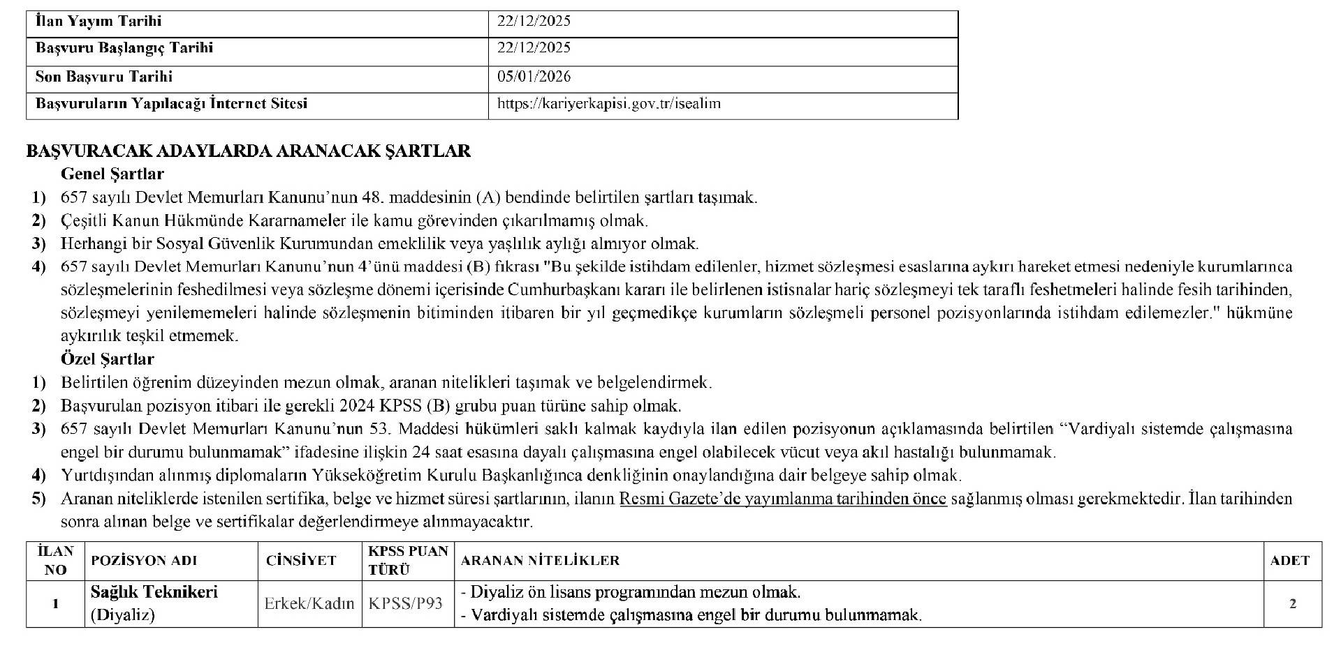 KPSS'de yüksek puan almak, ilanda yer alan sözleşmeli pozisyona yerleştirmede tek başına hak kazandırmaz. Pozisyon için belirtilen son başvuru tarihi itibarıyla aranan nitelikler ve genel şartlara sahip olmayan adaylar değerlendirmeye alınmayacaktır.
