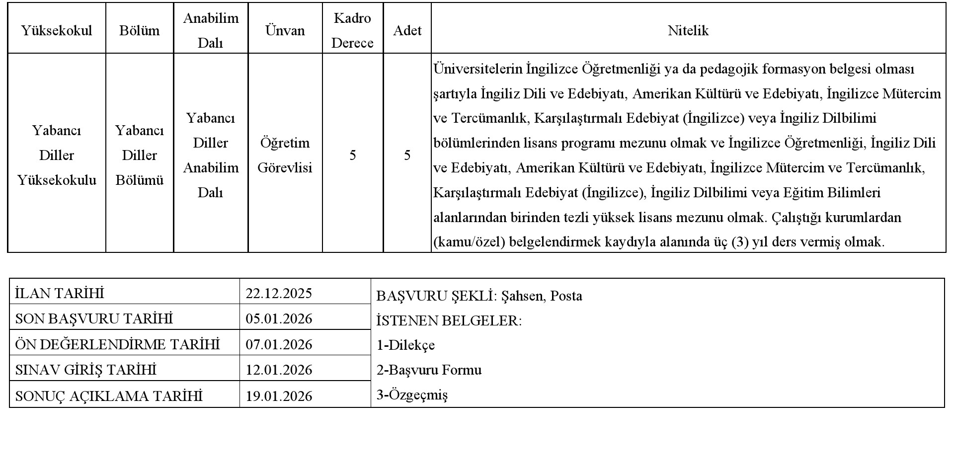Üniversitemizin aşağıda belirtilen kadrolarına 2547 sayılı Kanunun ve Öğretim Üyesi Dışındaki Öğretim Elemanı Kadrolarına Yapılacak Atamalarda Uygulanacak Merkezi Sınav ile Giriş Sınavlarına İlişkin Usul ve Esaslar Hakkında Yönetmelik'in ilgili maddeleri uyarınca öğretim elemanı alınacaktır.