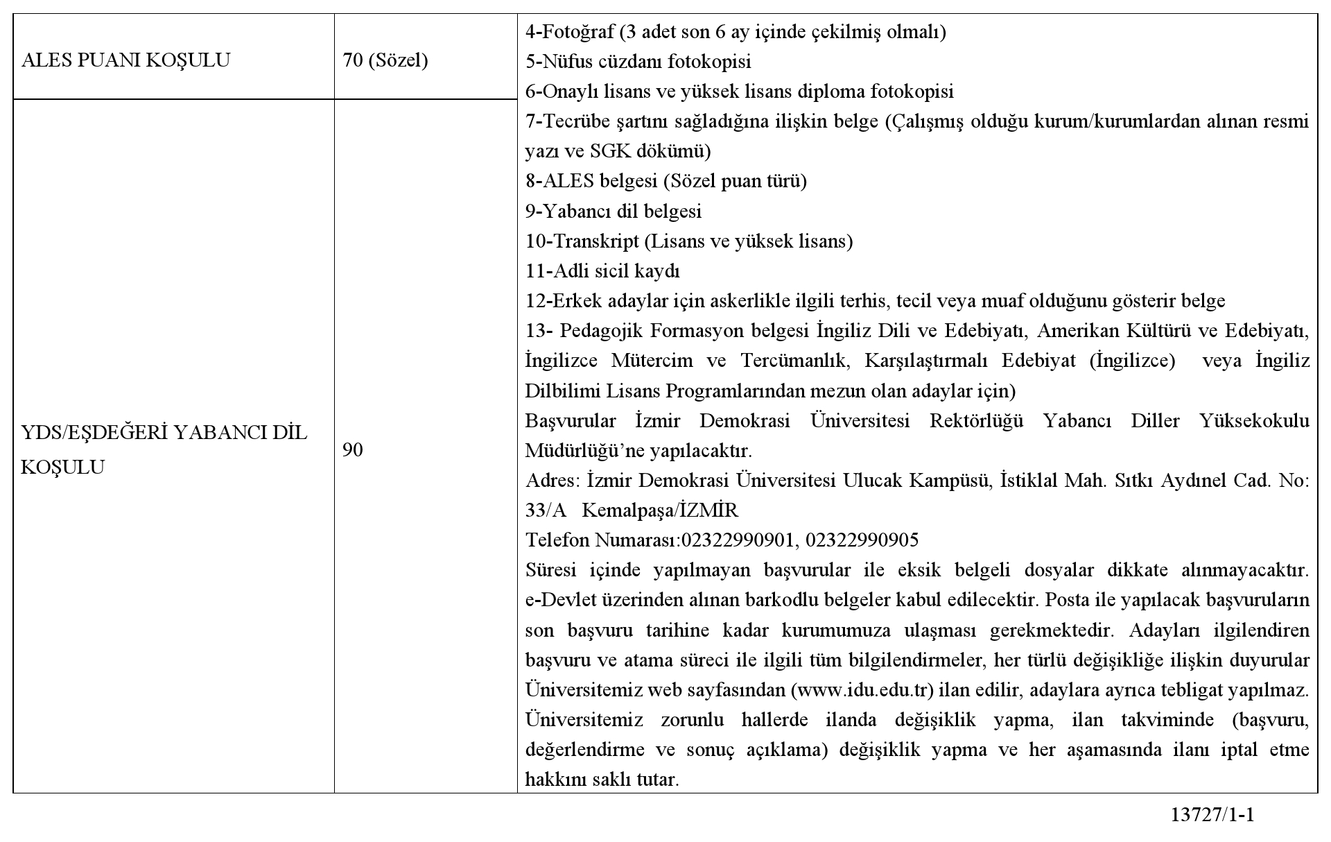 İzmir Demokrasi Üniversitesi Öpretim Elemanı Alım İlanı