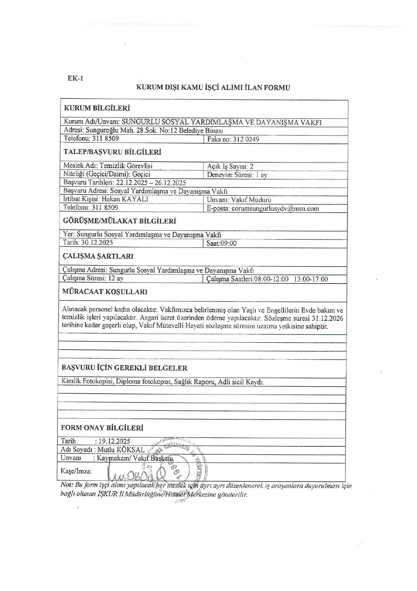 Çorum Sungurlu SYDV Geçici 2 İşçi Alacak. Son başvuru tarihi 26 Aralık 2025