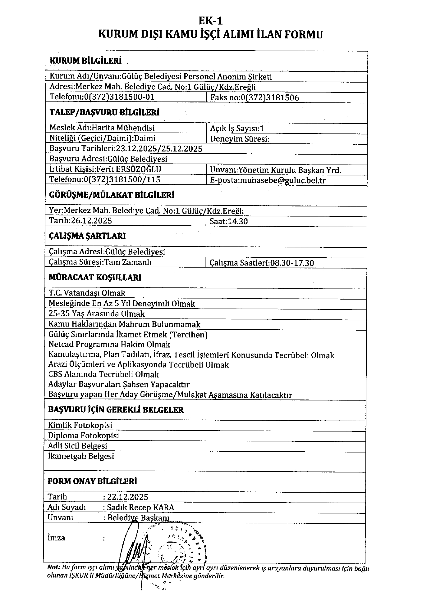 Ana sayfaDaimi İşçi İlanları Kdz Ereğli Gülüç Belediyesi 1 İşçi Alacak Kdz Ereğli Gülüç Belediyesi 1 İşçi Alacak. Son başvuru tarihi 25 Aralık 2025 Kaynak : İşkur İlan Giriş : 22 Aralık 2025 23:29, Son Güncelleme : 22 Aralık 2025 23:31 Yazdır Yorumlar (0) Abone Ol