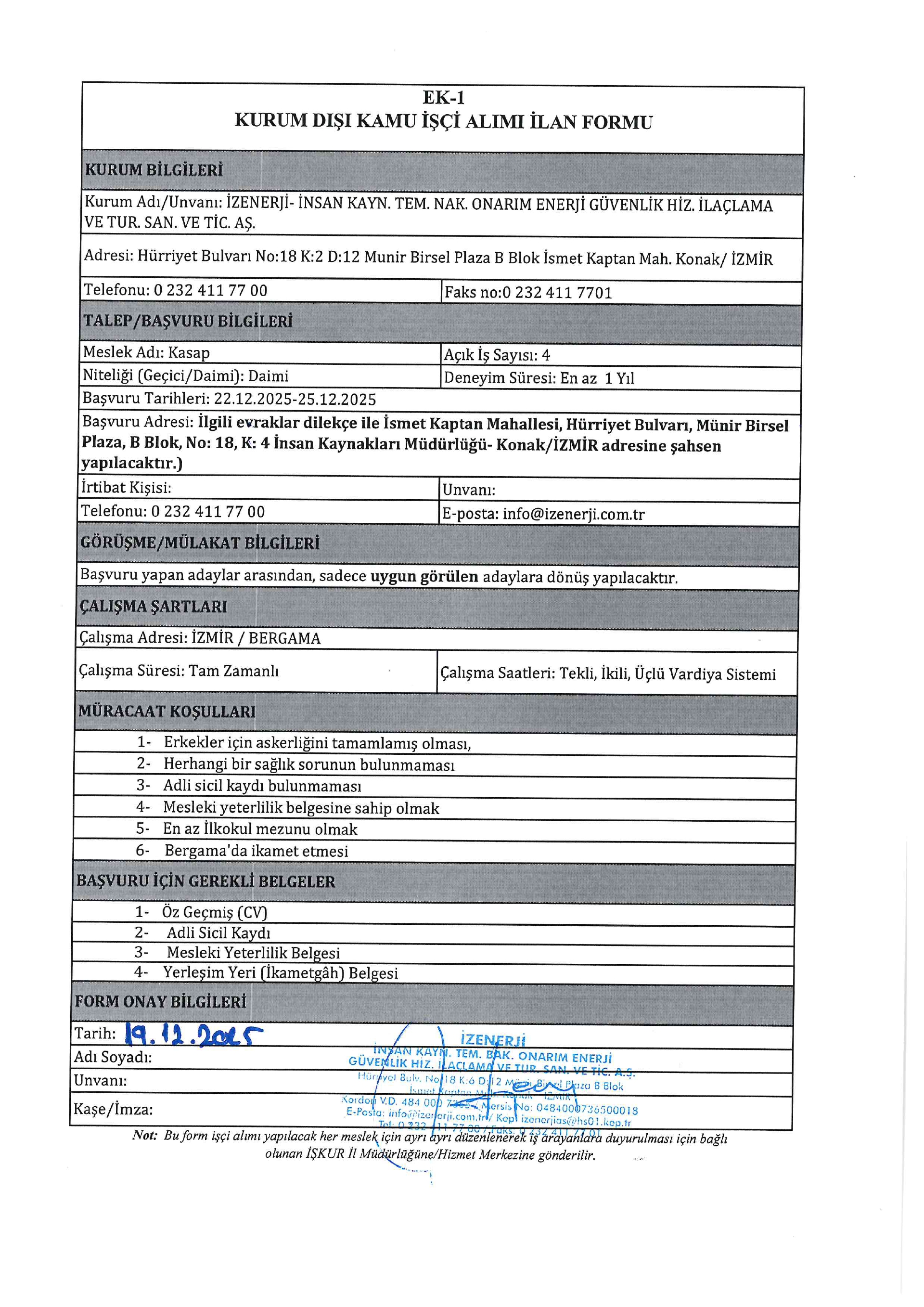 Ana sayfaDaimi İşçi İlanları İzmir İzenerji 4 İşçi Alacak İzmir İzenerji 4 İşçi Alacak. Son başvuru tarihi 25 Aralık 2025 Kaynak : İşkur İlan Giriş : 22 Aralık 2025 23:38, Son Güncelleme : 22 Aralık 2025 23:28 Yazdır Yorumlar (0) Abone Ol