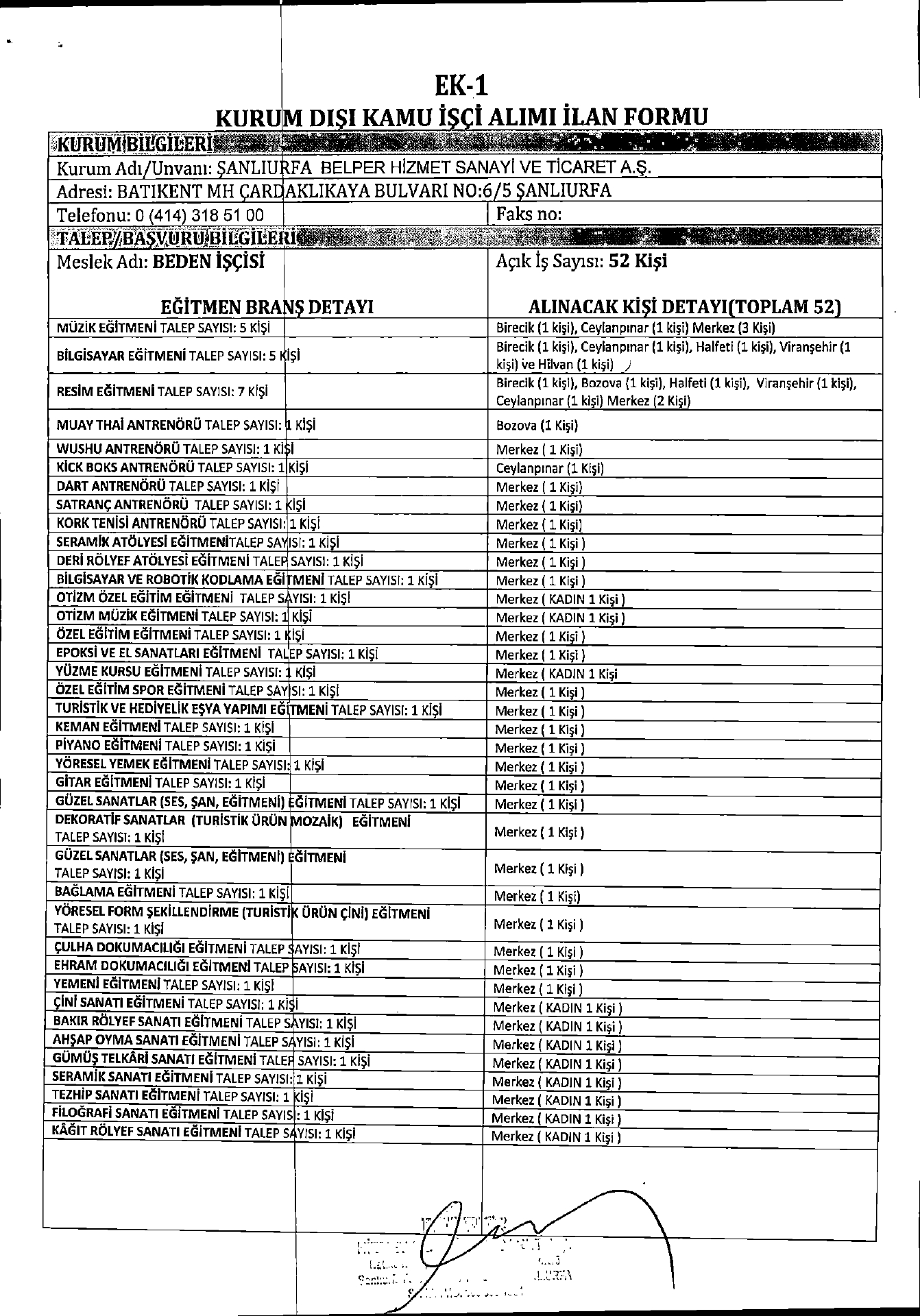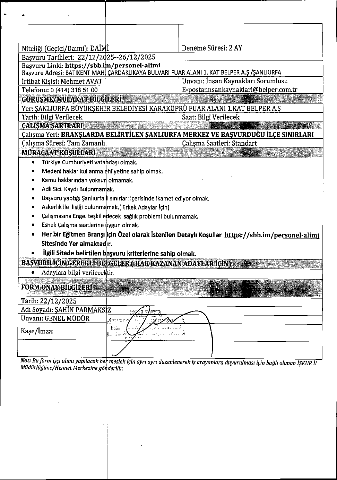 Ana sayfaDaimi İşçi İlanları Şanlıurfa Belper Hizmet 52 İşçi Alacak Şanlıurfa Belper Hizmet 52 İşçi Alacak. Son başvuru tarihi 26 Aralık 2025 Kaynak : İşkur İlan Giriş : 22 Aralık 2025 23:53, Son Güncelleme : 22 Aralık 2025 23:22 Yazdır Yorumlar (0) Abone Ol