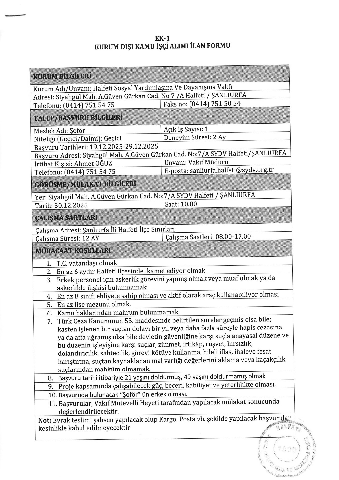 Ana sayfaSYDV İlanlarıAna sayfaGeçici İşçi İlanları Şanlıurfa Halfeti SYDV Geçici 1 İşçi Alacak Şanlıurfa Halfeti SYDV Geçici 1 İşçi Alacak. Son başvuru tarihi 29 Aralık 2025 Kaynak : İşkur İlan Giriş : 22 Aralık 2025 23:56, Son Güncelleme : 22 Aralık 2025 23:21 Yazdır Yorumlar (0) Abone Ol