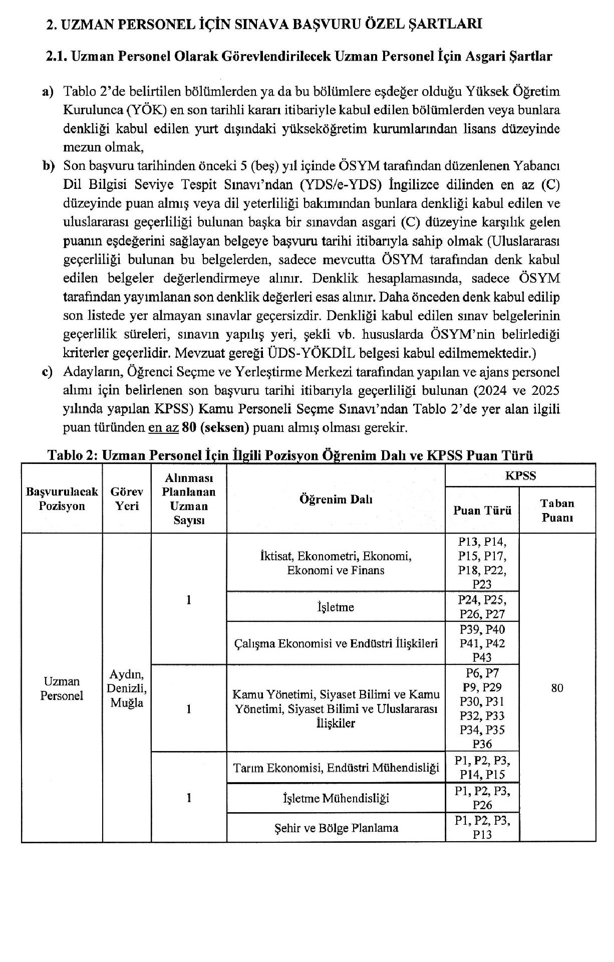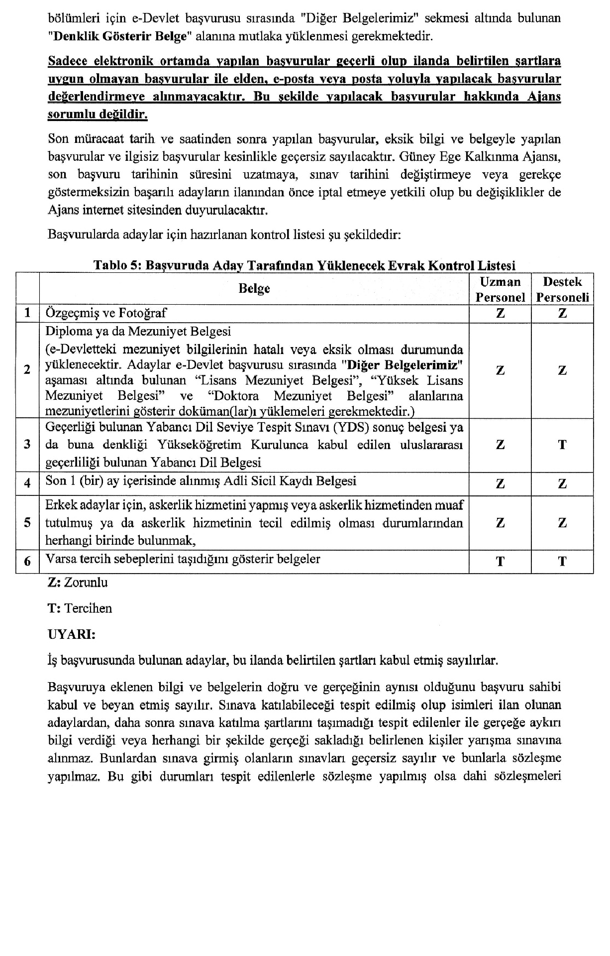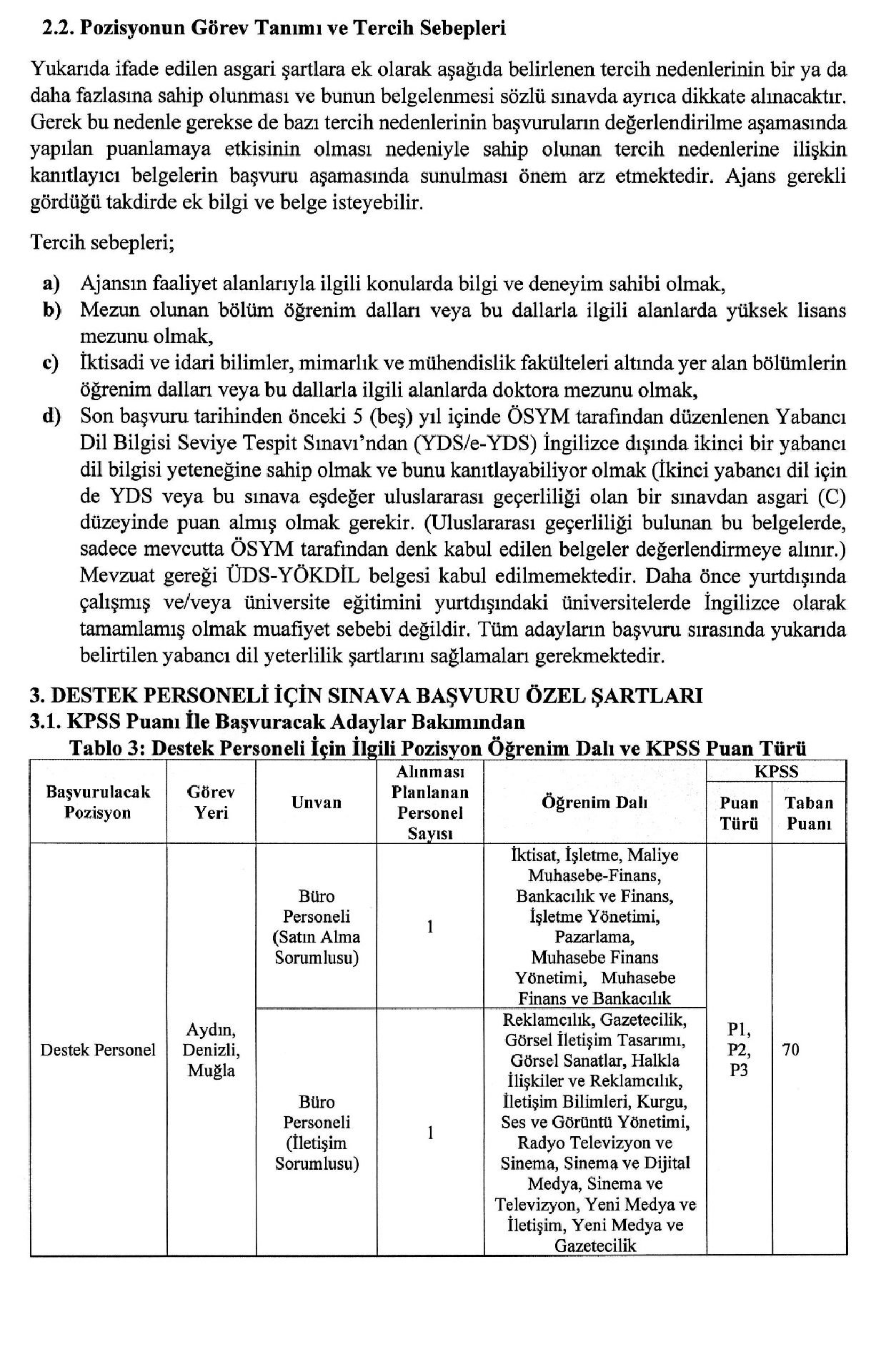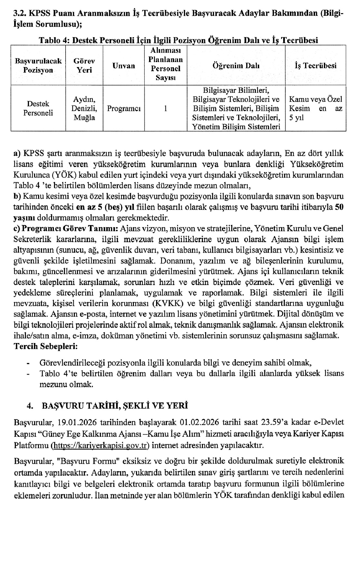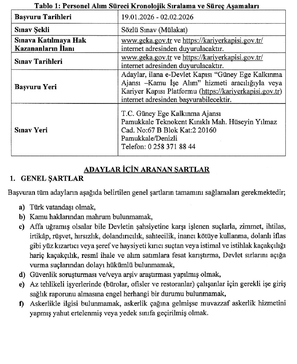 Aydın, Denizli ve Muğla illerini kapsayan Güney Ege Kalkınma Ajansı, 4 sayılı Bakanlıklara Bağlı, İlgili, İlişkili Kurum ve Kuruluşlar İle Diğer Kurum ve Kuruluşların Teşkilatı Hakkında Cumhurbaşkanlığı Kararnamesi ve Kalkınma Ajansları Personel Yönetmeliği hükümleri çerçevesinde; 3 (üç) uzman personel ile 3 (üç) destek personeli (1 programcı, 2 büro görevlisi) olmak üzere toplam 6 (altı) personel alımı yapacaktır. T.C. Güney Ege Kalkınma Ajansı'nın merkezi Denizli ili olup Ajansın faaliyet alanına Aydın, Denizli ve Muğla illeri girmektedir. Bu nedenle, personel alım ilanına başvuran ve sınavda başarılı olan adaylar bu illerden AjansTn uygun göreceği herhangi birinde çalışmayı kabul ve taahhüt etmiş sayılırlar.