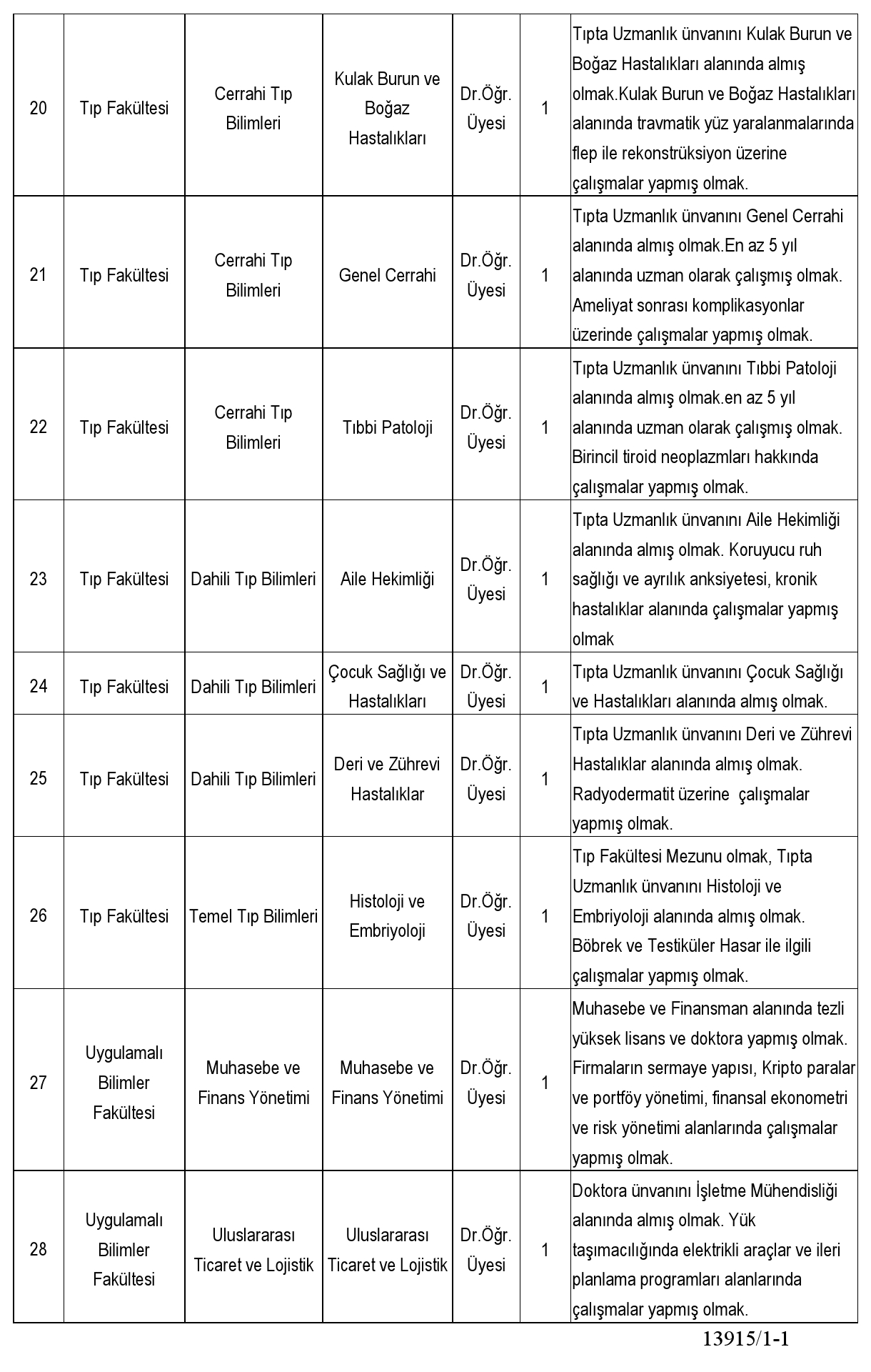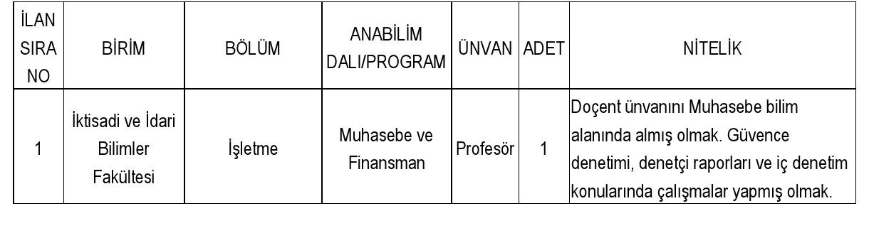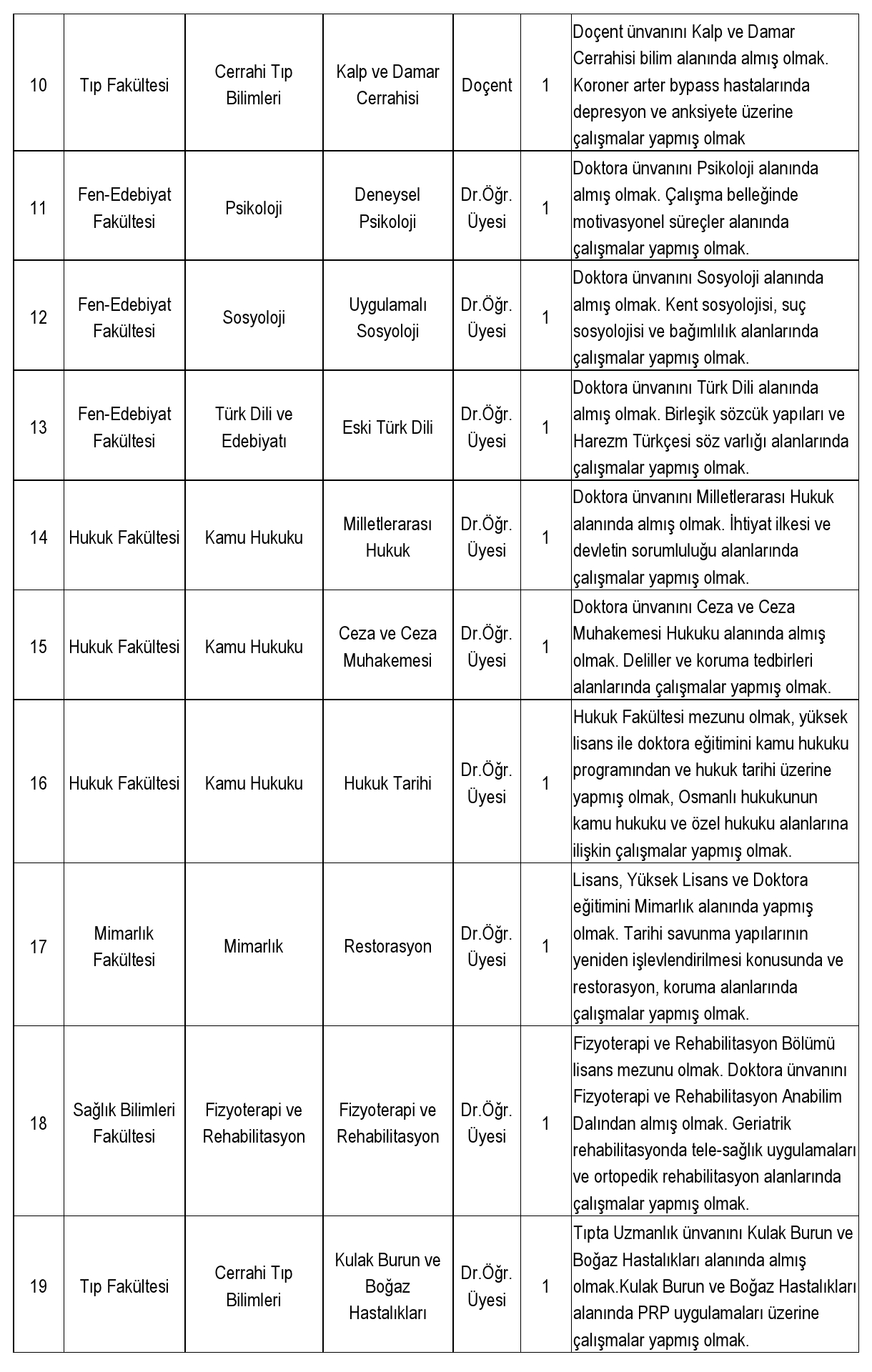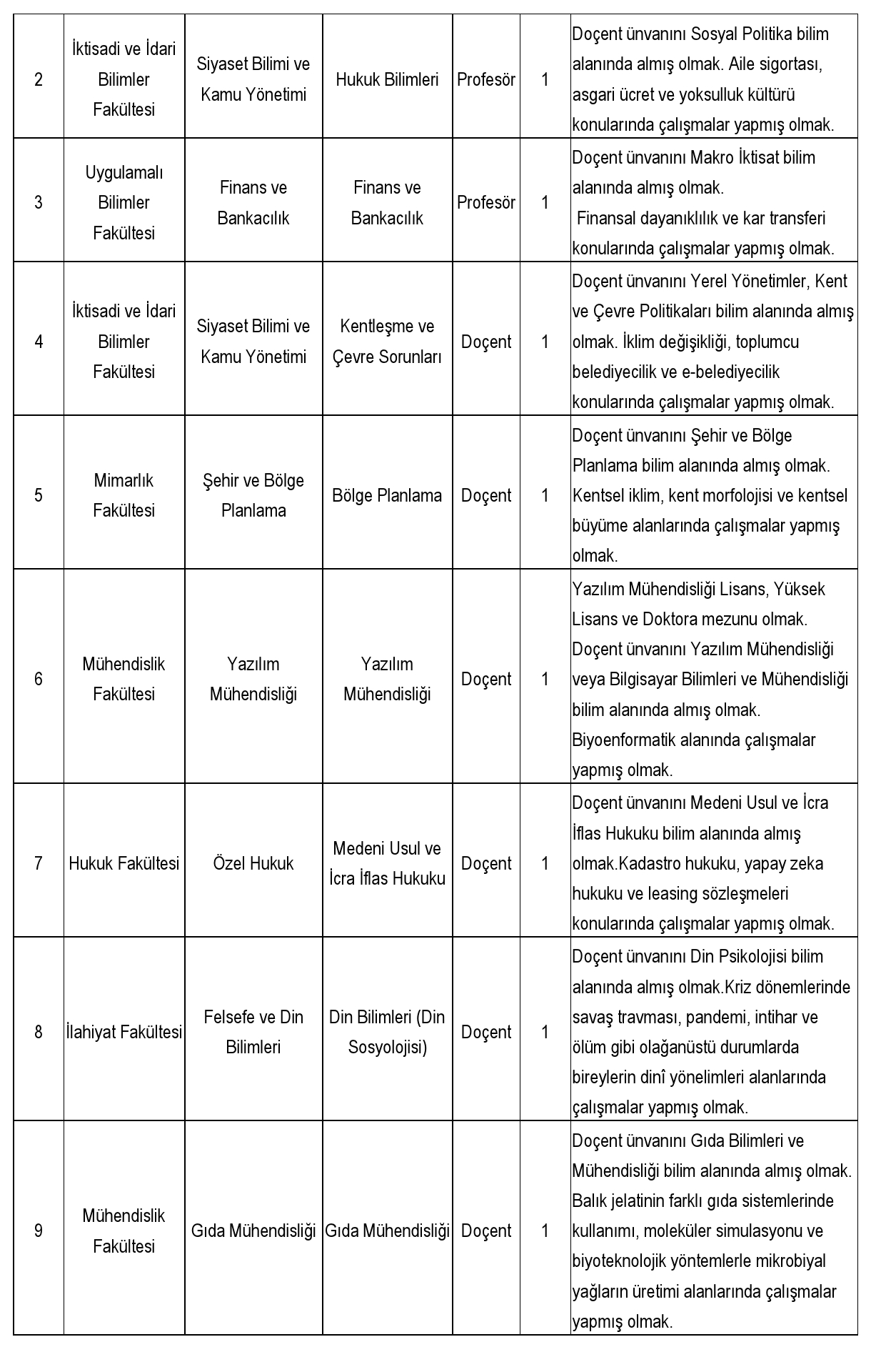 Üniversitemiz birimlerinde açık bulunan ve aşağıda bölümleri/anabilim dalları-programları ile unvan ve koşulları belirtilen kadrolara 2547 sayılı Kanun'un ilgili maddeleri ile 657 sayılı Devlet Memurları Kanunu'nun 48. maddesi, Devlet Yükseköğretim Kurumlarında Öğretim Elemanı Norm Kadrolarının Belirlenmesine ve Kullanılmasına İlişkin Yönetmelik, Öğretim Üyeliğine Yükseltilme ve Atanma Yönetmeliği ve Üniversitemiz Öğretim Üyeliğine Yükseltilme ve Atanma Kriterlerine göre öğretim üyesi alınacaktır.
