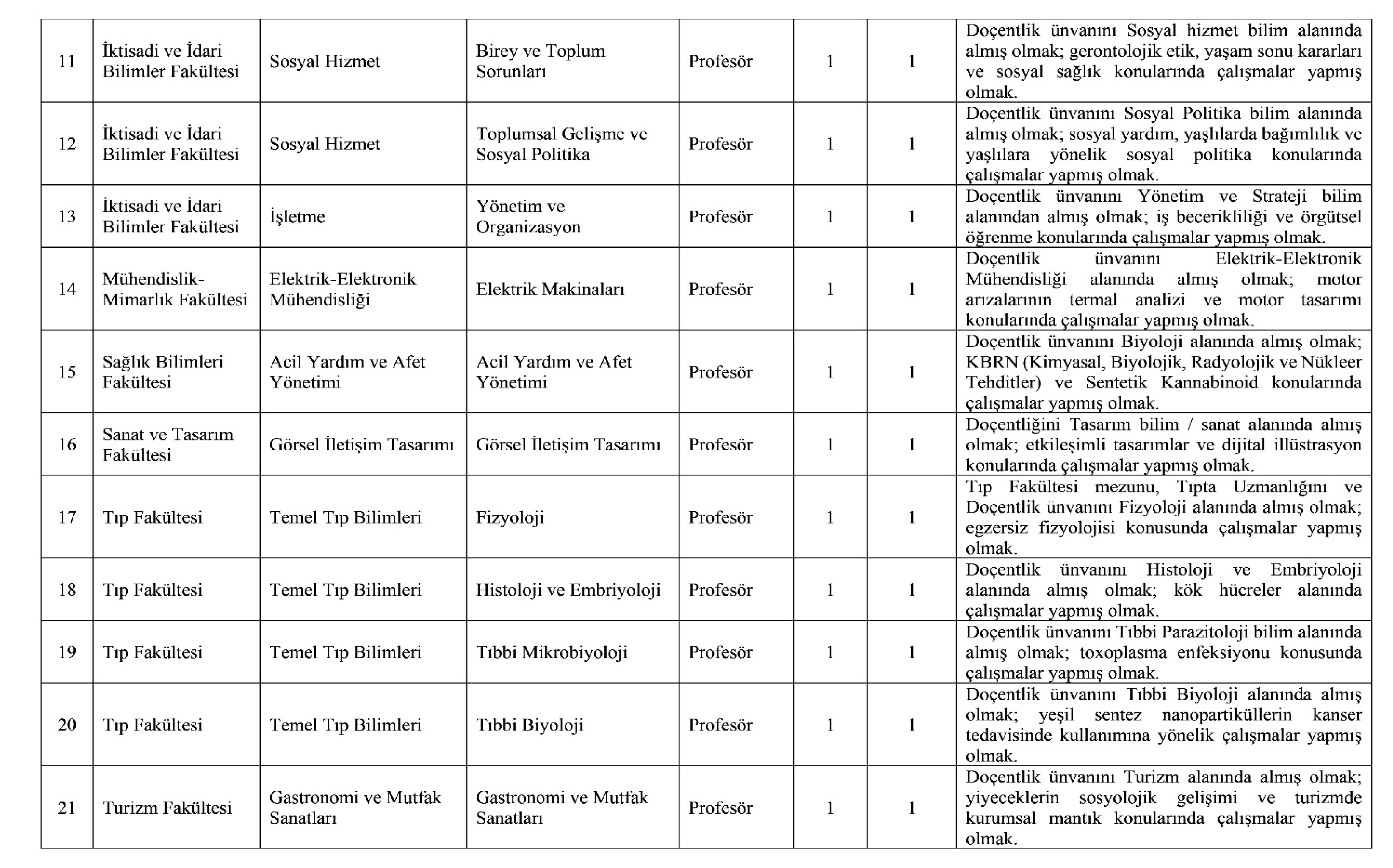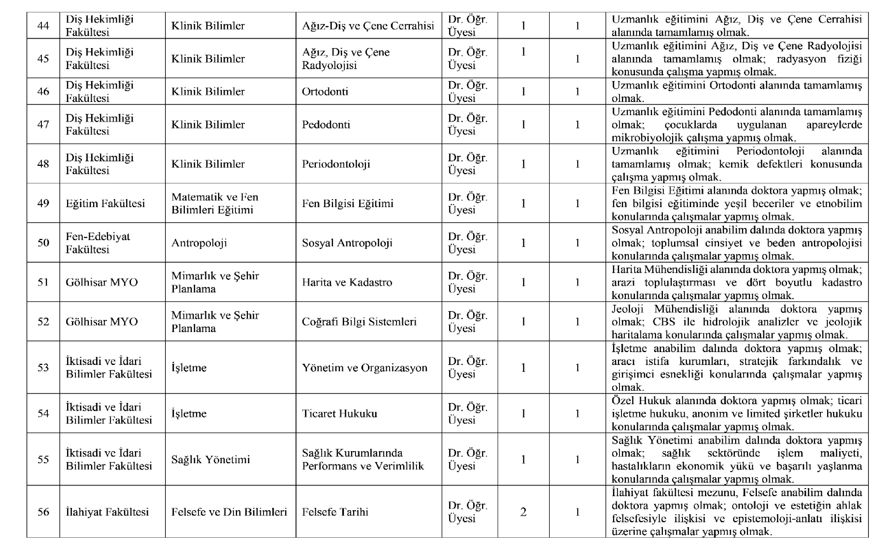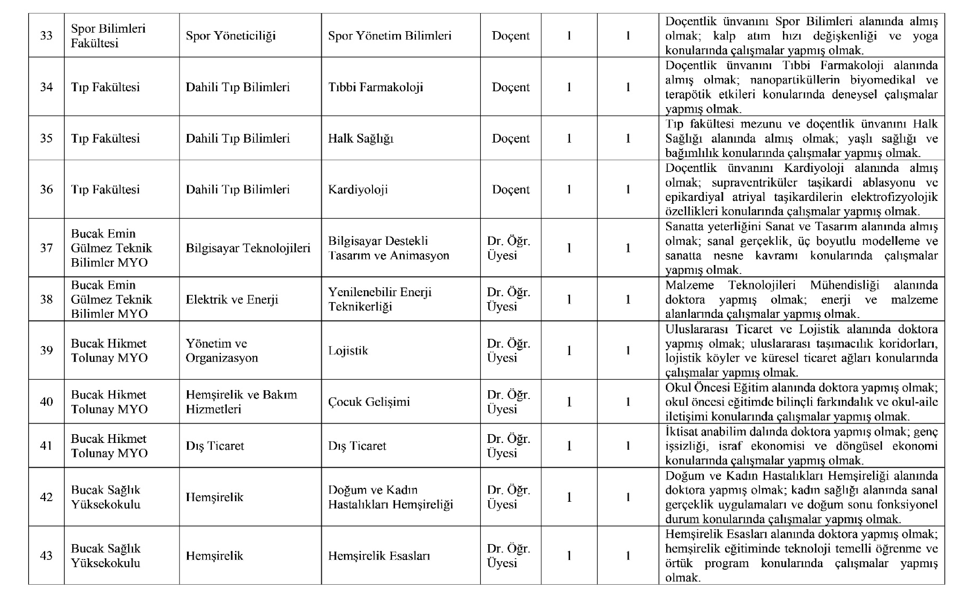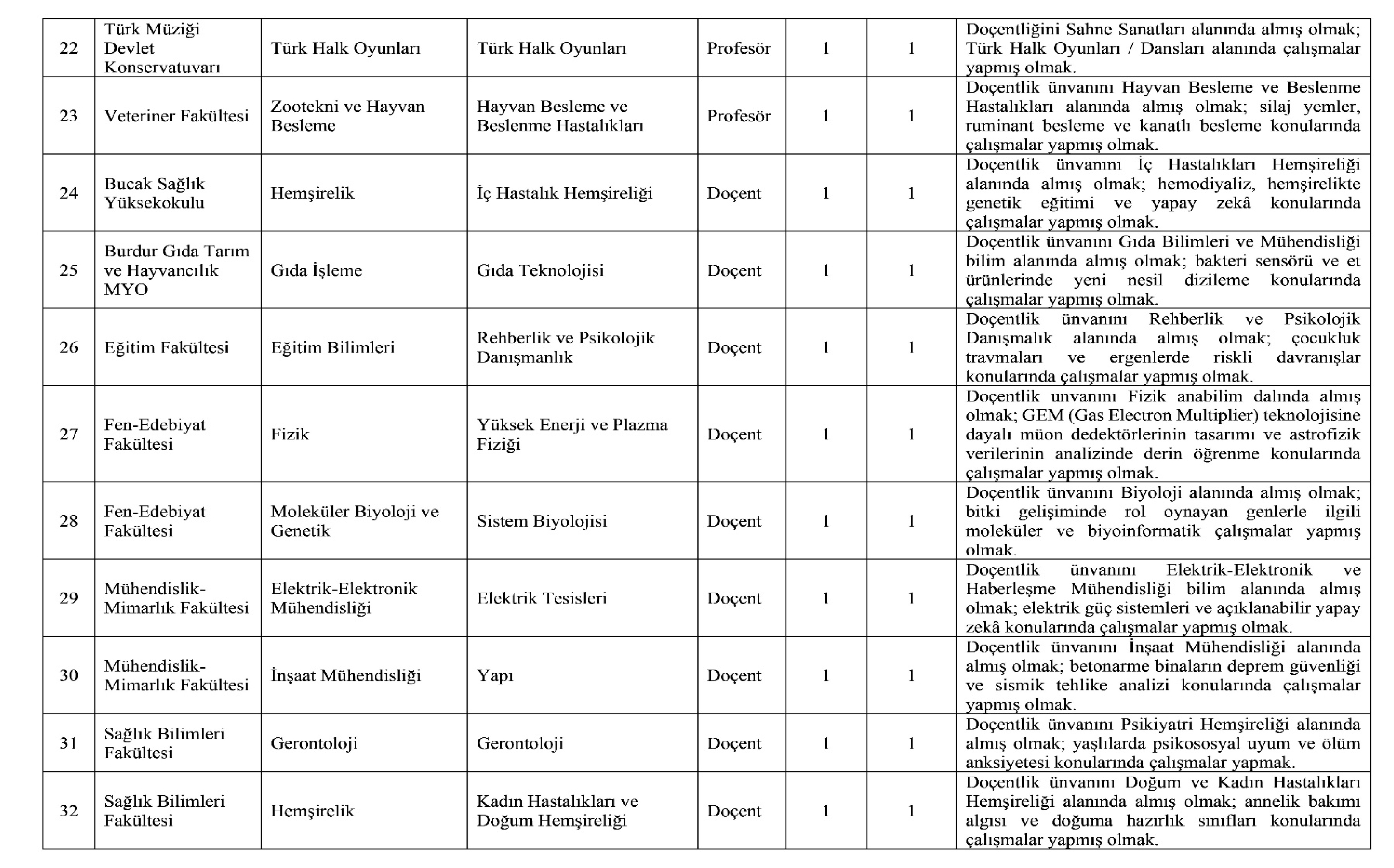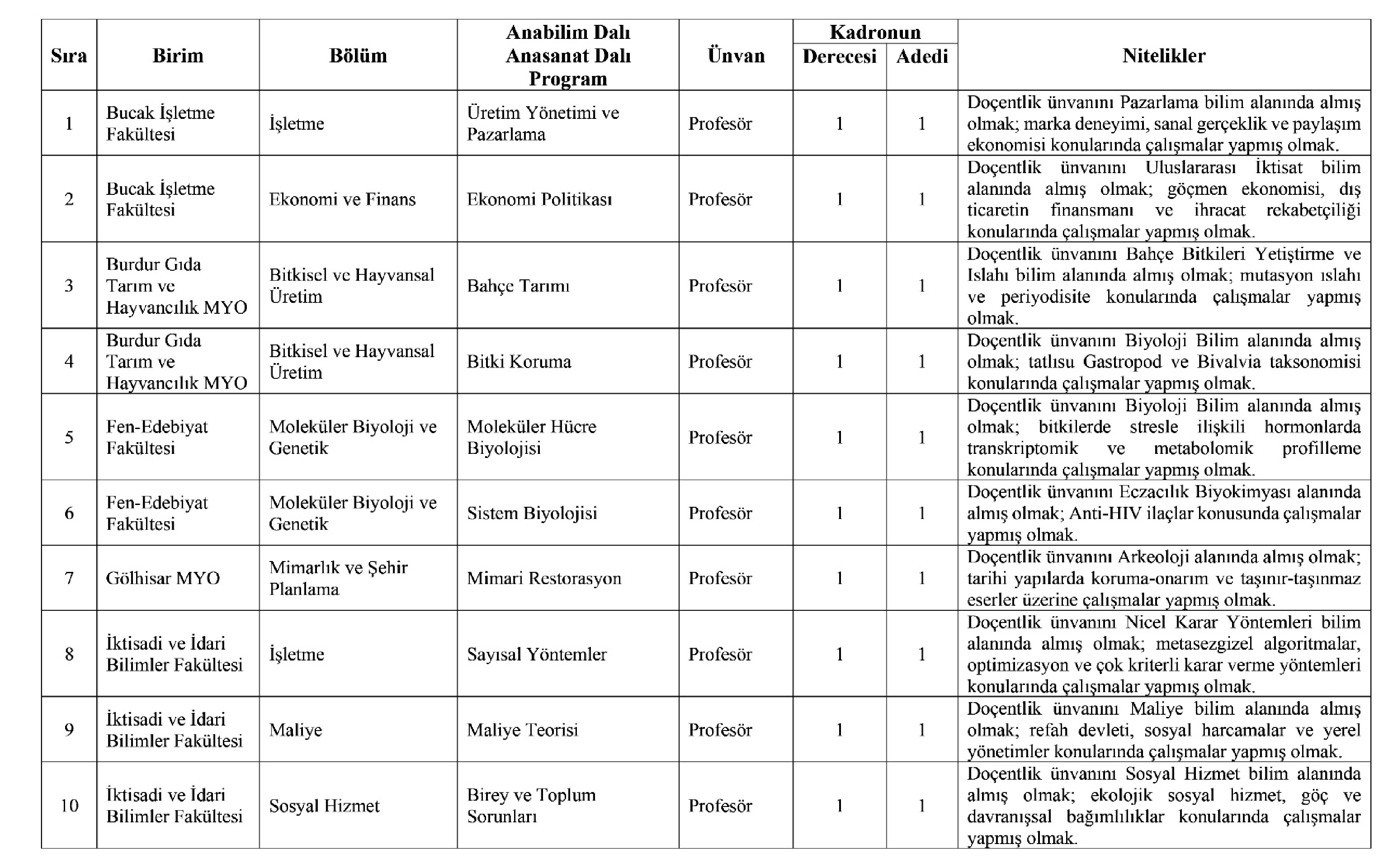 2 Kasım 2018 tarihli ve 30583 sayılı Resmi Gazete'de yayımlanan "Devlet Yükseköğretim Kurumlannda Öğretim Elemanı Norm Kadrolarının Belirlenmesine ve Kullanılmasına İlişkin Yönetmelik" kapsamında. Üniversitemiz çeşitli birimlerine; 2547 sayılı Yükseköğretim Kanunu, 2914 sayılı Yükseköğretim Personel Kanunu, Öğretim Üyeliğine Yükseltilme ve Atanma Yönetmeliği ve Burdur Mehmet Akif Ersoy Üniversitesi Öğretim Üyeliği Kadrolarına Başvuru Koşulları ve Uygulama İlkeleri Hakkında Yönergesinin (Bknz: Genel Açıklamalar 14. madde) ilgili hükümleri uyarınca öğretim üyesi alınacaktır.