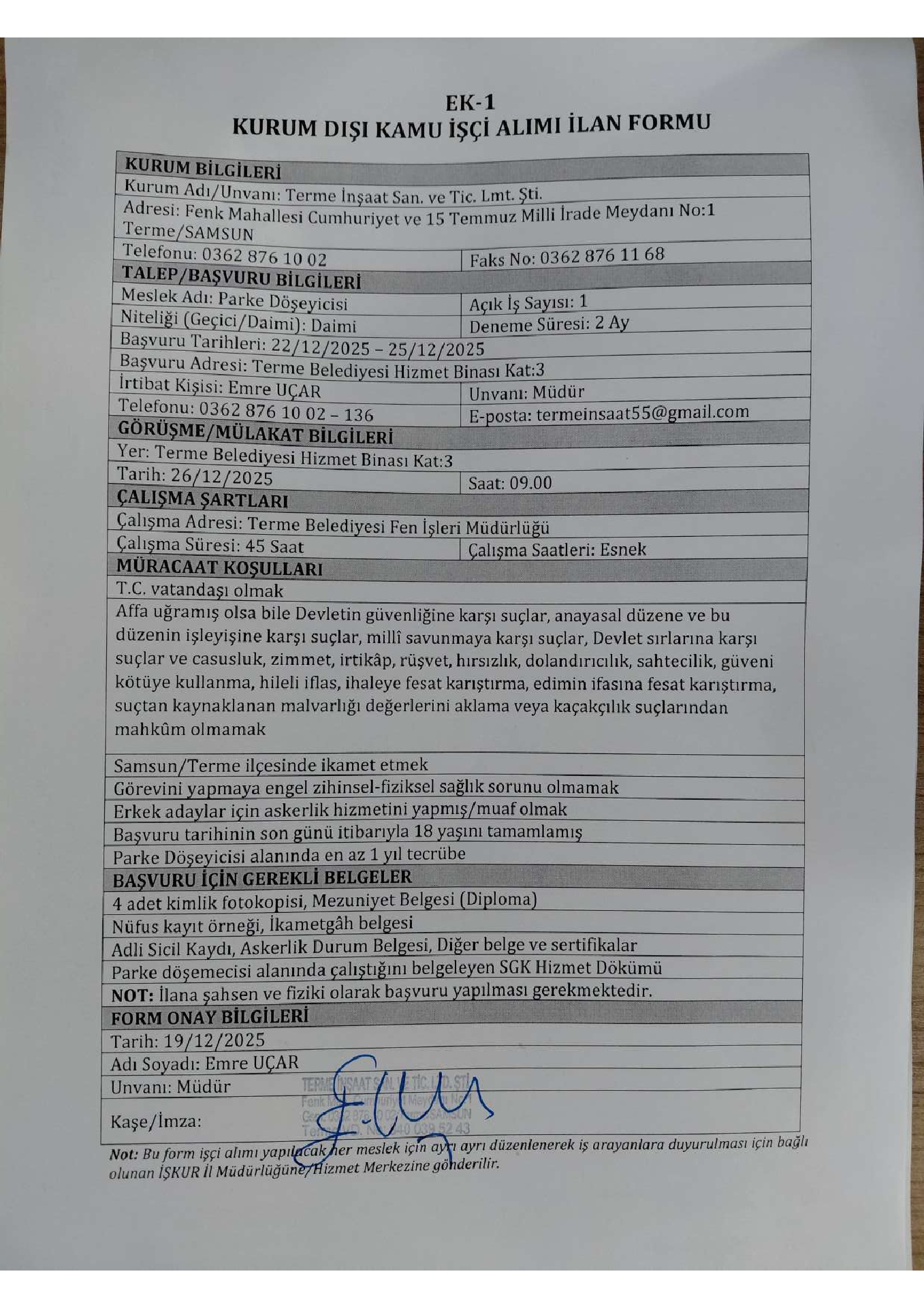 Ana sayfaDaimi İşçi İlanları Samsun Terme İnşaat 1 İşçi Alacak Samsun Terme İnşaat 1 İşçi Alacak. Son başvuru tarihi 25 Aralık 2025 Kaynak : İşkur İlan Giriş : 23 Aralık 2025 22:43, Son Güncelleme : 23 Aralık 2025 22:32 Yazdır Yorumlar (0) Abone Ol