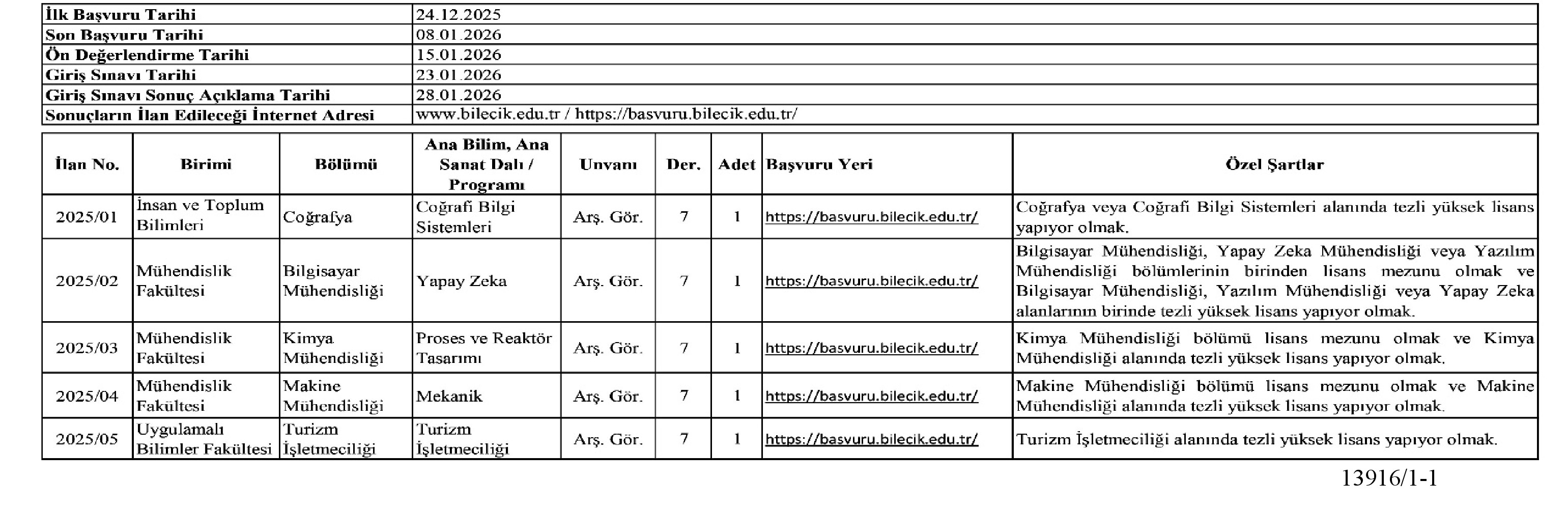 - Nihai sonuçlara göre ataması yapılacak asıl ve yedek aday duyuruları Üniversitemiz resmi web sayfasında (www.bilecik.edu.tr) ve https://basvuru.bilecik.edu.tr/ adresli ilan sayfamızda yayımlanacak olup bu duyurular tebligat niteliği taşımaktadır. Ayrıca bir tebligat yapılmayacaktır.