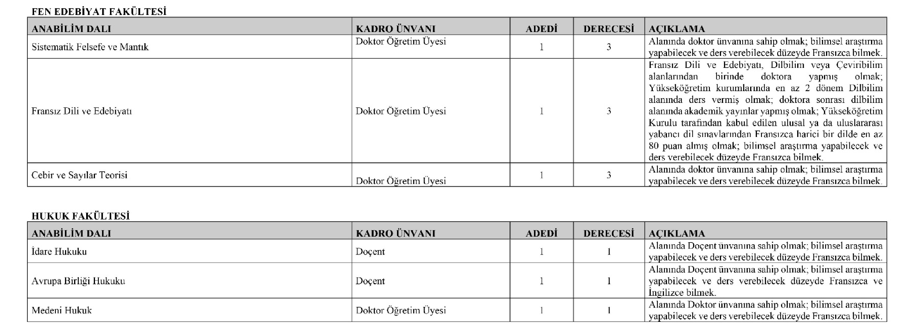 2547 sayılı Yükseköğretim Kamum'nun ilgili maddeleri ve Öğretim Üyeliğine Yükseltilme ve Atanma Yönetmeliği uyarınca Üniversitemizin çeşitli birimlerindeki aşağıda unvanları gösterilen kadrolara öğretini üyesi alınacaktır. Adayların 657 sayılı Devlet Memurları Kanunu'nun 48. maddesindeki genel şartları ve "Galatasaray Üniversitesi Öğretim Üyeliğine Yükseltme ve Atama Yönergesi"nde belirtilen şartları haiz olmaları gerekmektedir.
