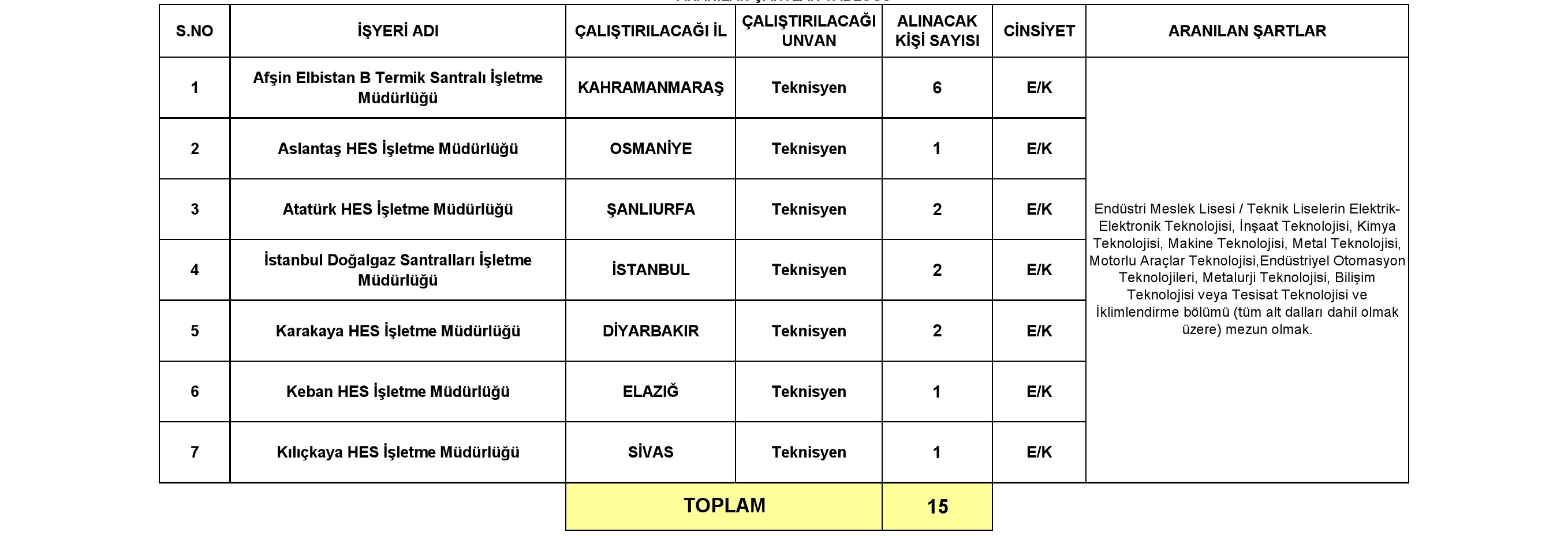 4857 SAYILI İŞ KANUNUNA TABİ DAİMİ İŞÇİ STATÜSÜNDE ÇALIŞTIRILMAK ÜZERE 15 ESKİ HÜKÜMÜ / TMY* ALIMI YAPILACAK İL VE İŞYERLERİ İLE İŞE ALINACAK KİŞİLERDE ARANILAN ŞARTLAR TABLOSU