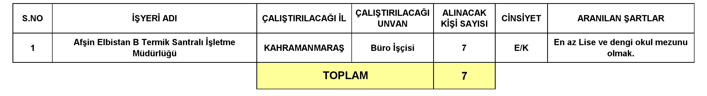 4857 SAYILI İŞ KANUNUNA TABİ DAİMİ İŞÇİ STATÜSÜNDE ÇALIŞTIRILMAK ÜZERE 7 ENGELLİ DAİMİ İŞÇİ ALIMI YAPILACAK İL VE İŞYERİ İLE İŞE ALINACAK KİŞİLERDE ARANILAN ŞARTLAR TABLOSU