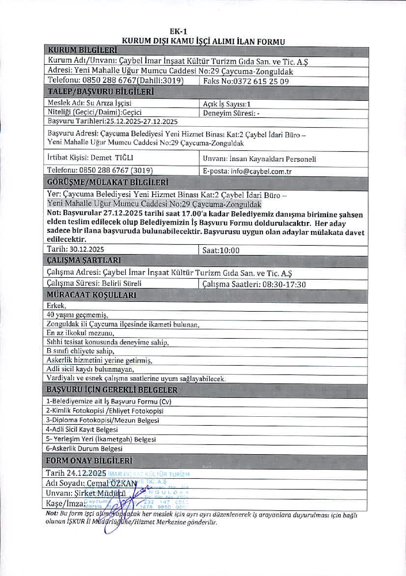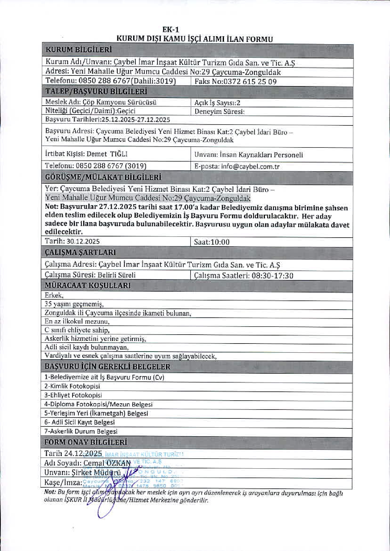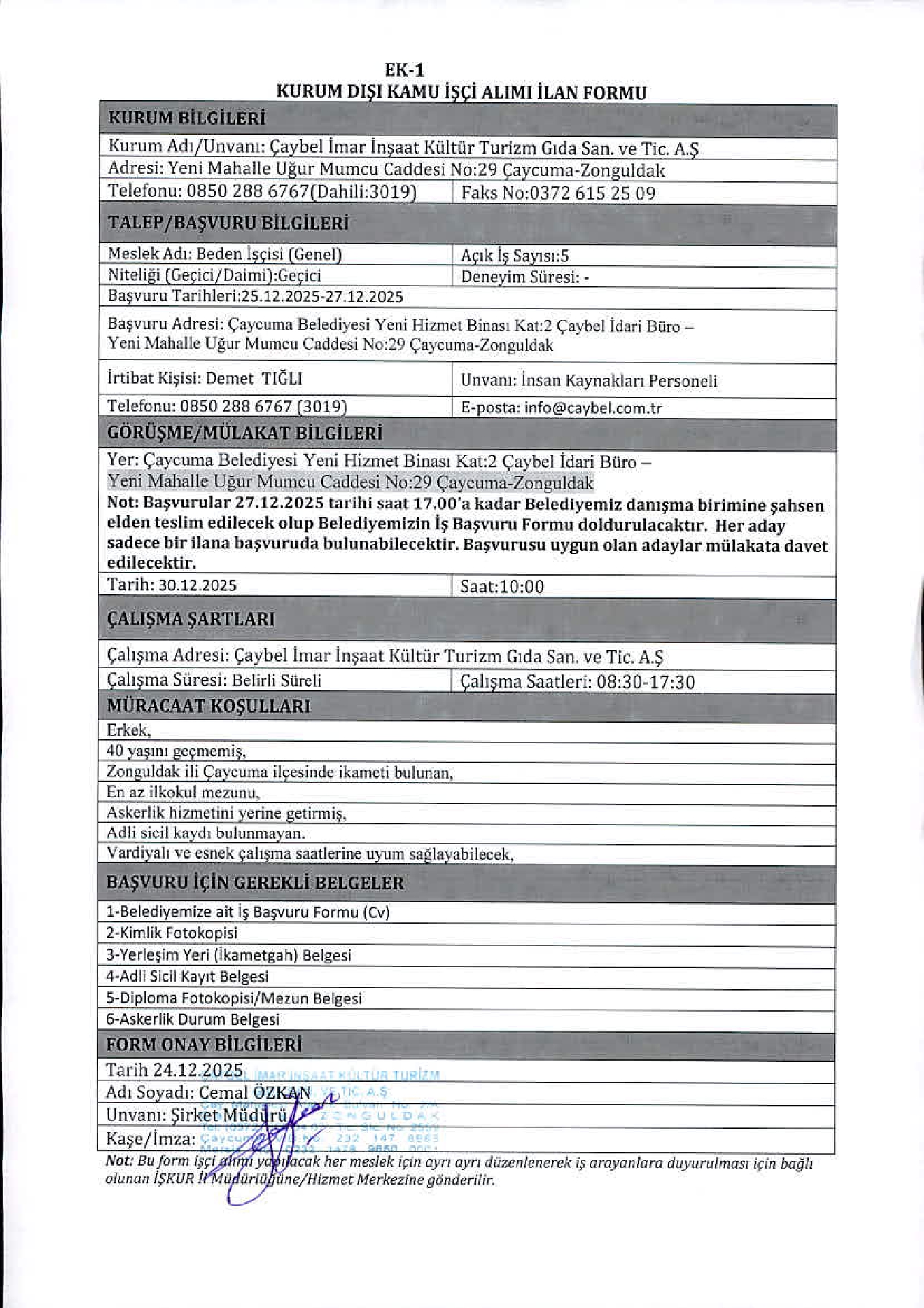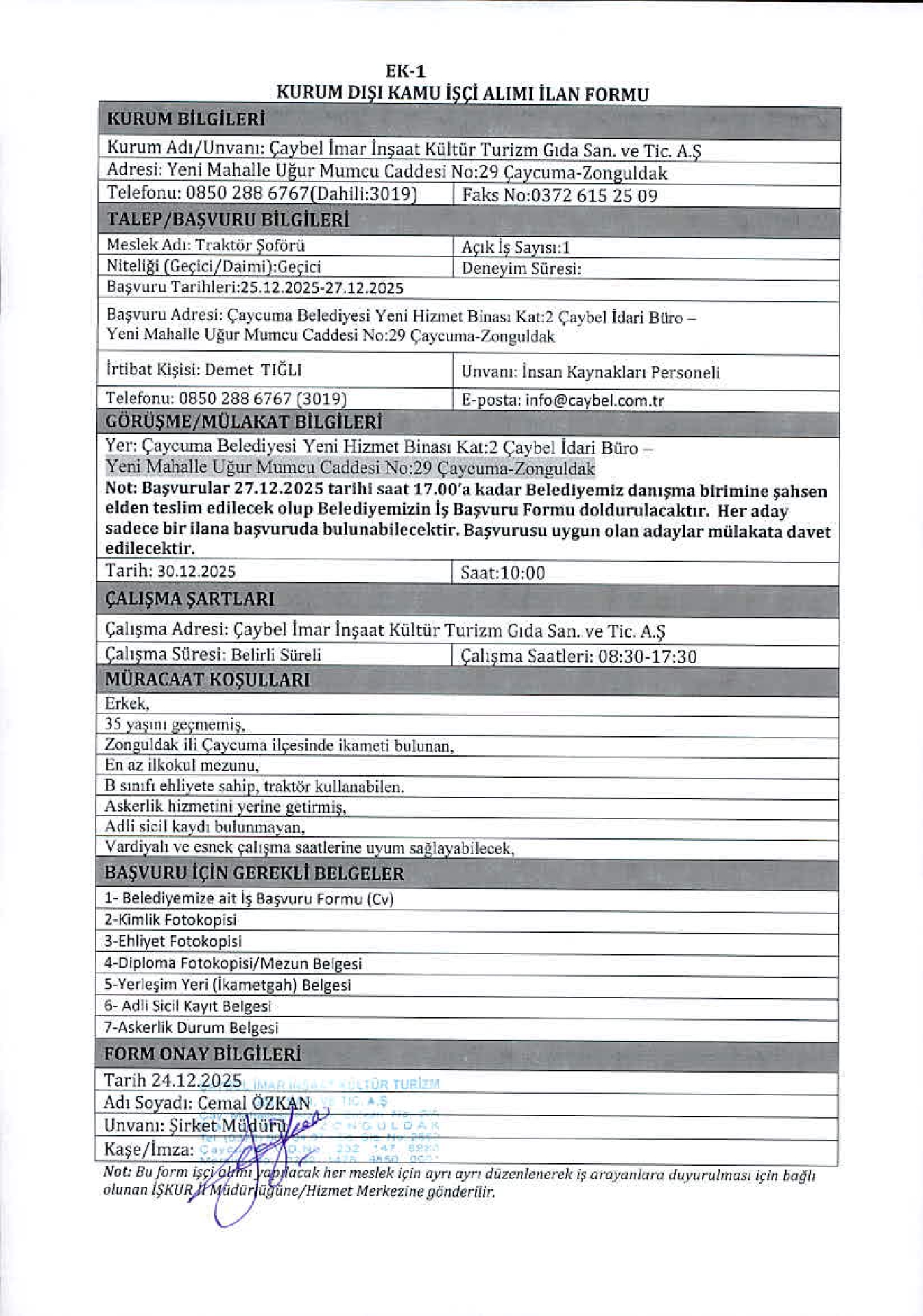 Ana sayfaGeçici İşçi İlanları Zonguldak Çaybel İmar Geçici 14 İşçi Alacak Zonguldak Çaybel İmar Geçici 14 İşçi Alacak. Son başvuru tarihi 27 Aralık 2025 Kaynak : İşkur İlan Giriş : 25 Aralık 2025 00:48, Son Güncelleme : 25 Aralık 2025 02:02 Yazdır Yorumlar (0) Abone Ol