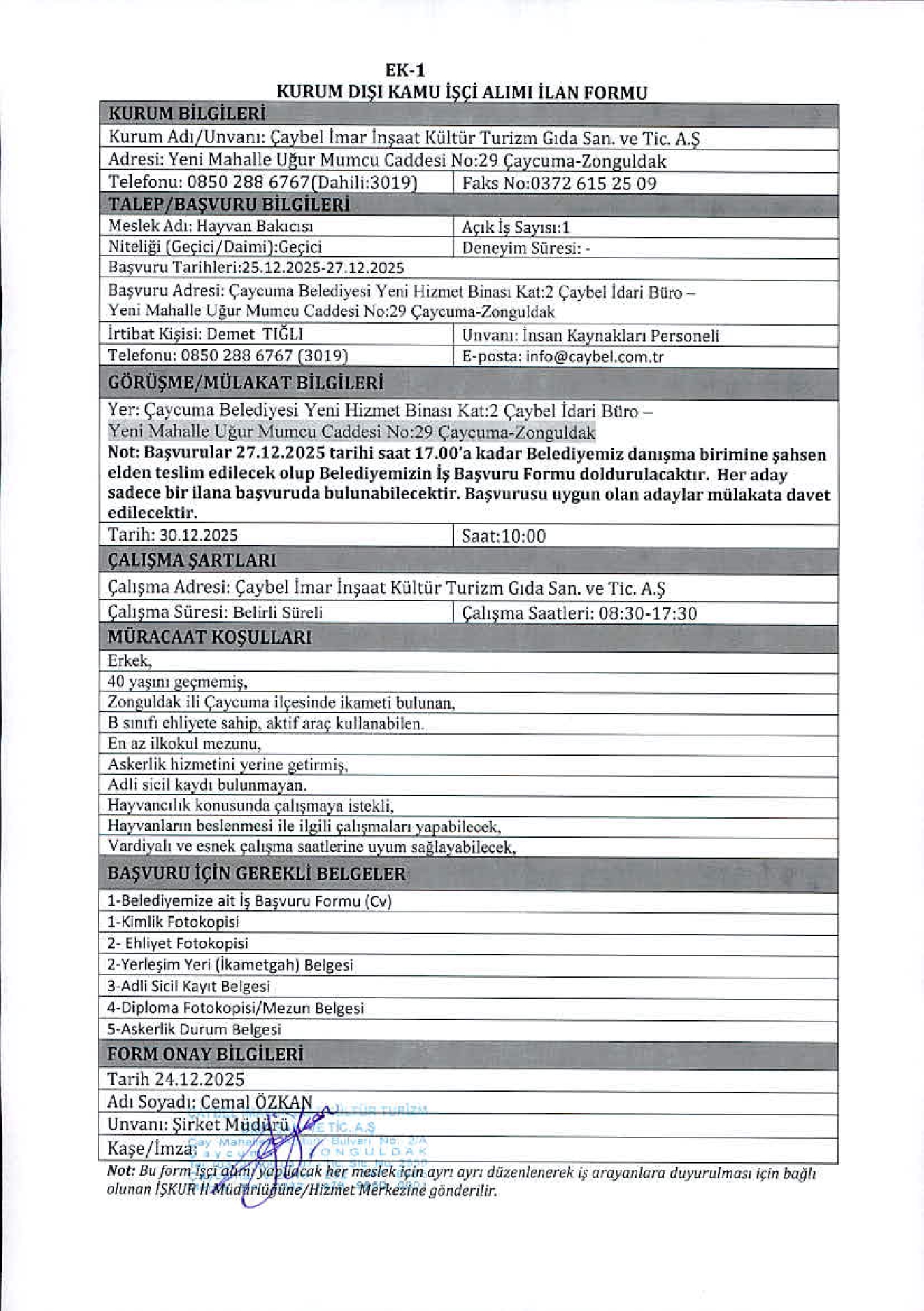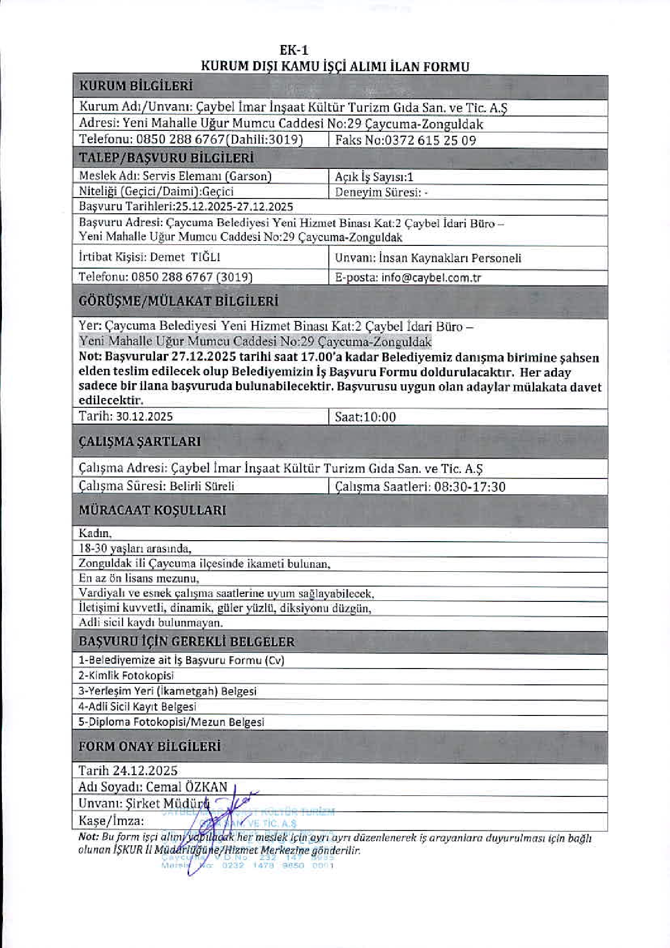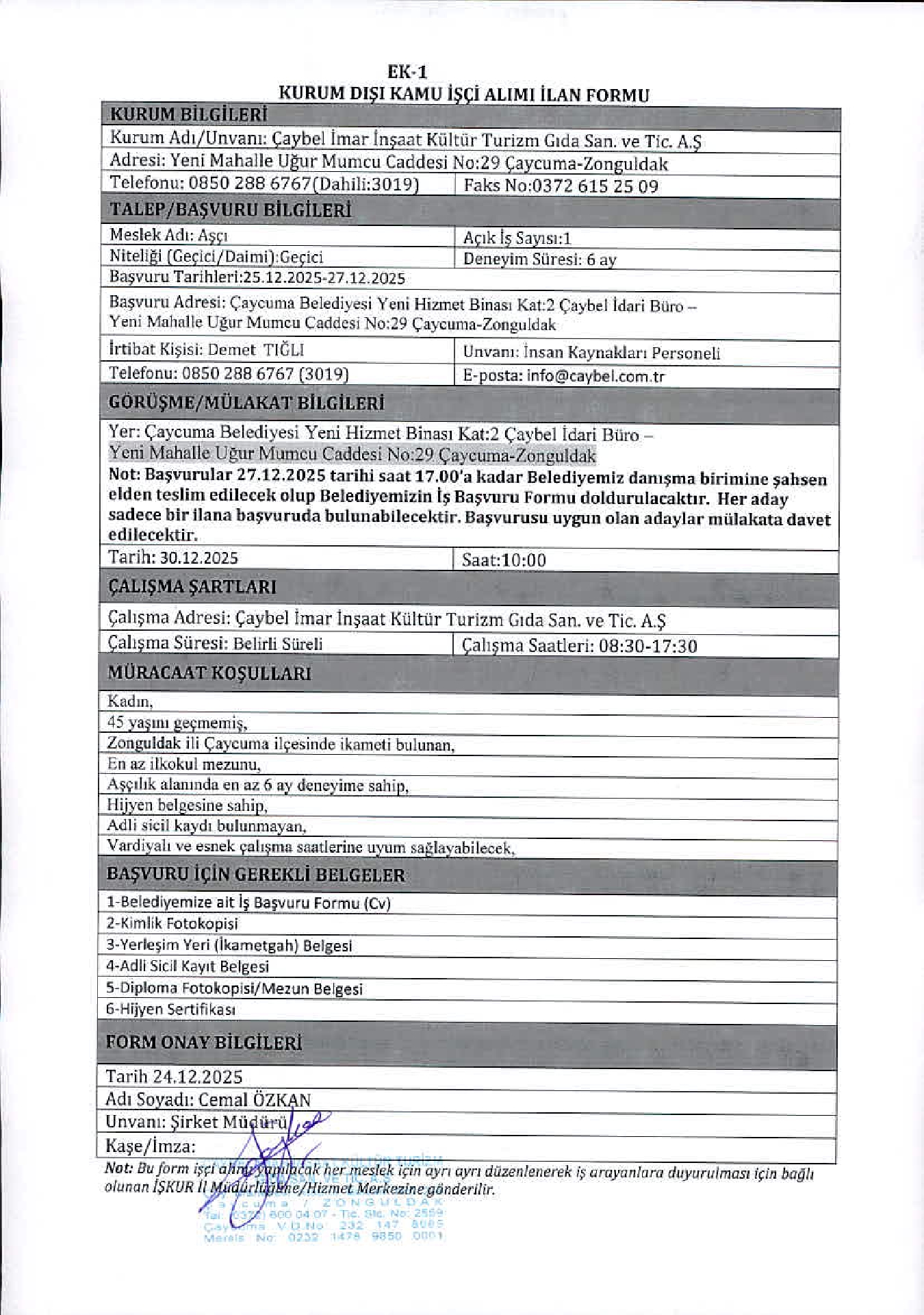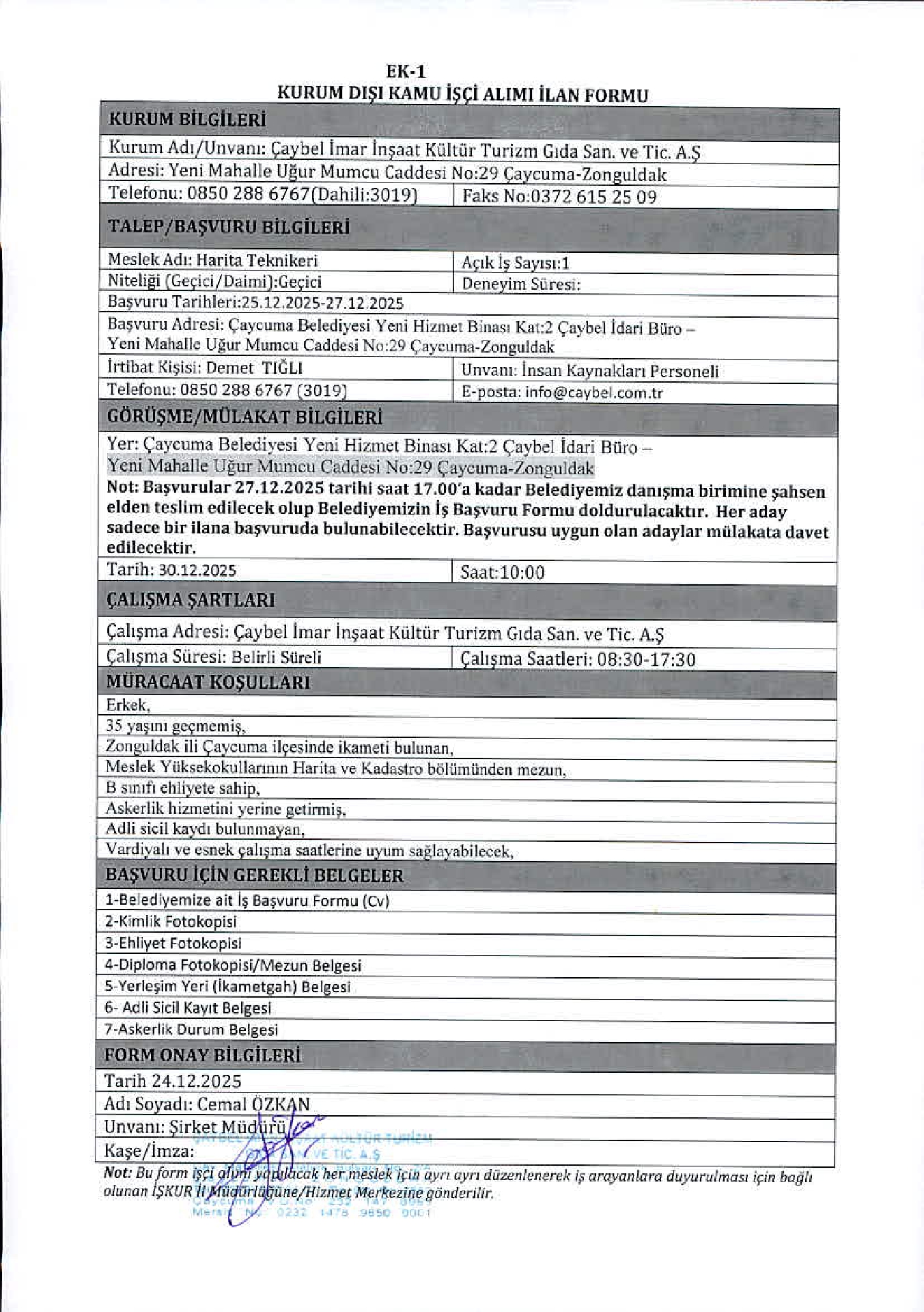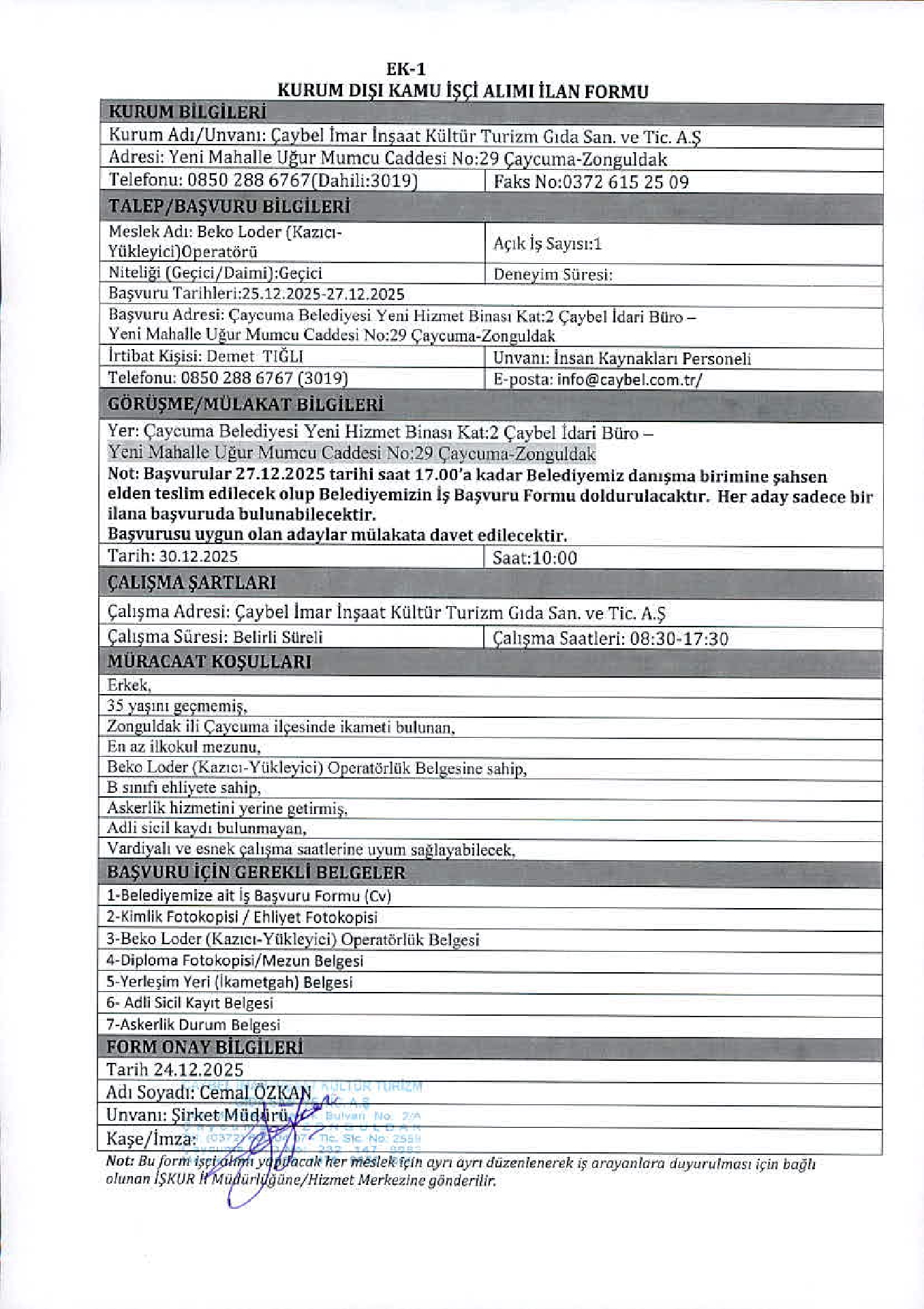Ana sayfaGeçici İşçi İlanları Zonguldak Çaybel İmar Geçici 14 İşçi Alacak Zonguldak Çaybel İmar Geçici 14 İşçi Alacak. Son başvuru tarihi 27 Aralık 2025 Kaynak : İşkur İlan Giriş : 25 Aralık 2025 00:48, Son Güncelleme : 25 Aralık 2025 02:02 Yazdır Yorumlar (0) Abone Ol