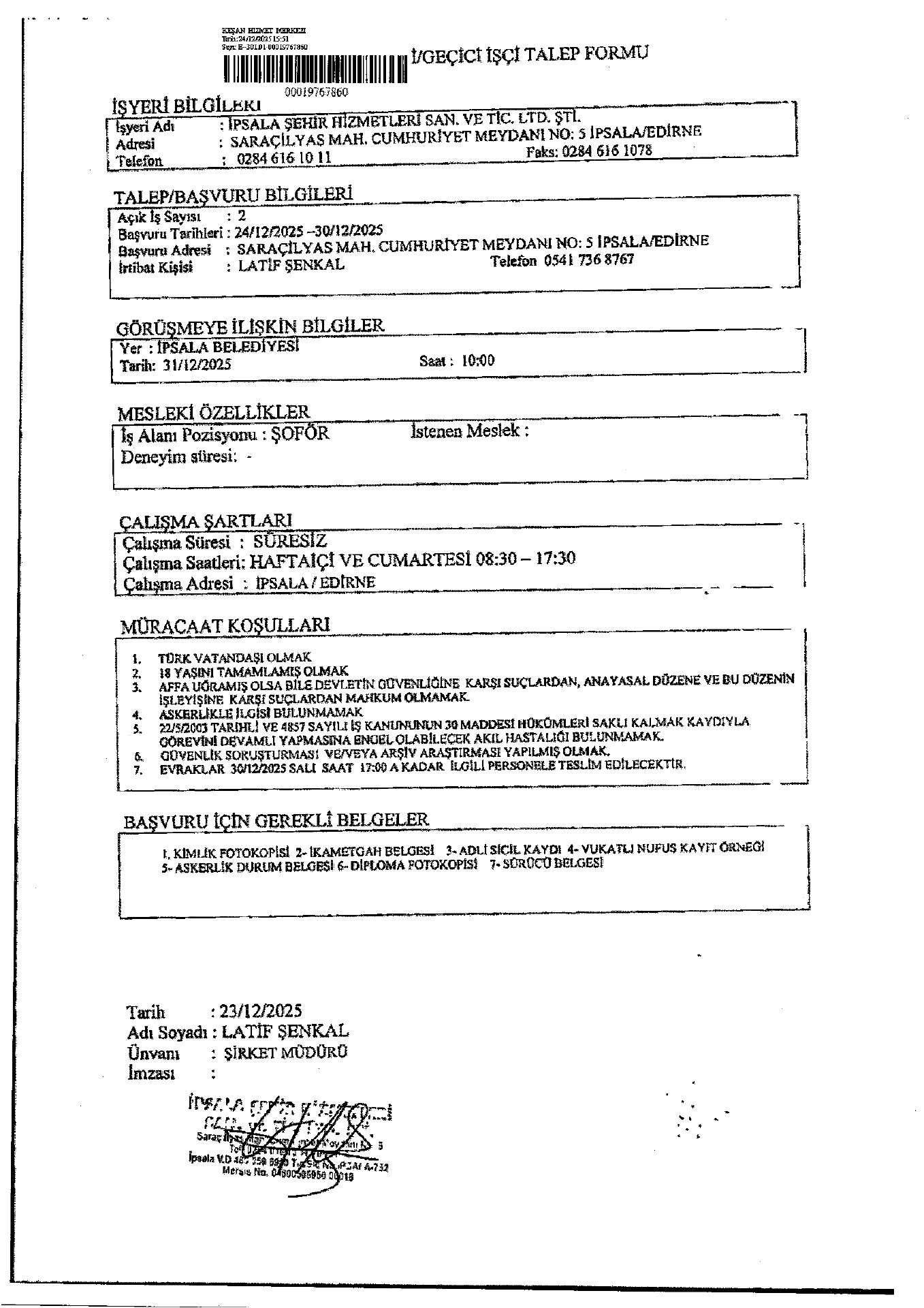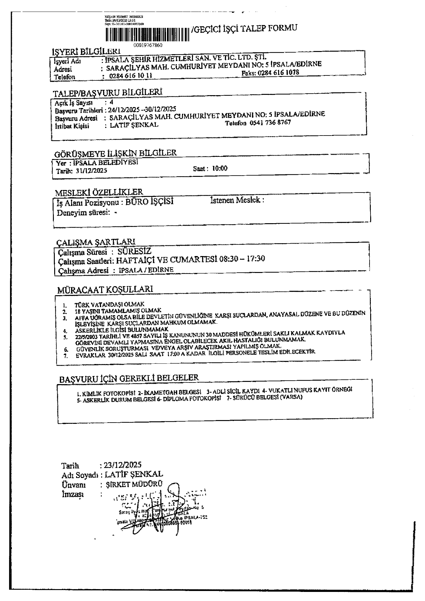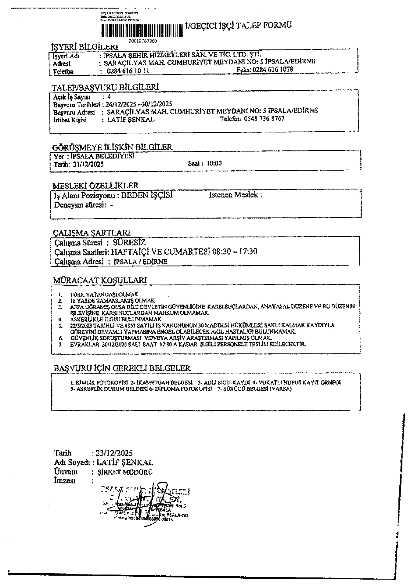 Ana sayfaDaimi İşçi İlanları Edirne İpsala Şehir Hizmetleri 10 İşçi Alacak Edirne İpsala Şehir Hizmetleri 10 İşçi Alacak. Son başvuru tarihi 30 Aralık 2025 Kaynak : İşkur İlan Giriş : 25 Aralık 2025 00:51, Son Güncelleme : 25 Aralık 2025 02:00 Yazdır Yorumlar (0) Abone Ol